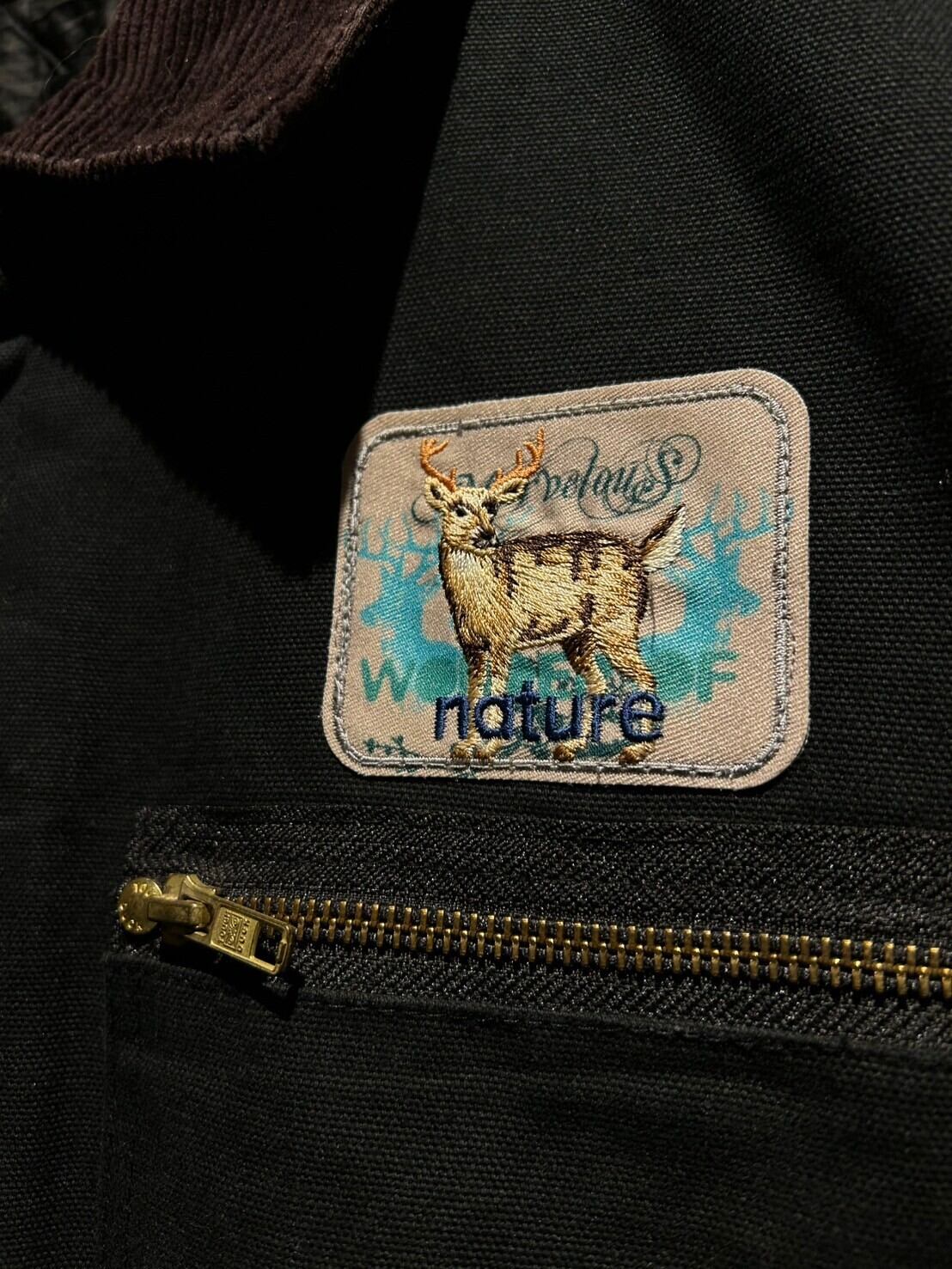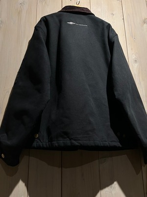ネイビーのタフかつコシのあるダック地を用いたジップアップのジャケット。左胸にはジップポケットにワッペンデザイン、両サイドにはスラッシュポケットを配したシンプルなデザインの1着。