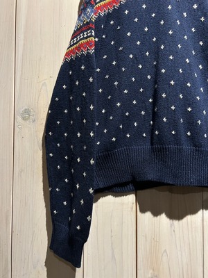 ネイビーをベースに、マルチカラーのノルディック柄と雪モチーフのドット柄を載せた1着。