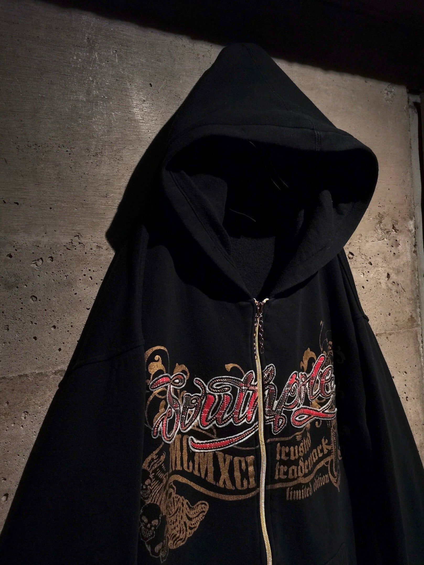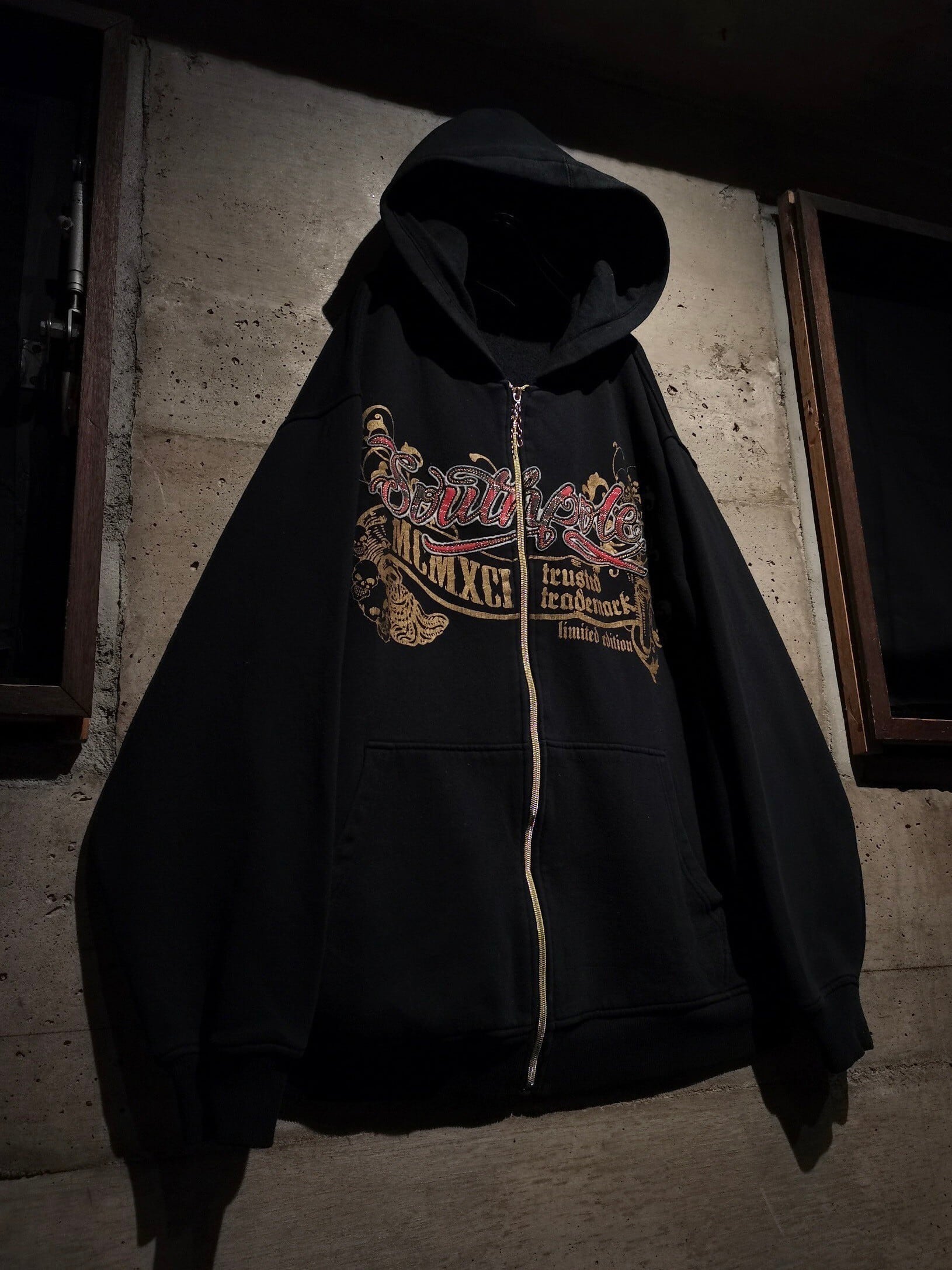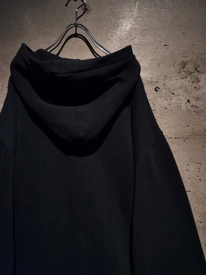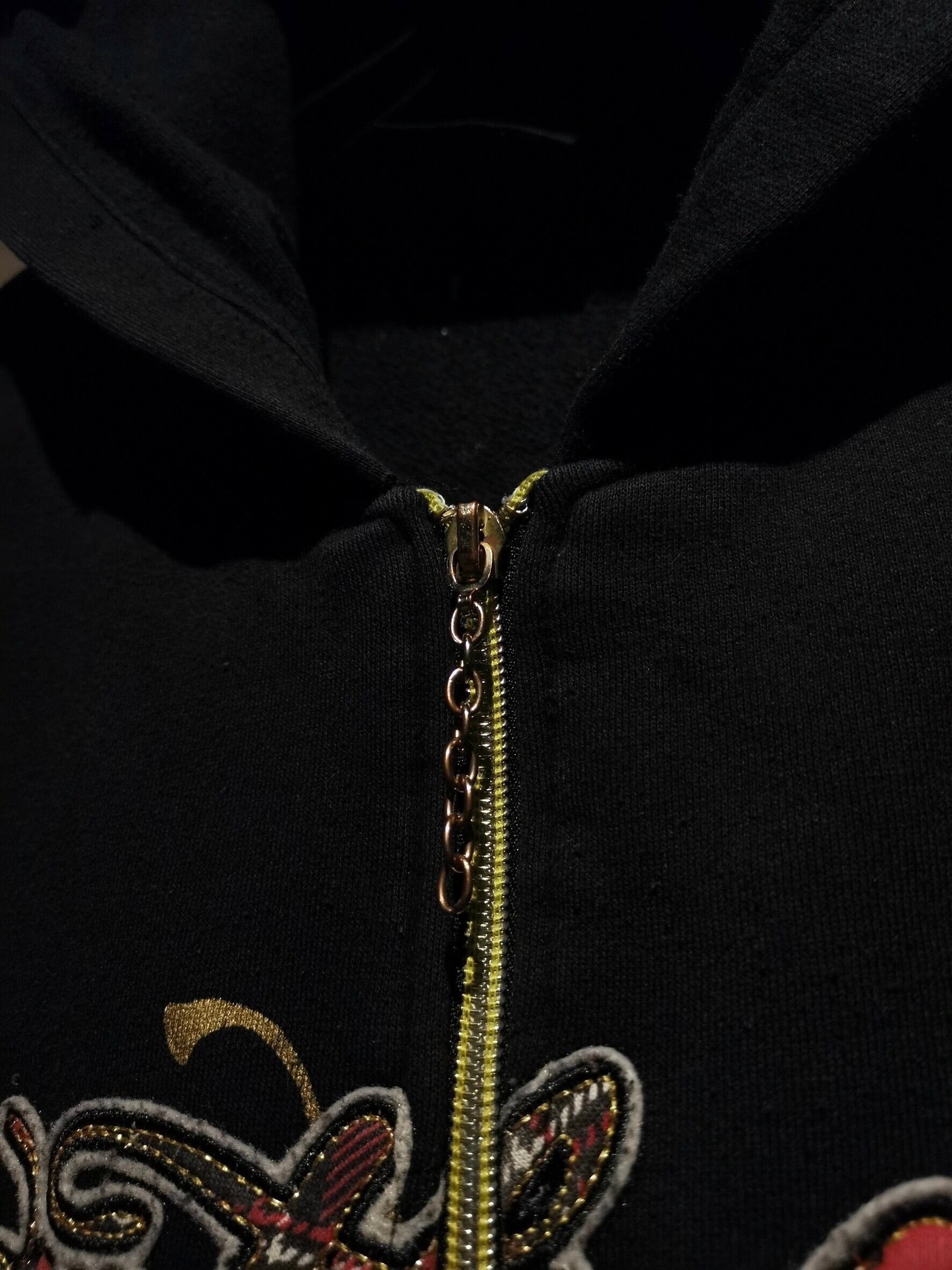 程よく肉厚なブラックのボディに、ネームロゴのパッチとブランドらしいプリントを載せたジップパーカー。
