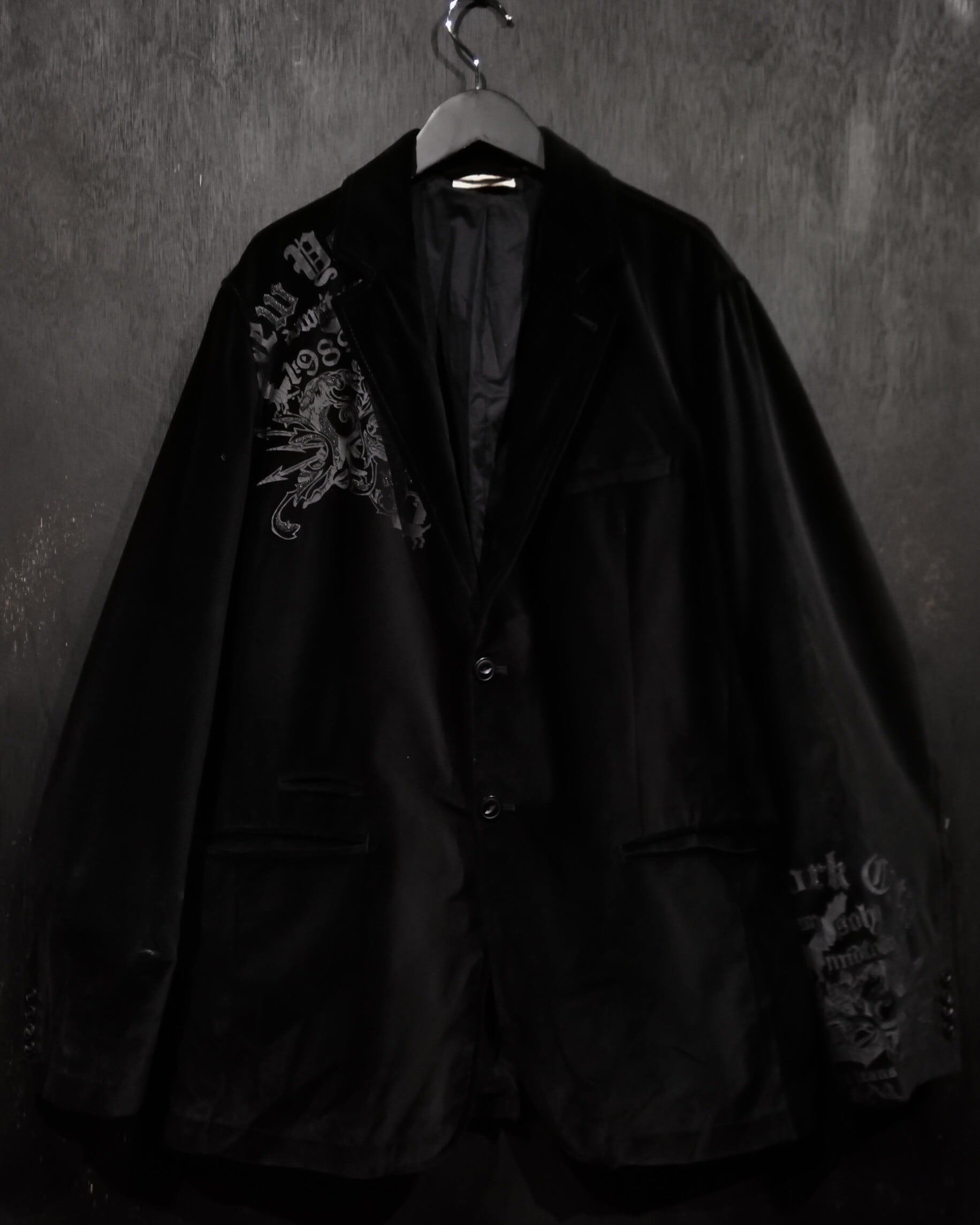 鈍く光沢を放つブラックベロアを用いたボディにゴシックなデザインを載せた、当店らしいフレーバーを纏ったテーラードジャケット。