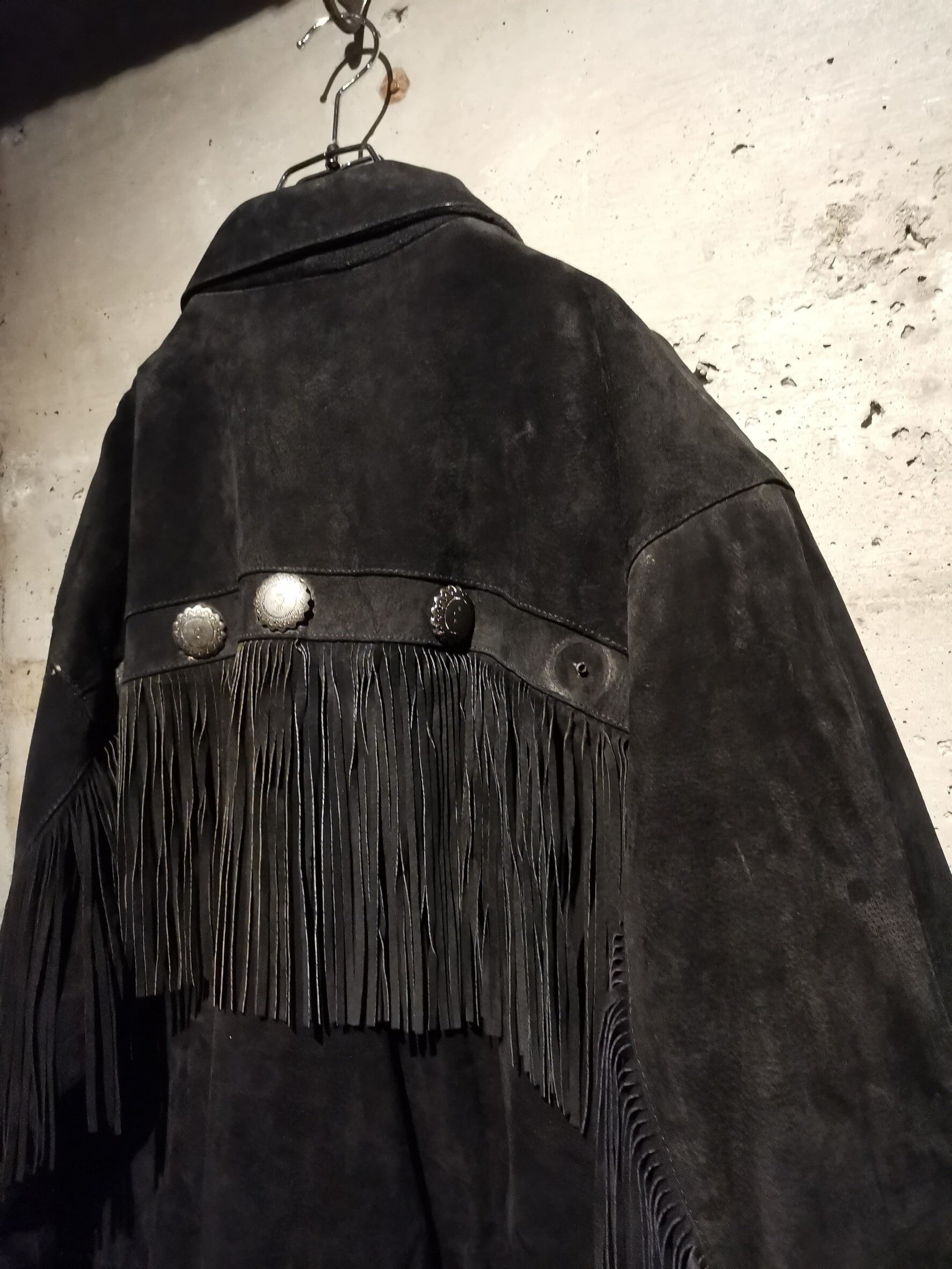しっとりとハリのあるスエードレザーを用いたボディに、鈍く光沢を放つコンチョボタン、フリンジの装飾を施した稀有なレザージャケット。