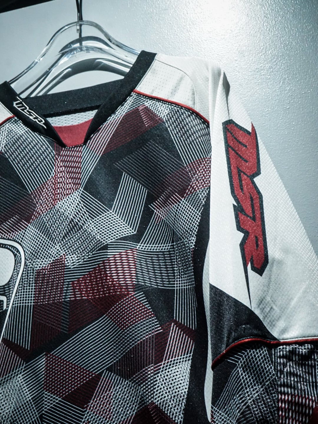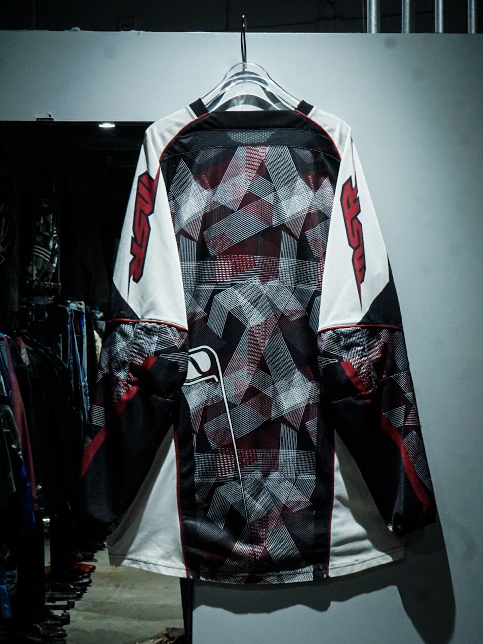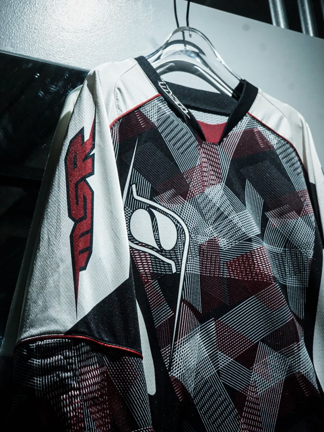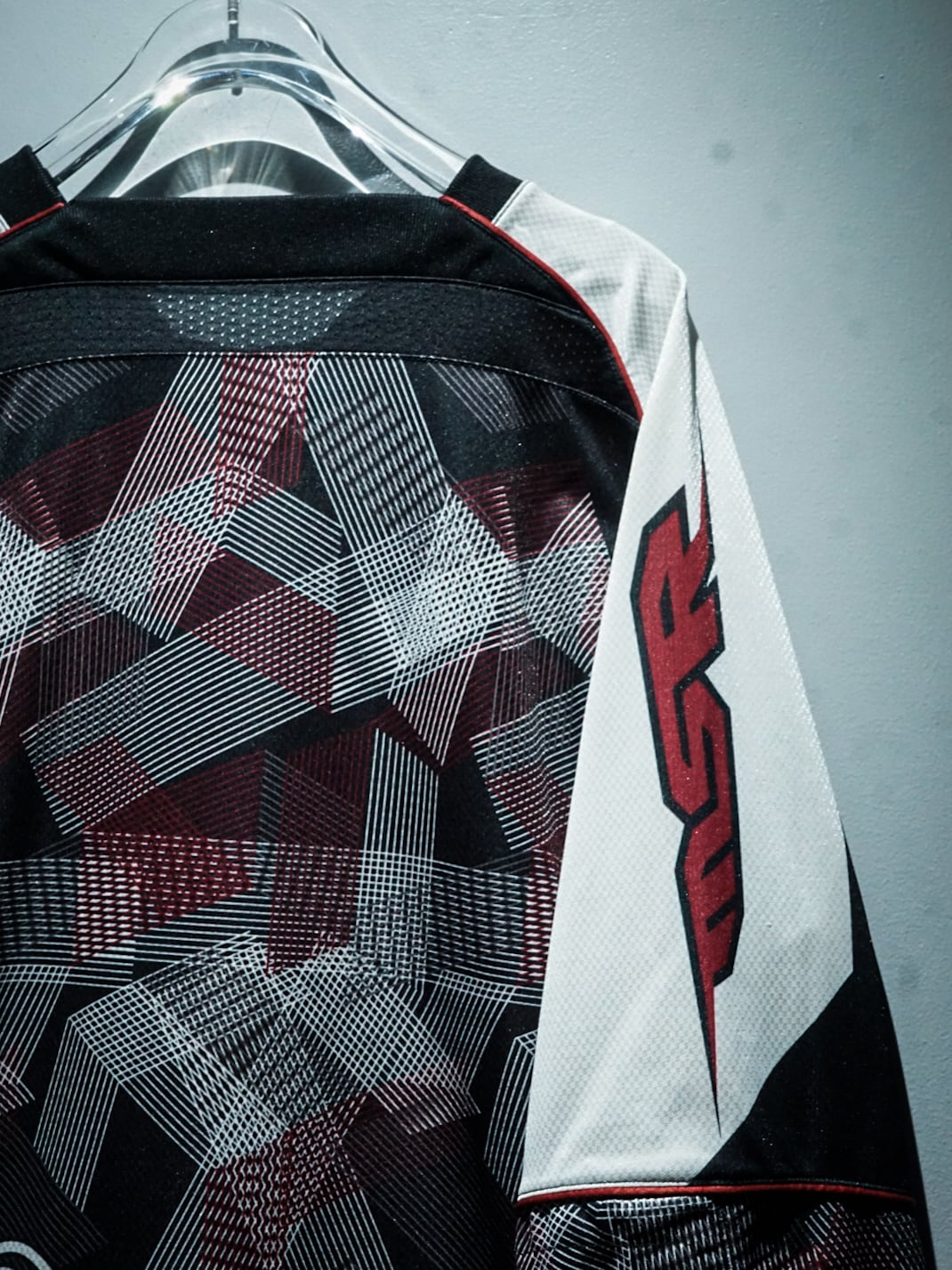 白×黒のモノトーンに赤を差し色にした幾何学調のデザインを載せ、テクニカルな切り替えを施したモトクロスシャツ。
