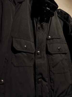 ハリのあるタフなブラックのボディに、ミリタリーをモチーフとしたポケットのギミック、エポレットを載せたジャケット。