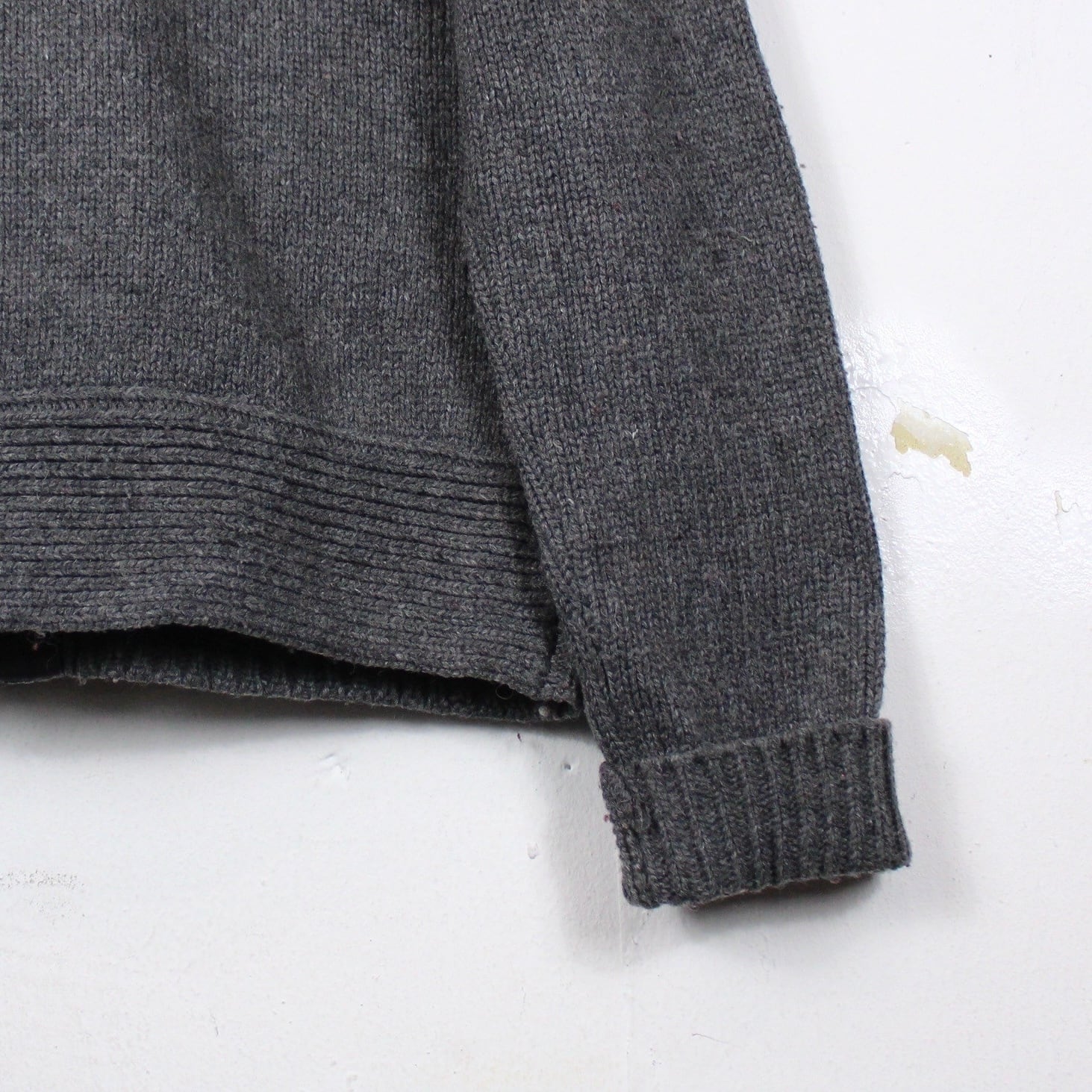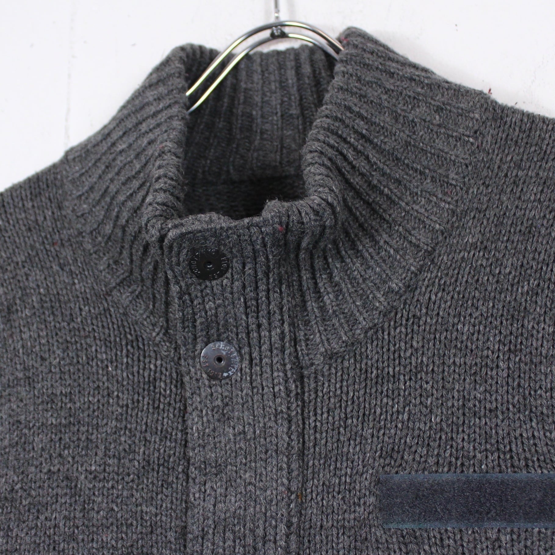 柔らかなグレーのニットボディに、ミリタリーをモチーフにしたギミックを載せたニットジャケット。