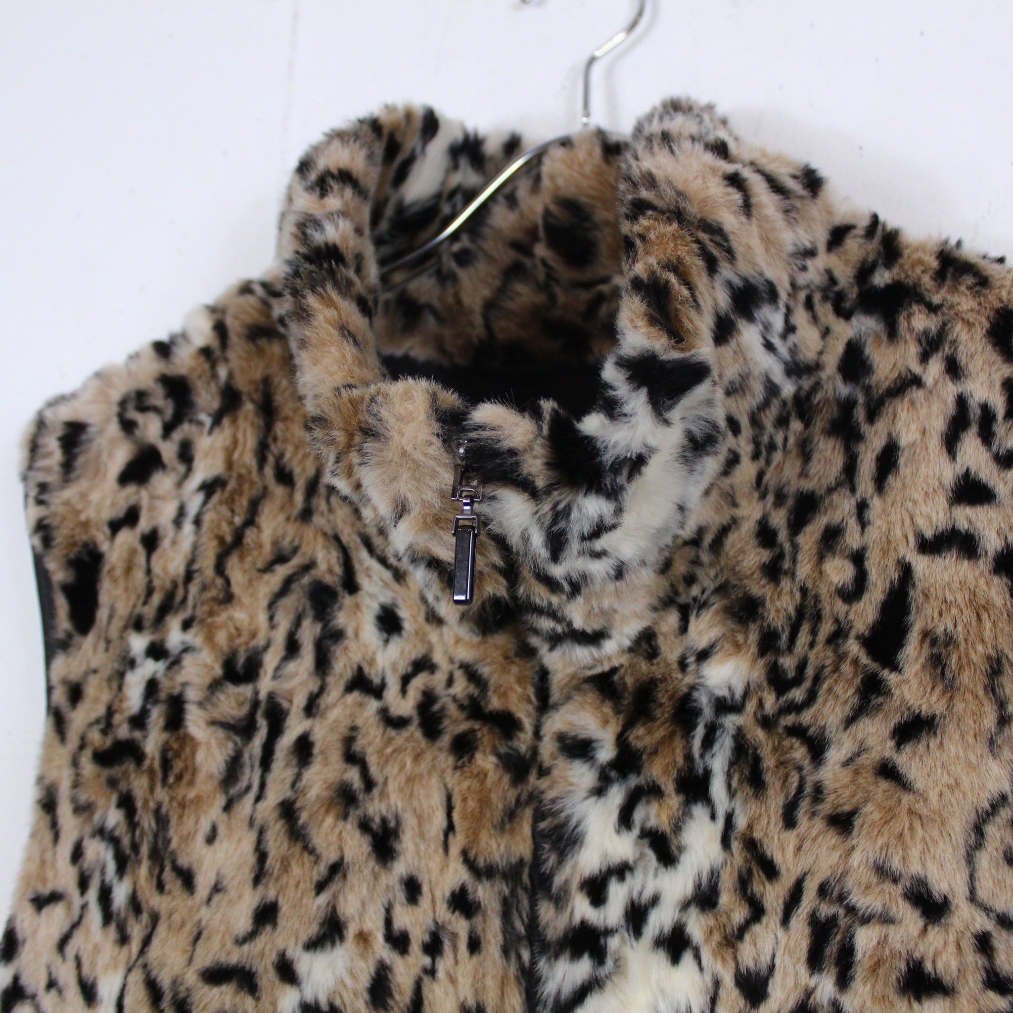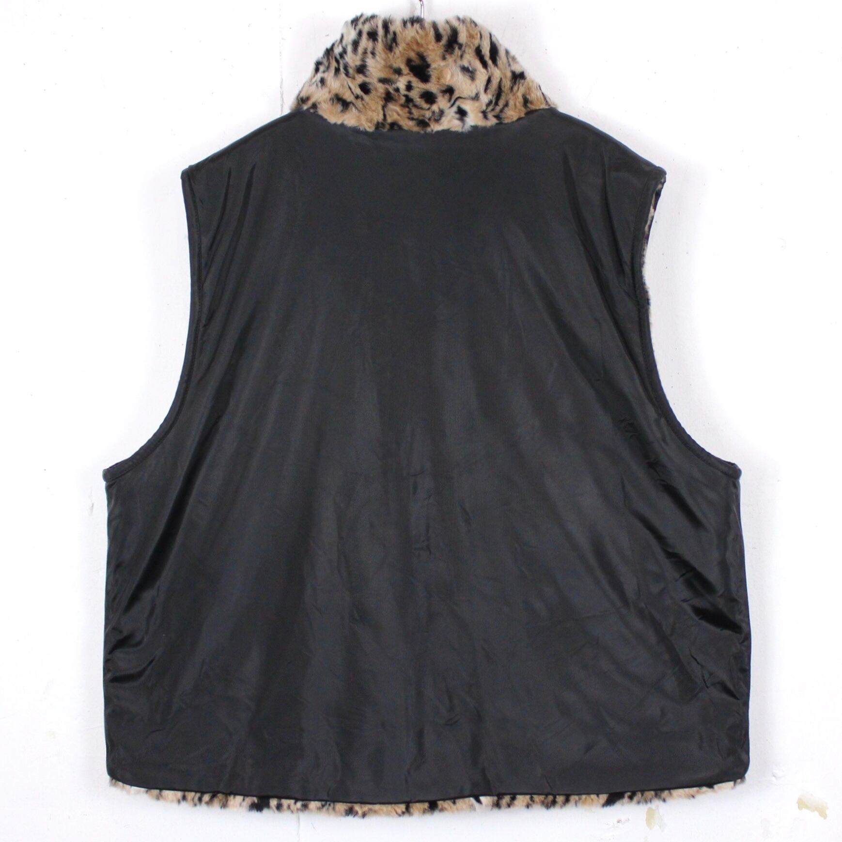 ふんわりと柔らかなファーを用いたボディに、アニマル柄を載せ、ガバッと裏返すとソリッドなポリエステル面へと切り替わるベスト。