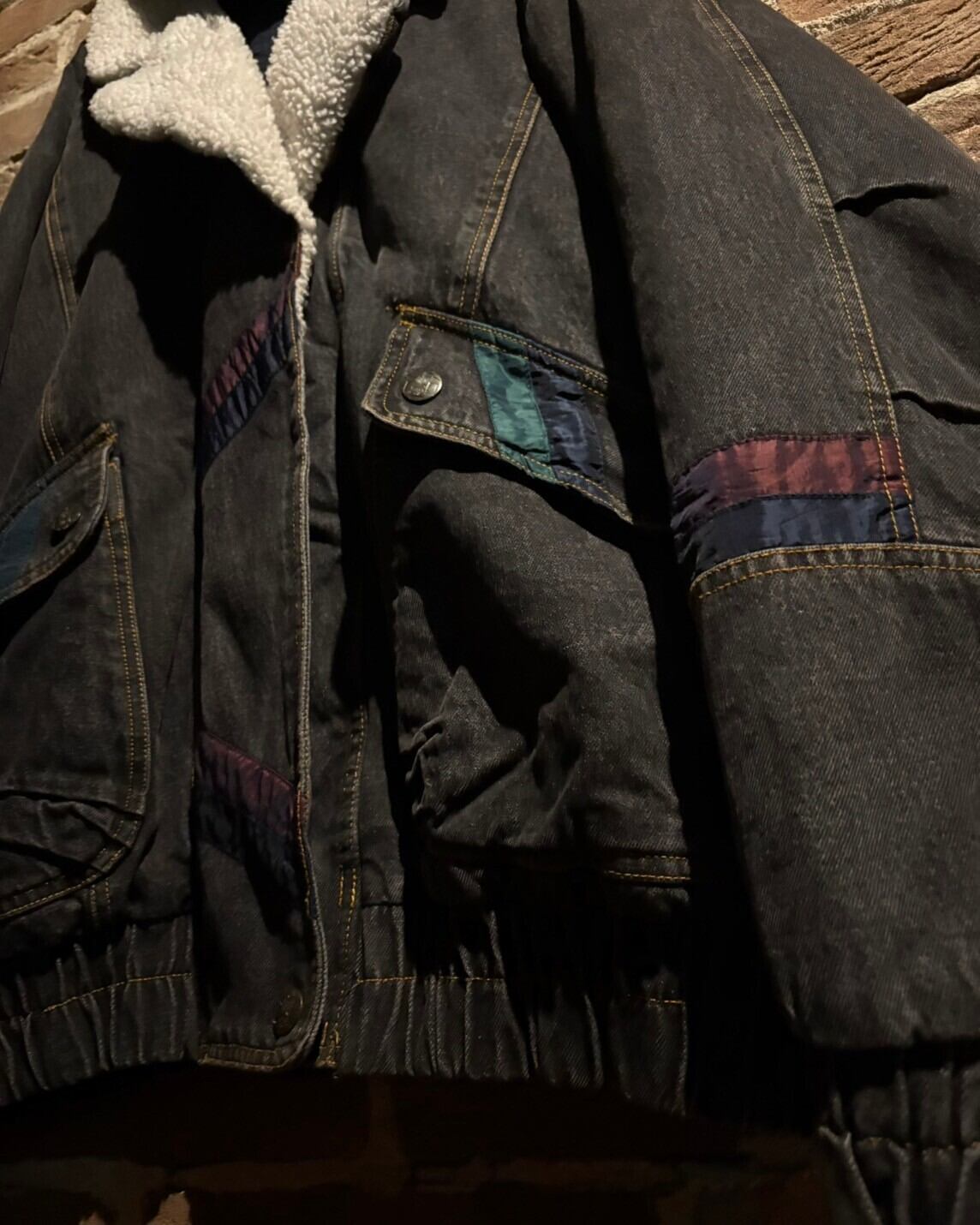 コシのあるブラックデニムを用いて、インナーにハイネックのアイテムを重ね着したような、レイヤード風のデザインに仕上げたジャケット。