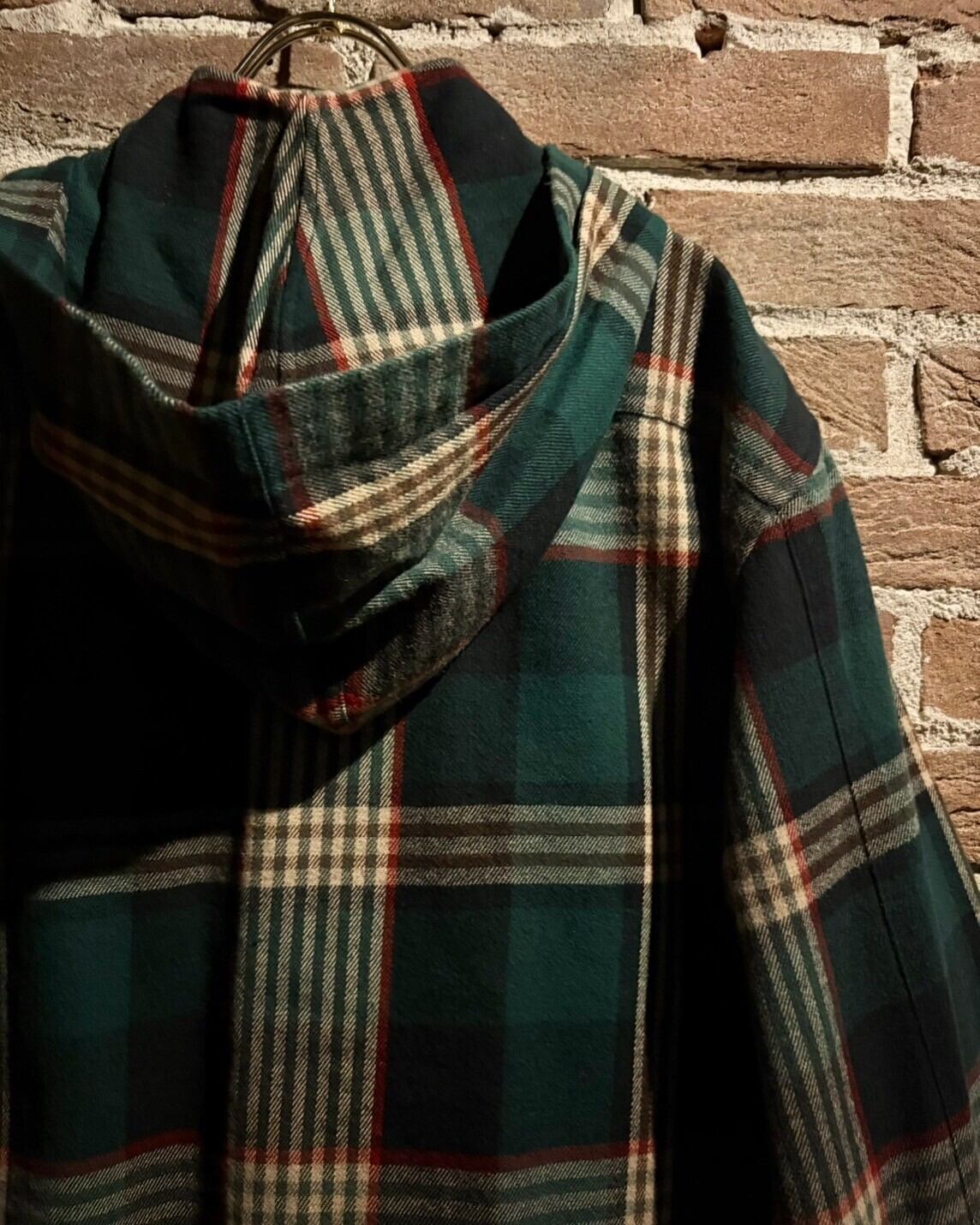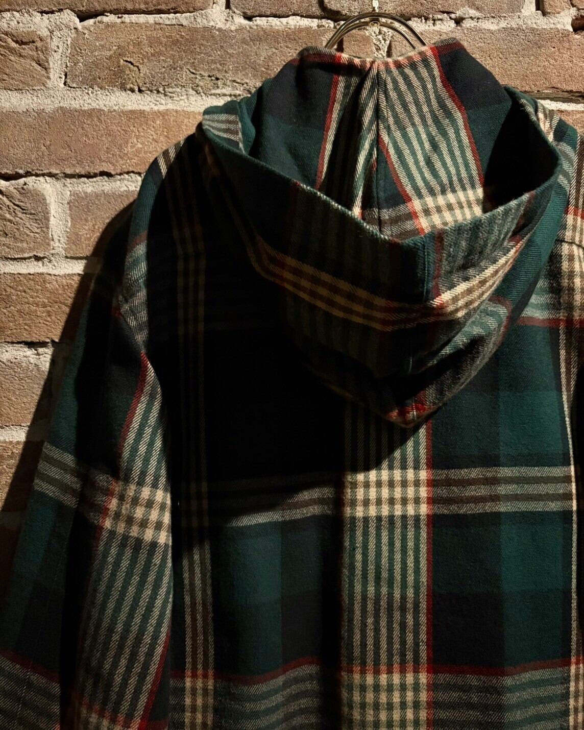 グリーンをベースに、ベージュ、赤でチェック柄を載せたジップアップフーディジャケット。