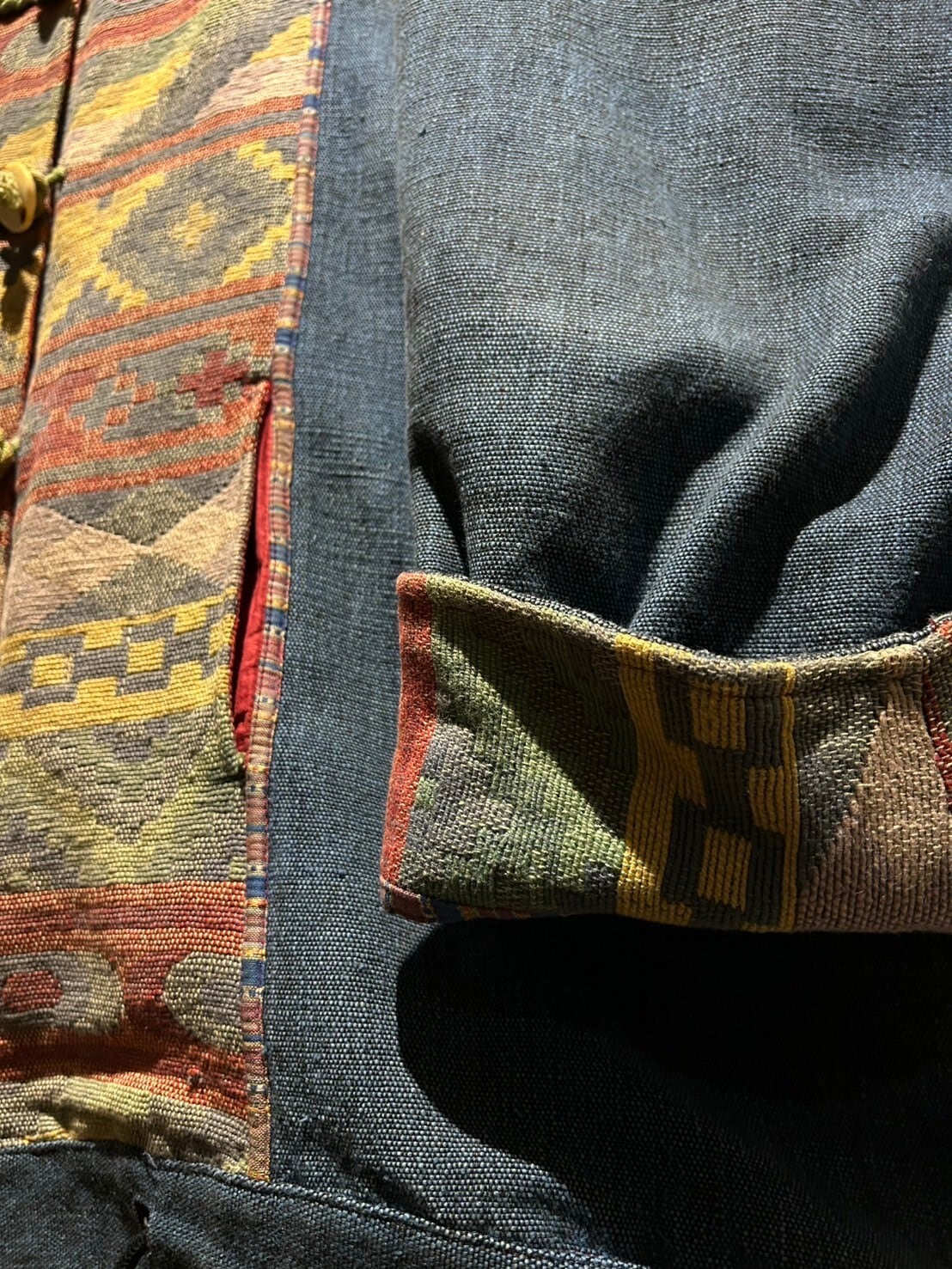 襟には摩耗に耐えうるコーデュロイが切り替えられ、温かみのあるデザインへと仕上げられています。