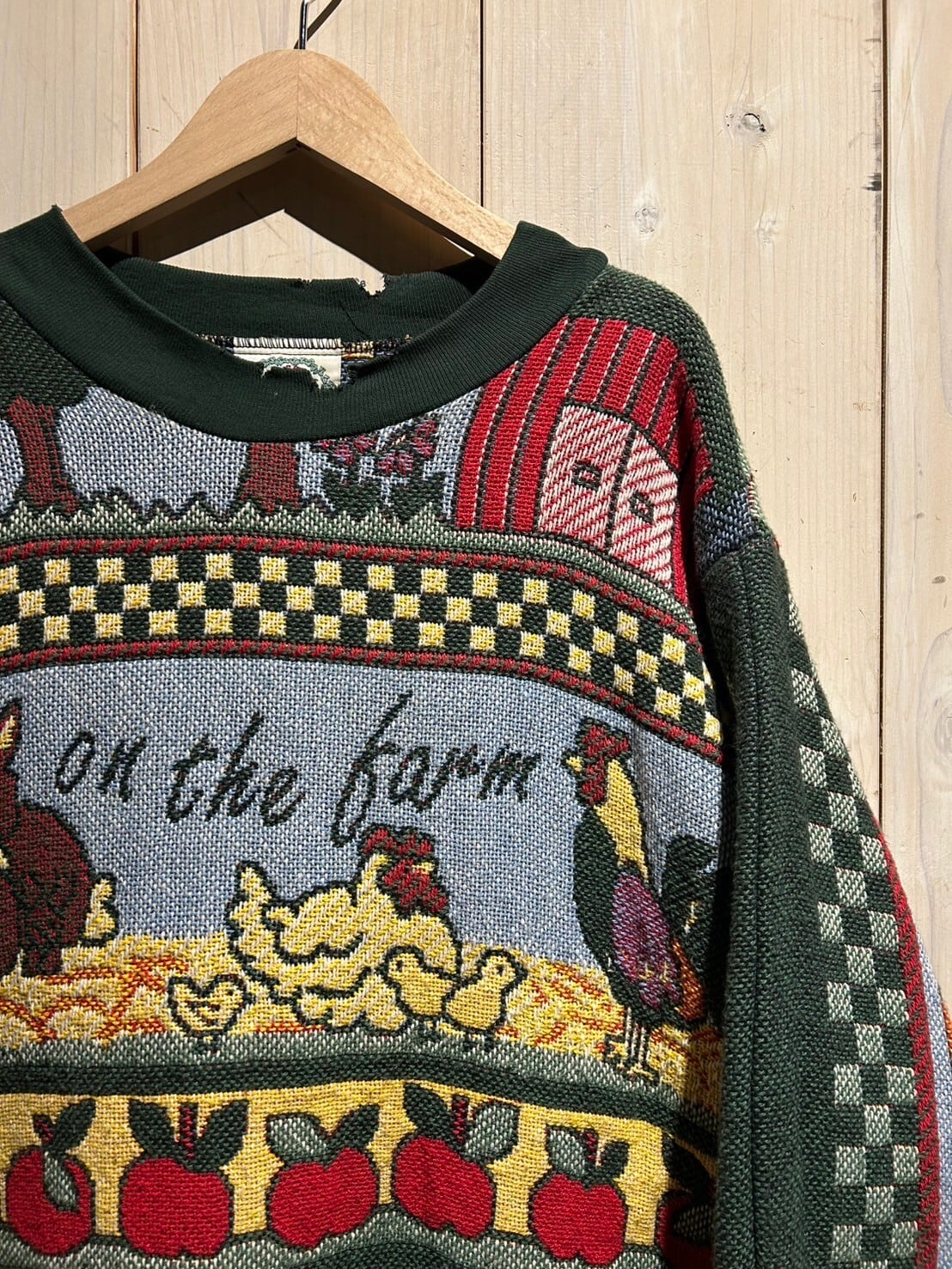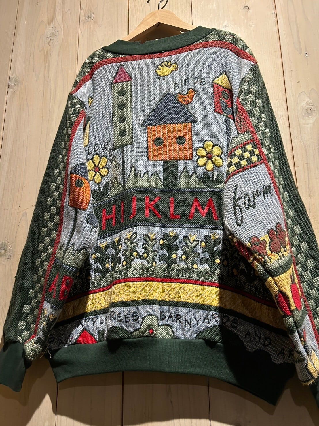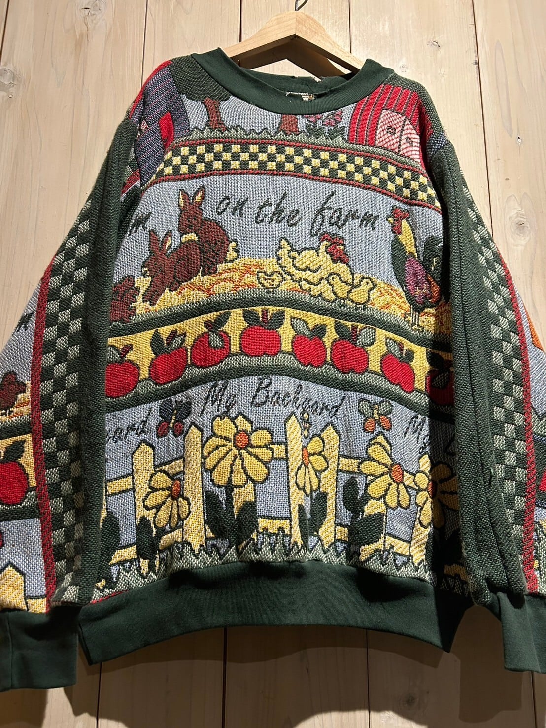 フロントには家、うさぎや鶏の親子、りんご、花園、蝶々、蜂を、バックには小鳥やとうもろこしのお花をデザインとして落とし込んだ、レトロなゴブランプルオーバー。