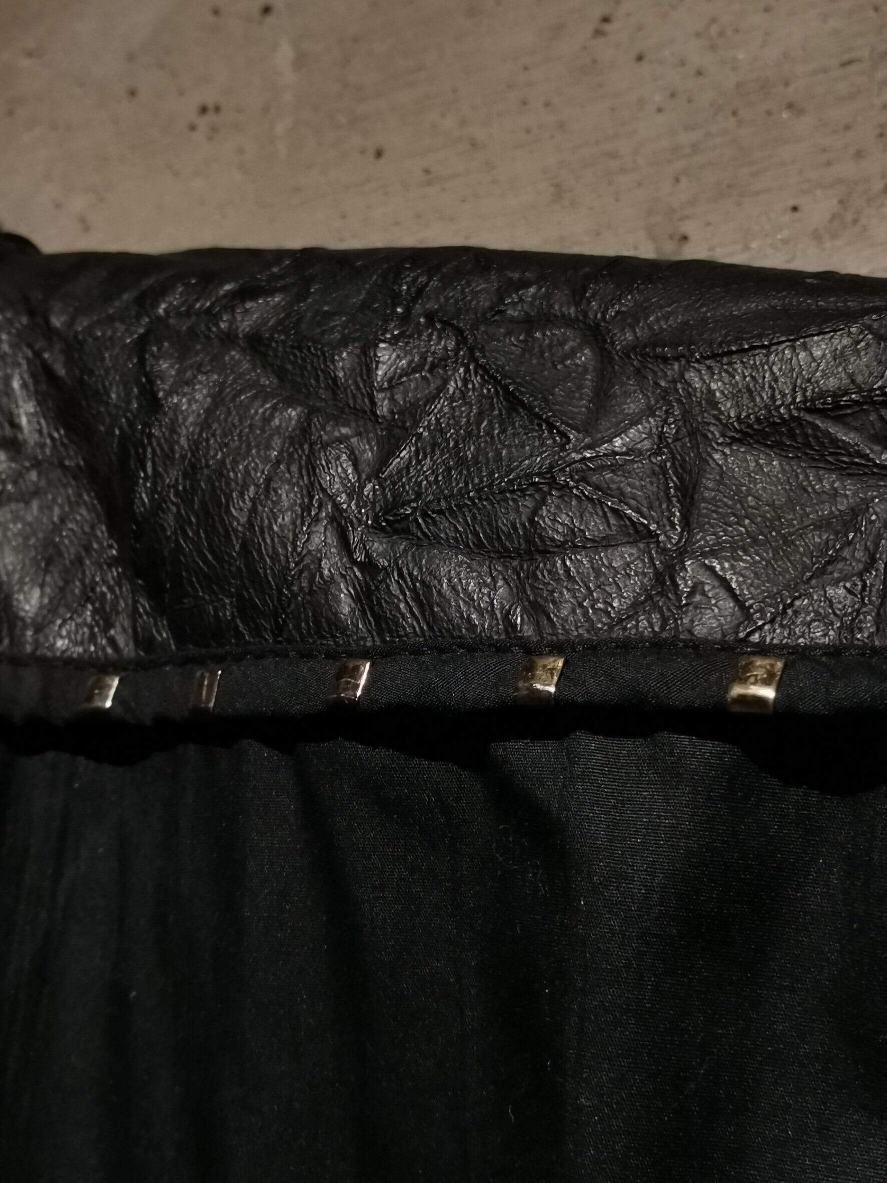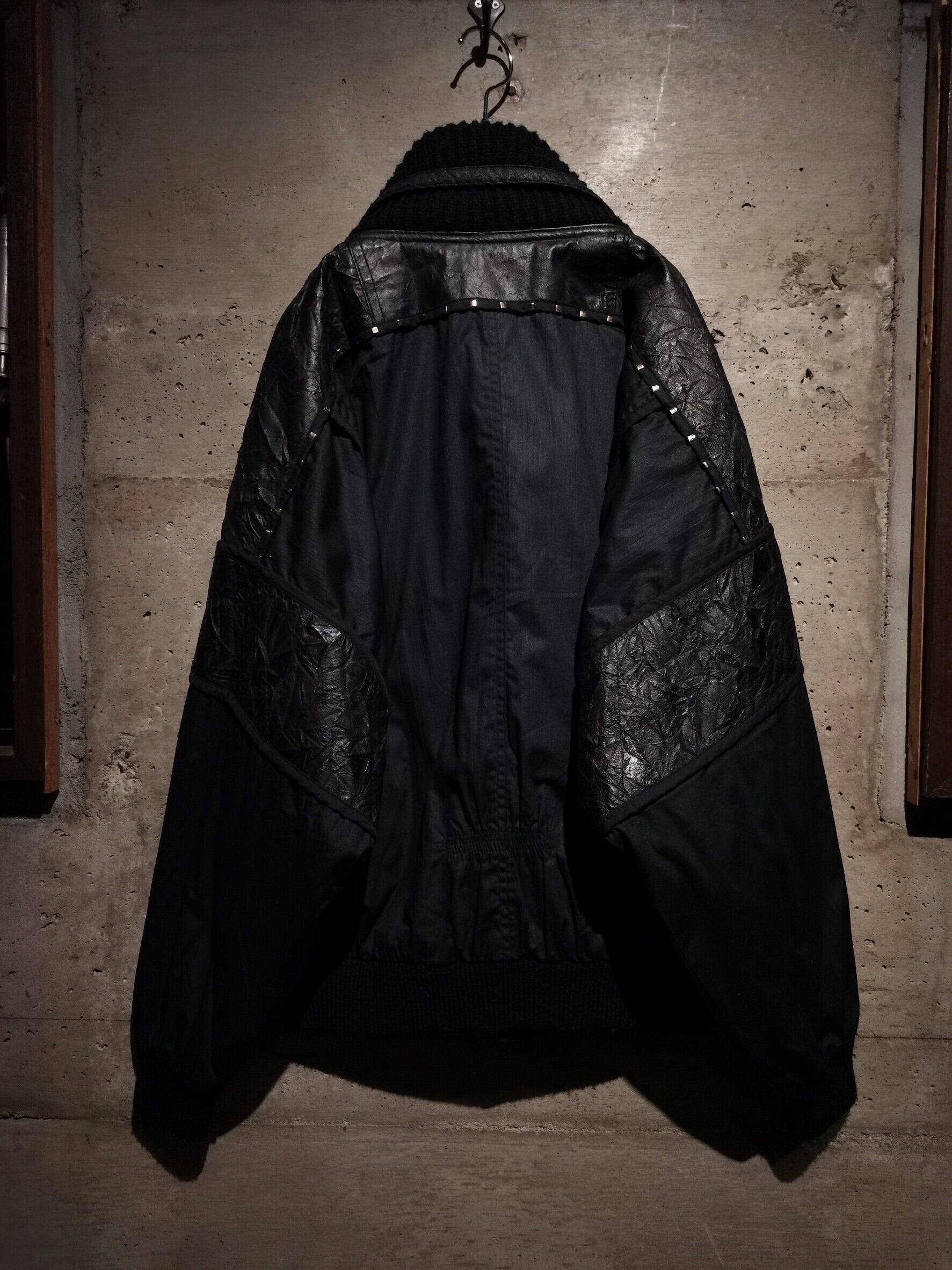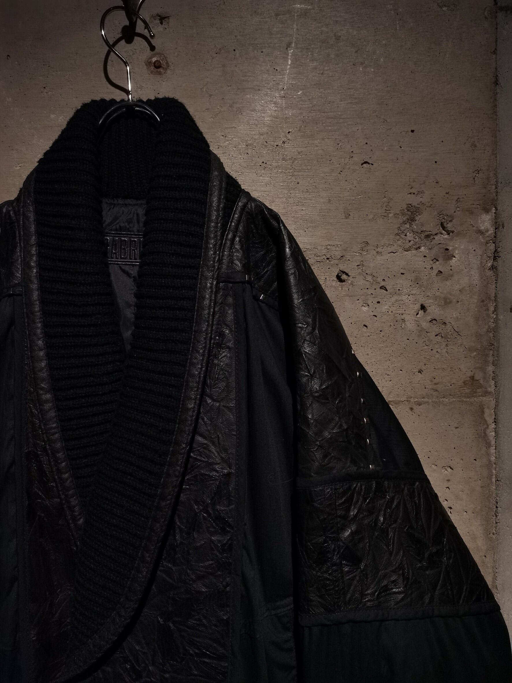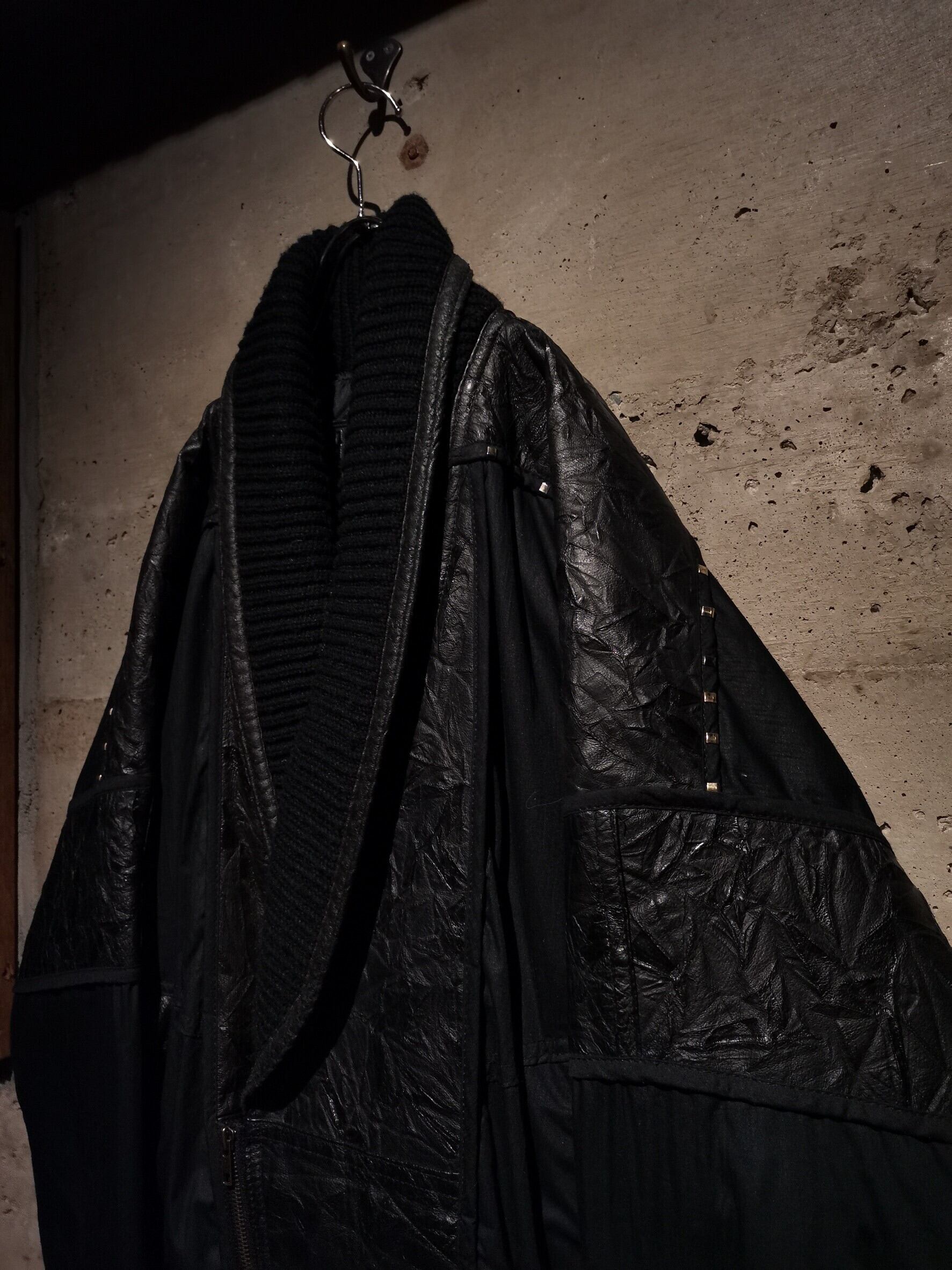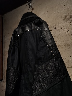 切り替えのデザインに加え、肩周りにはシルバーのスタッズの装飾をスタッズをON。ショールカラーの襟にはニットを採用し、オールブラックで纏め上げながらも、立体的な見栄えを誇るデザインへと仕上げられています。