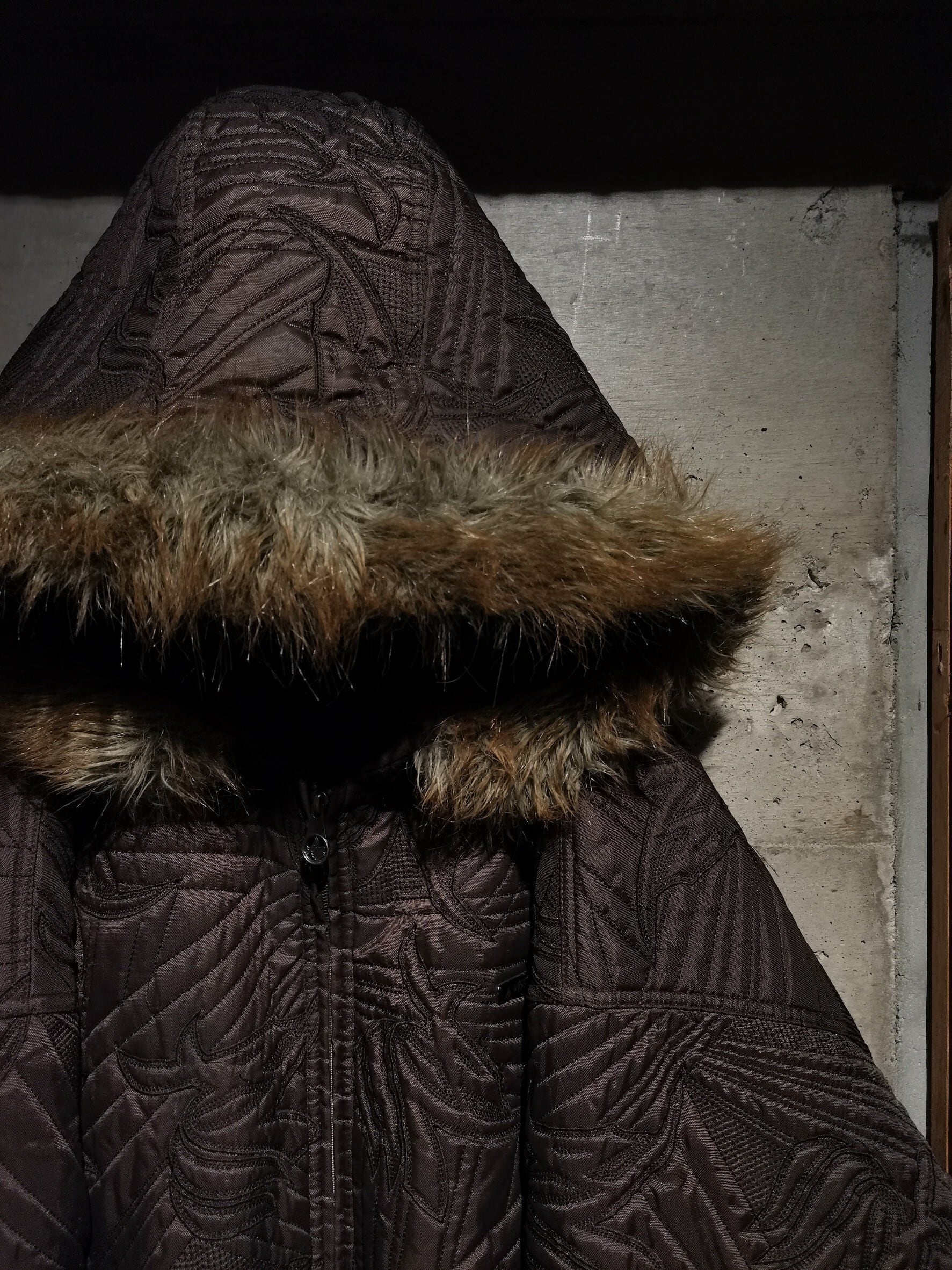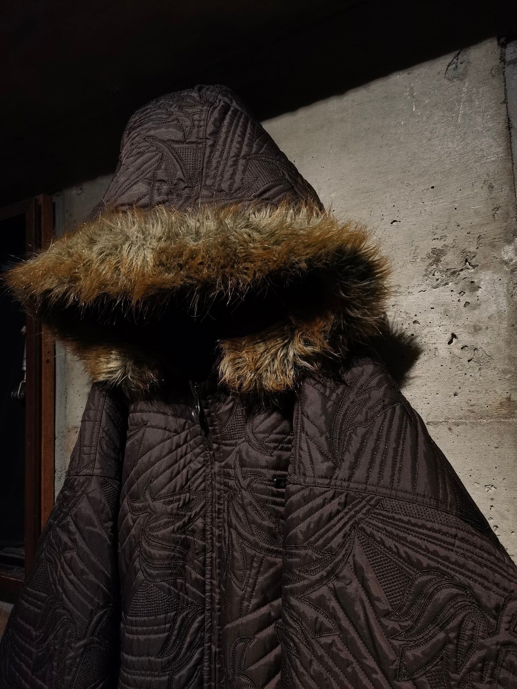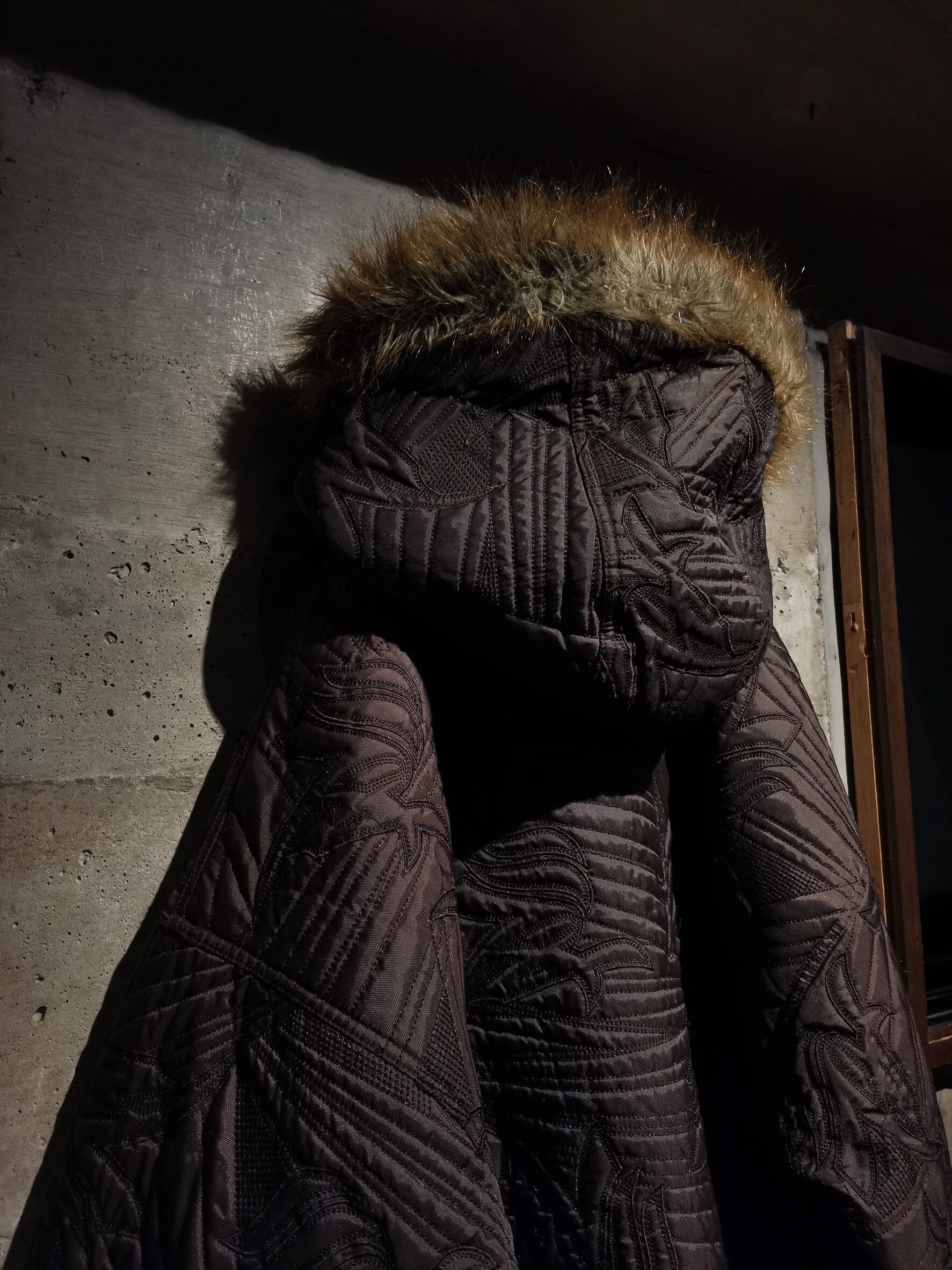 深いブラウンのナイロンボディに、当ブランド特有の緻密なステッチワークによって縦横無尽に走るステッチとブランドロゴを全面に刻み込んだ1着。