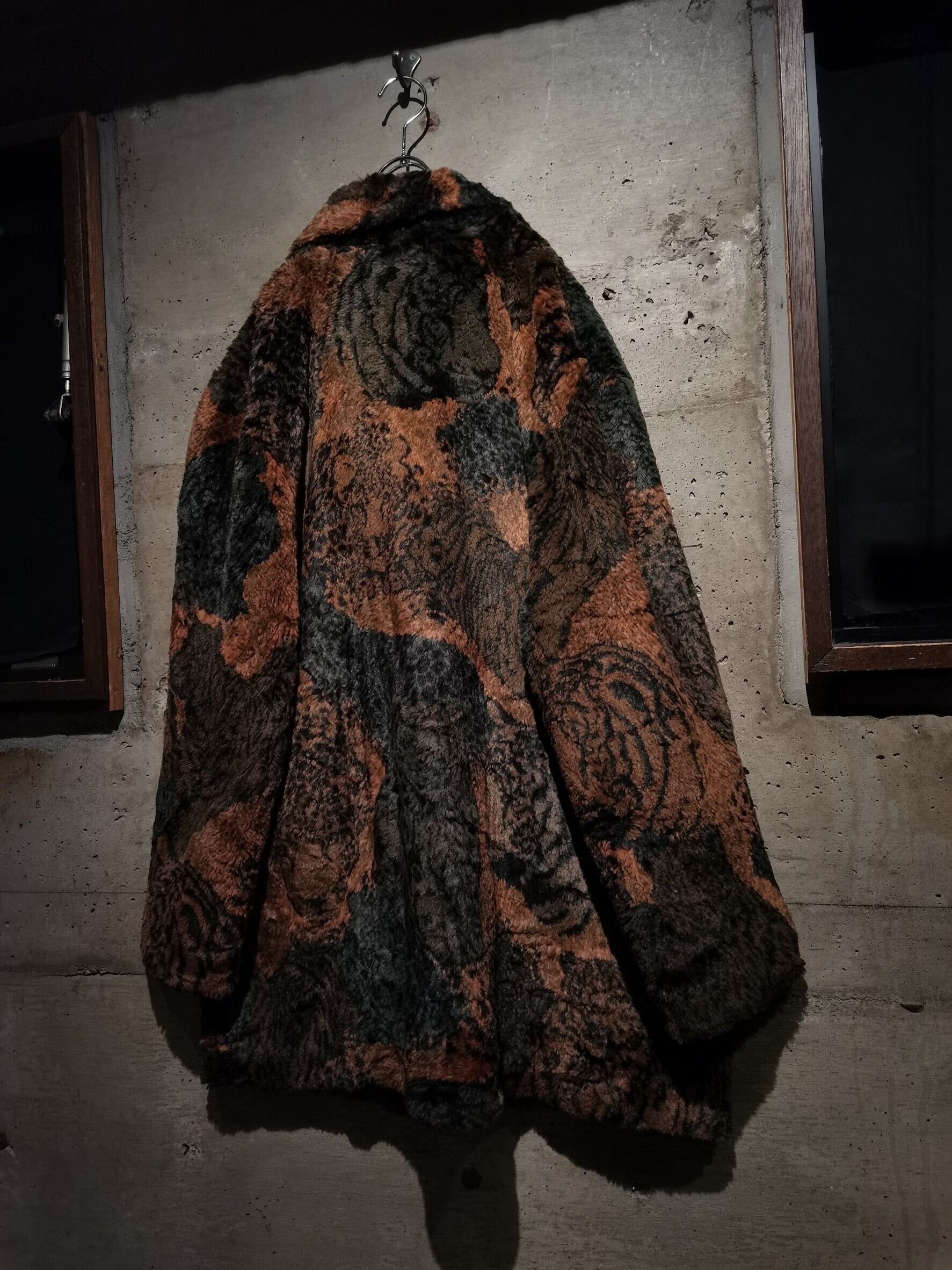 柔らかくふんわりとしたモッフモフの毛並みに、モードな印象が漂うブラウン×グリーンのカラーリングをベースに虎や彪のデザインを全面に落とし込んだファーコート。