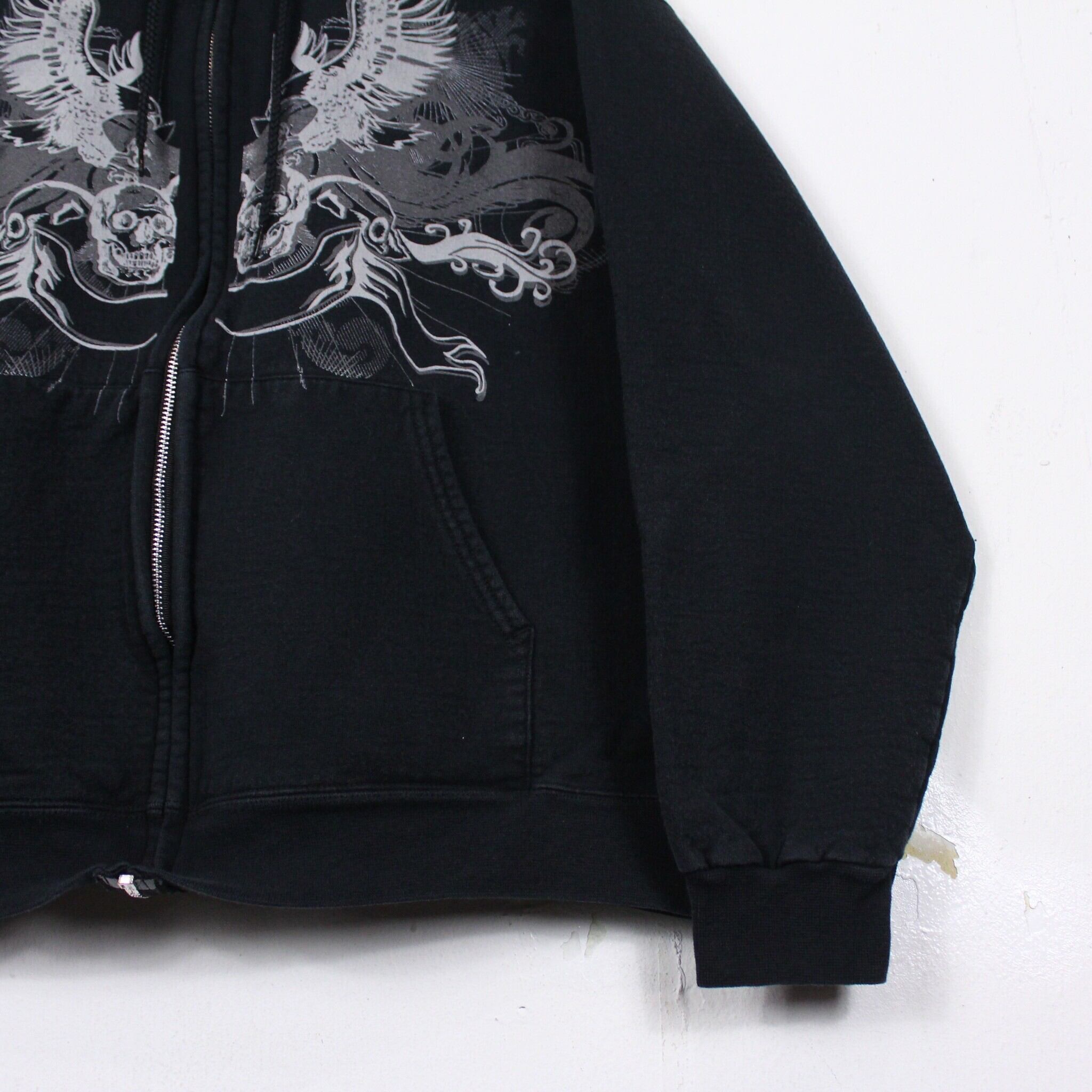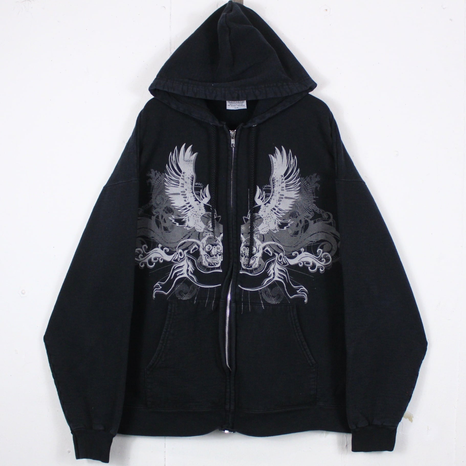 ブラックのスウェット地のボディに、ダークな雰囲気漂うスカルにワシ、ゴシック調の柄をプリントしたジップフーディー。