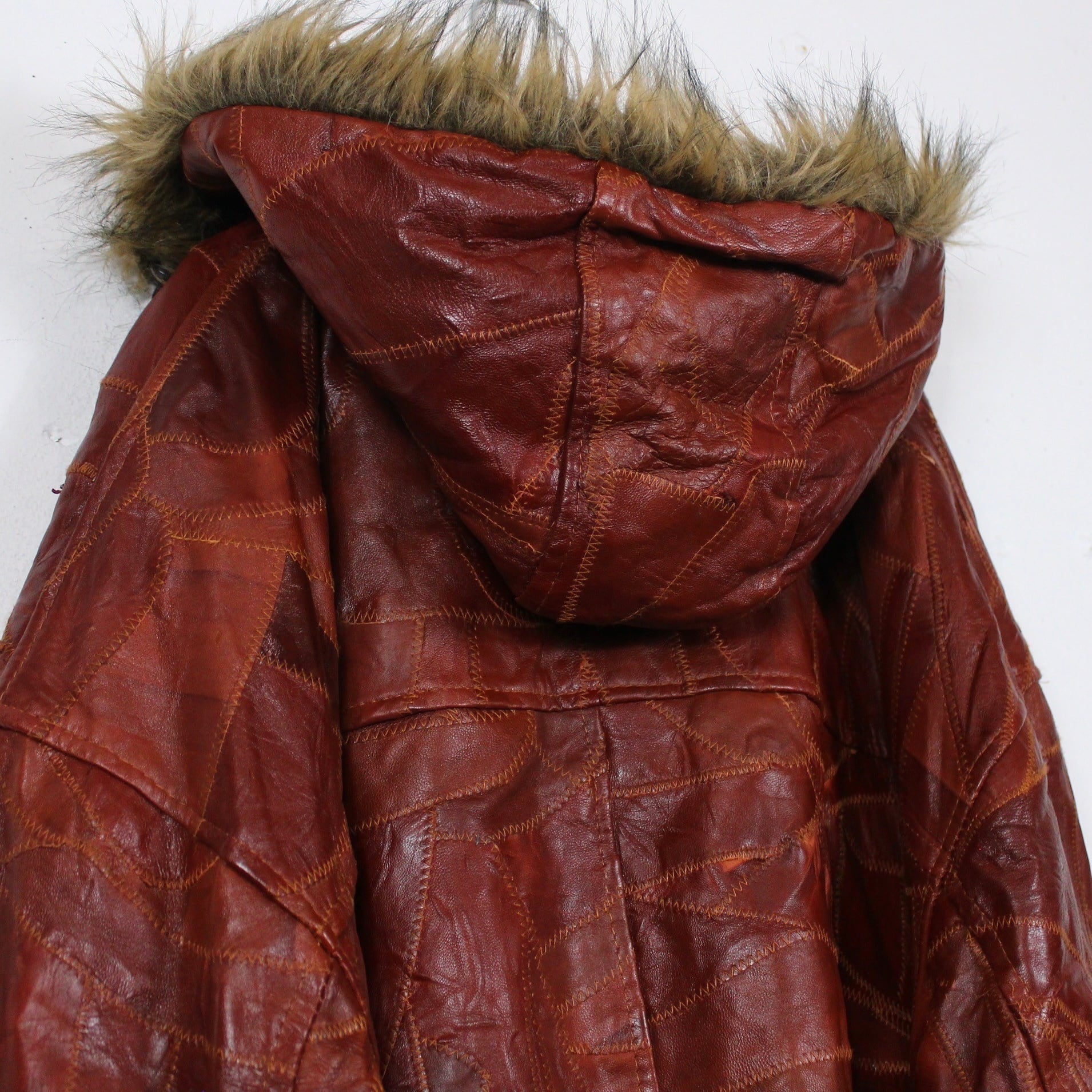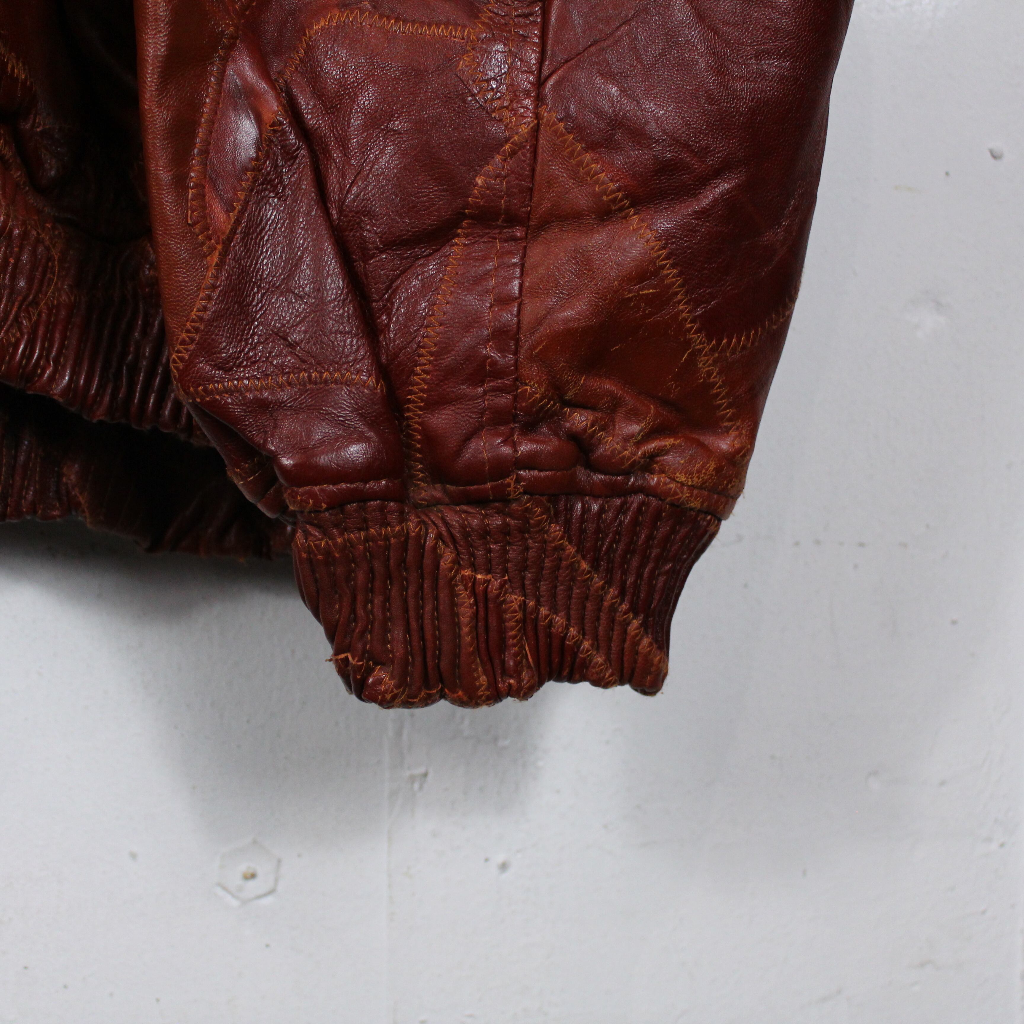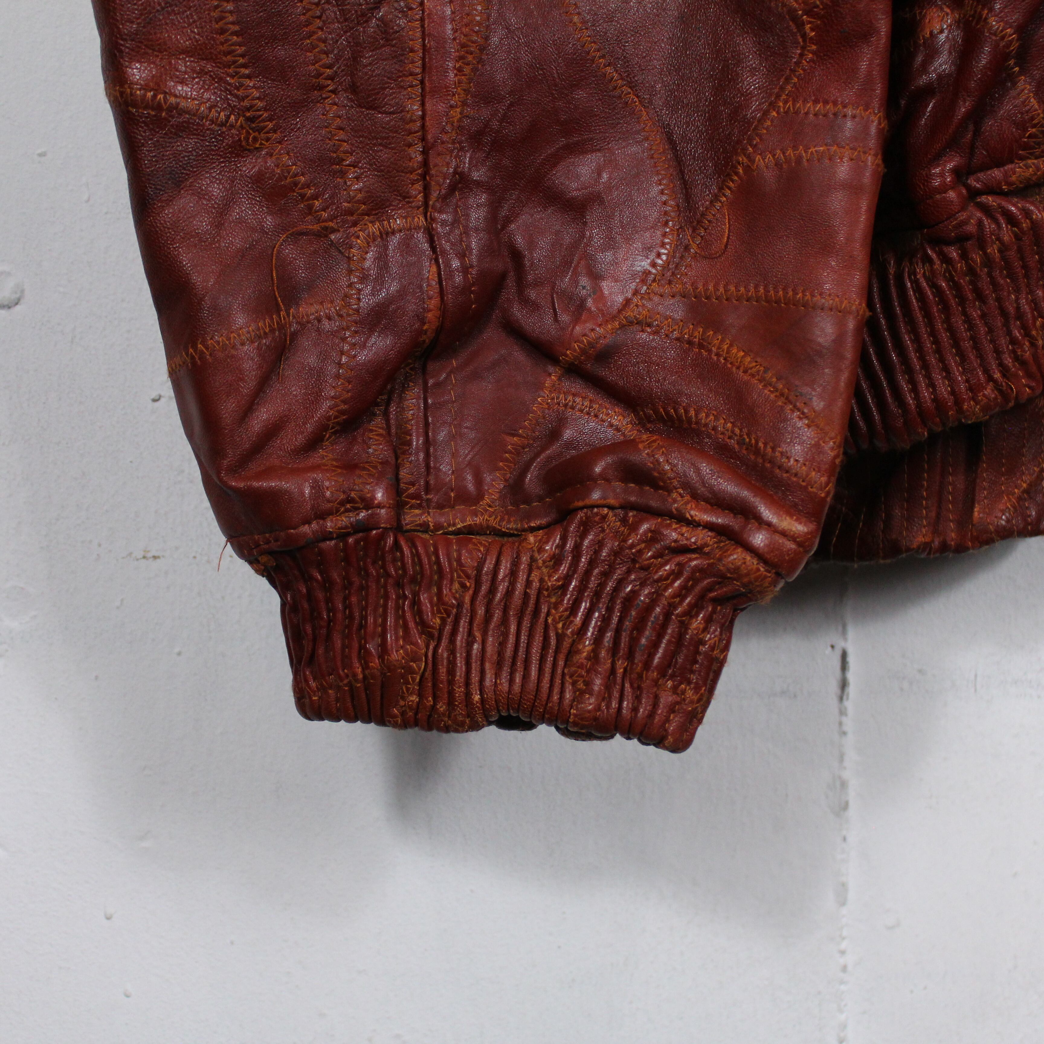 深く濃い赤茶で統一された極上のレザーを幾重にも重なるツギハギ調のパッチワークで仕上げられたスペシャルな逸品。モチモチでしっとりとしたレザーから放たれる上品な雰囲気には袖を通さずとも魅了されてしまいそうです。