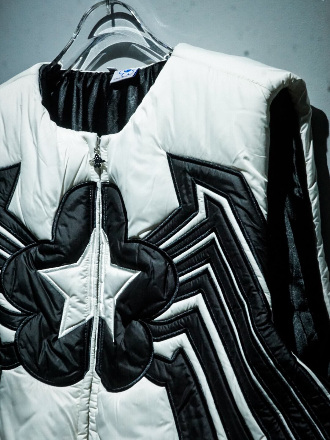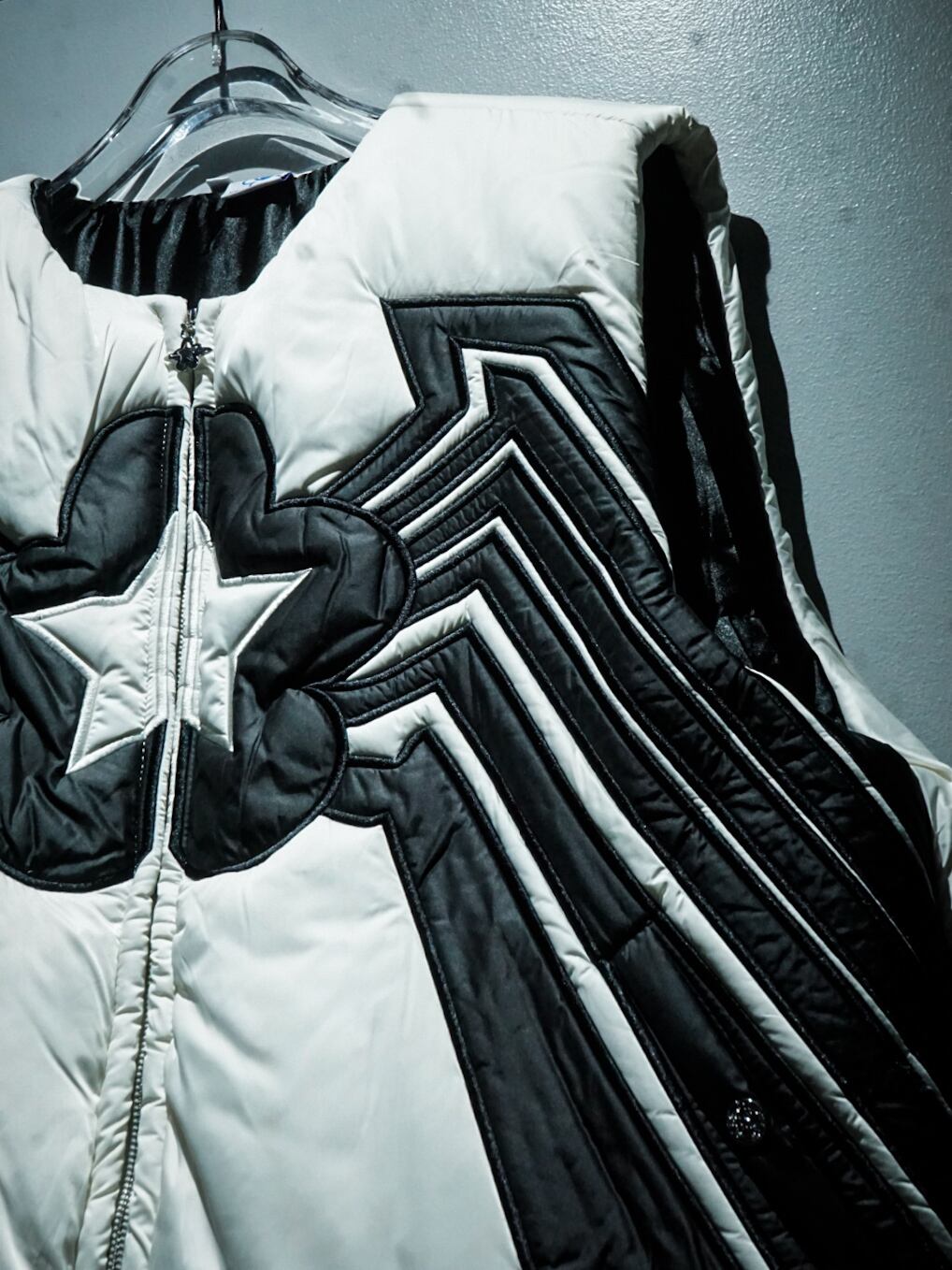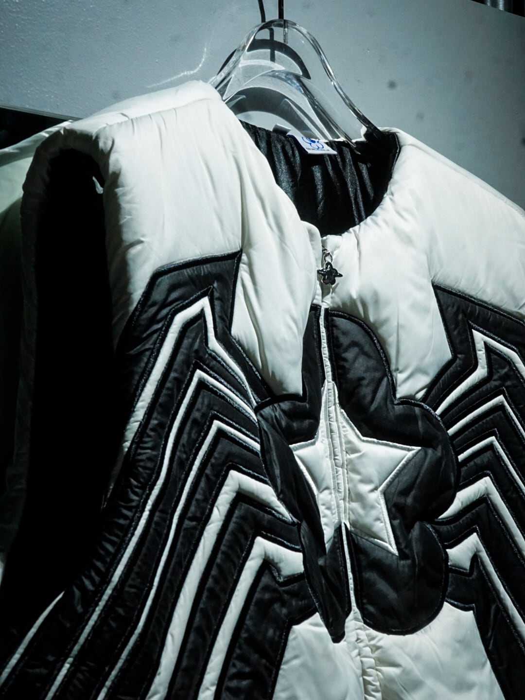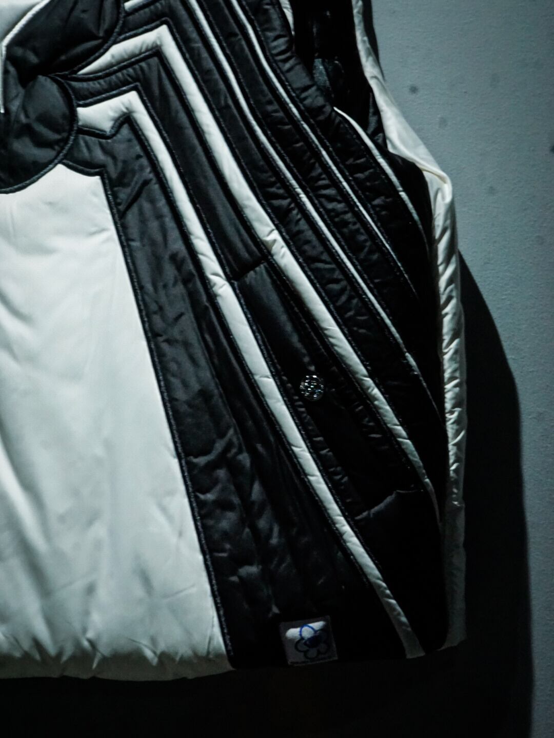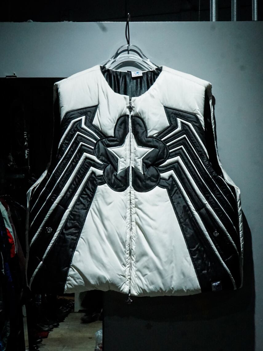 白と黒のモノトーンのカラーリングで、星型の切り替えを中心に、蜘蛛のようにラインの切り替えを施したパデットベスト。