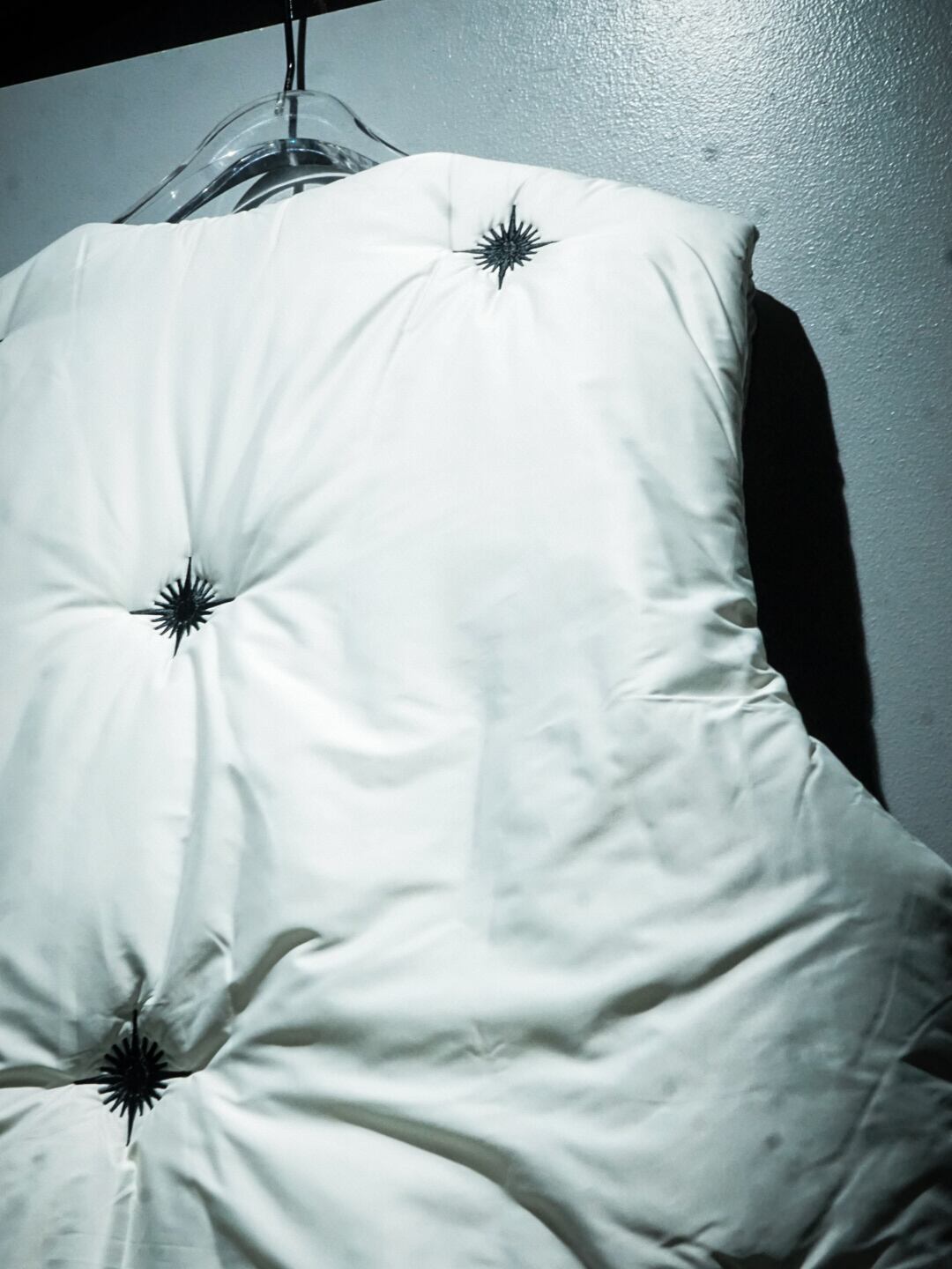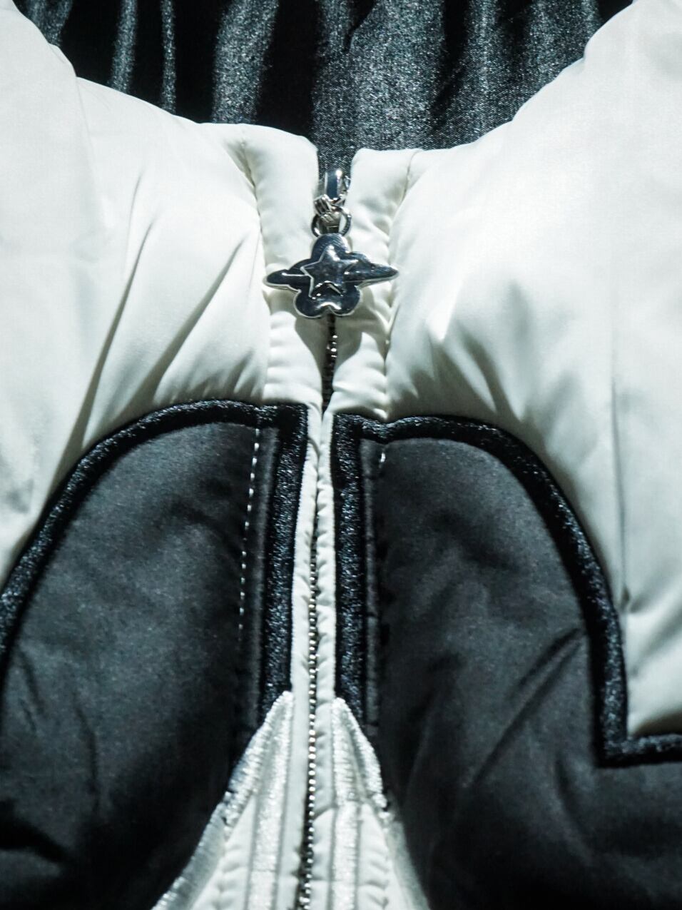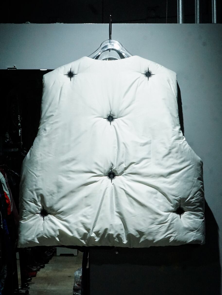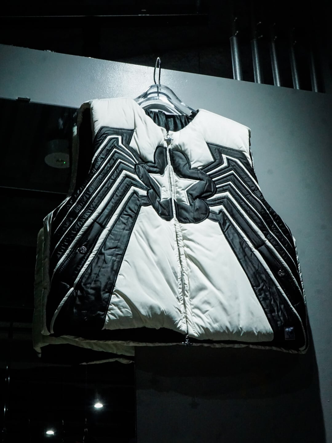 白と黒のモノトーンのカラーリングで、星型の切り替えを中心に、蜘蛛のようにラインの切り替えを施したパデットベスト。