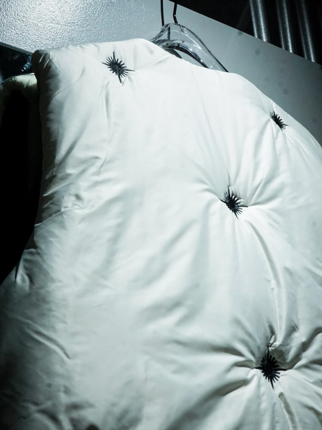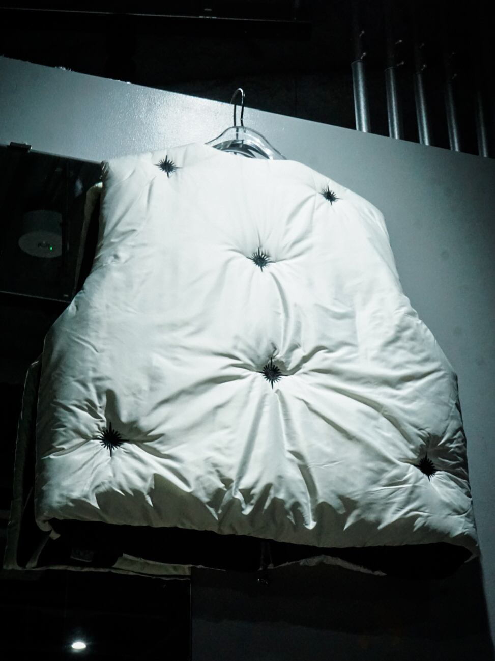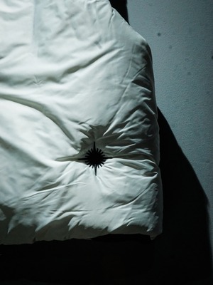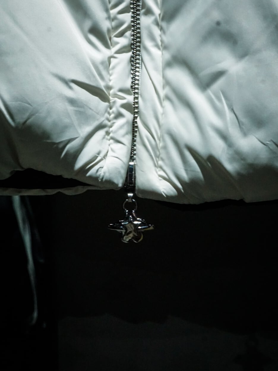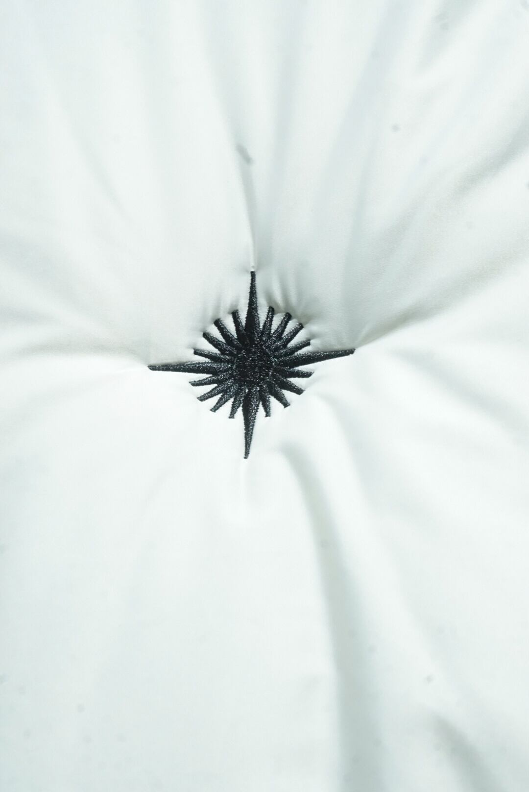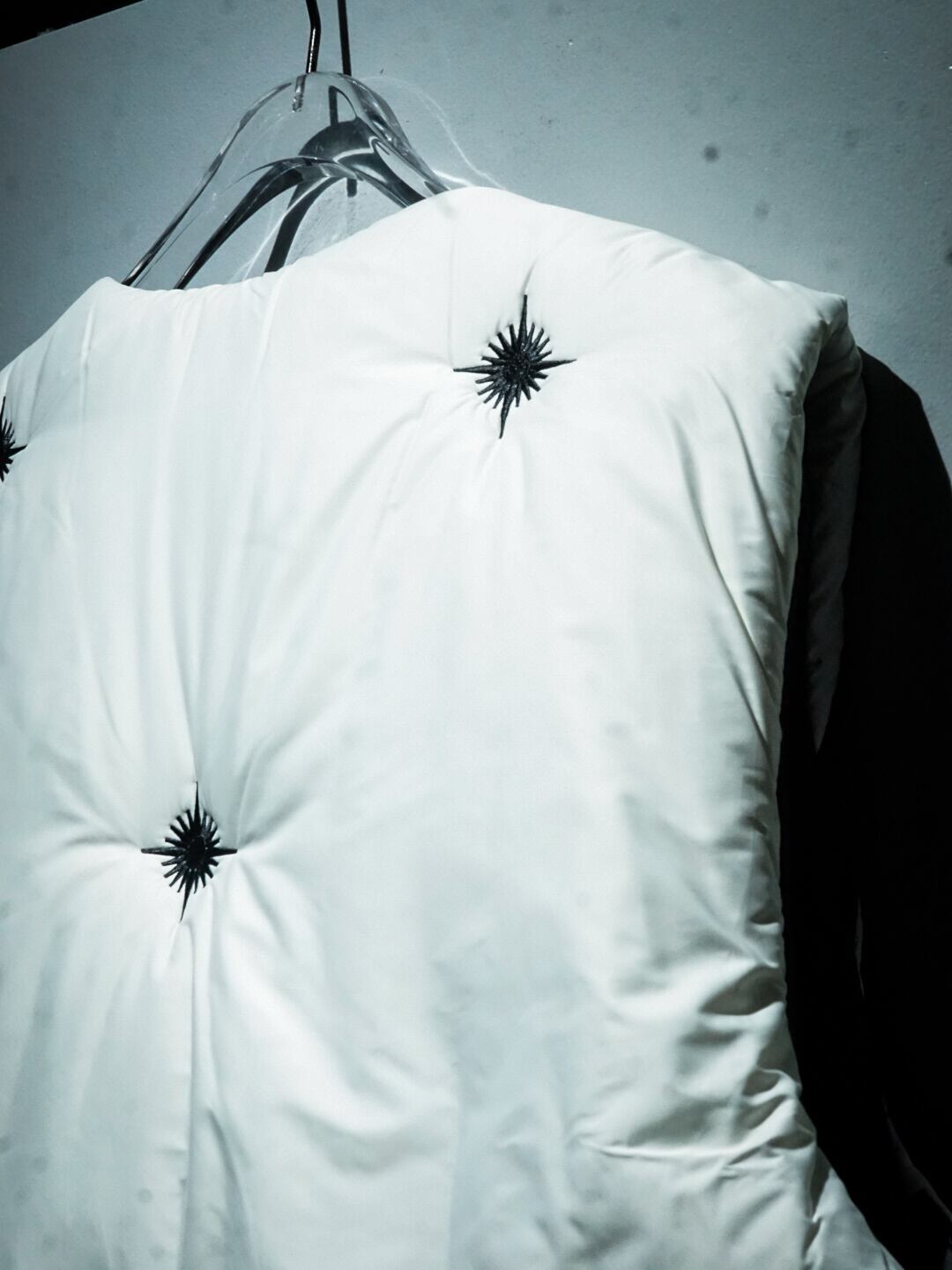 白と黒のモノトーンのカラーリングで、星型の切り替えを中心に、蜘蛛のようにラインの切り替えを施したパデットベスト。