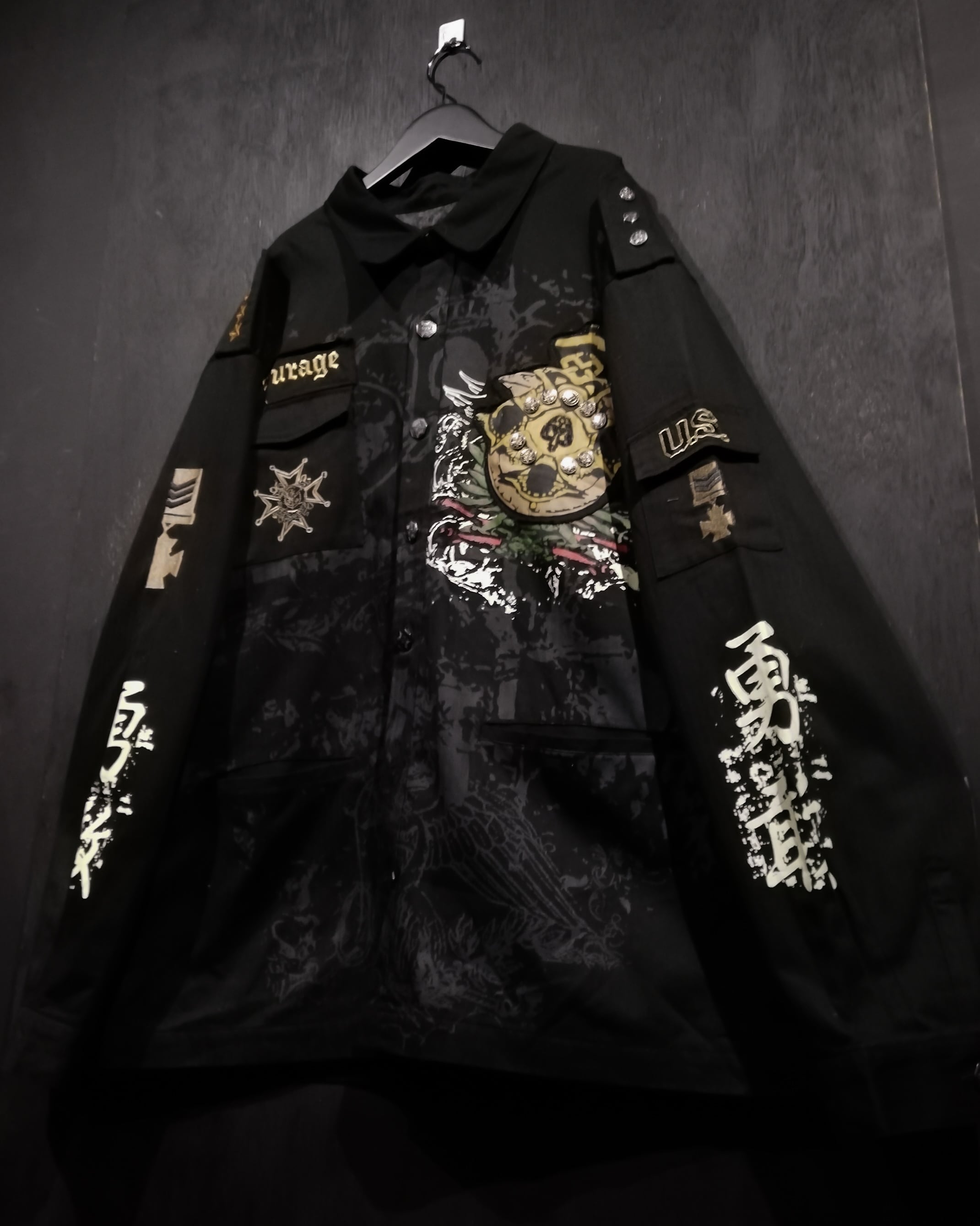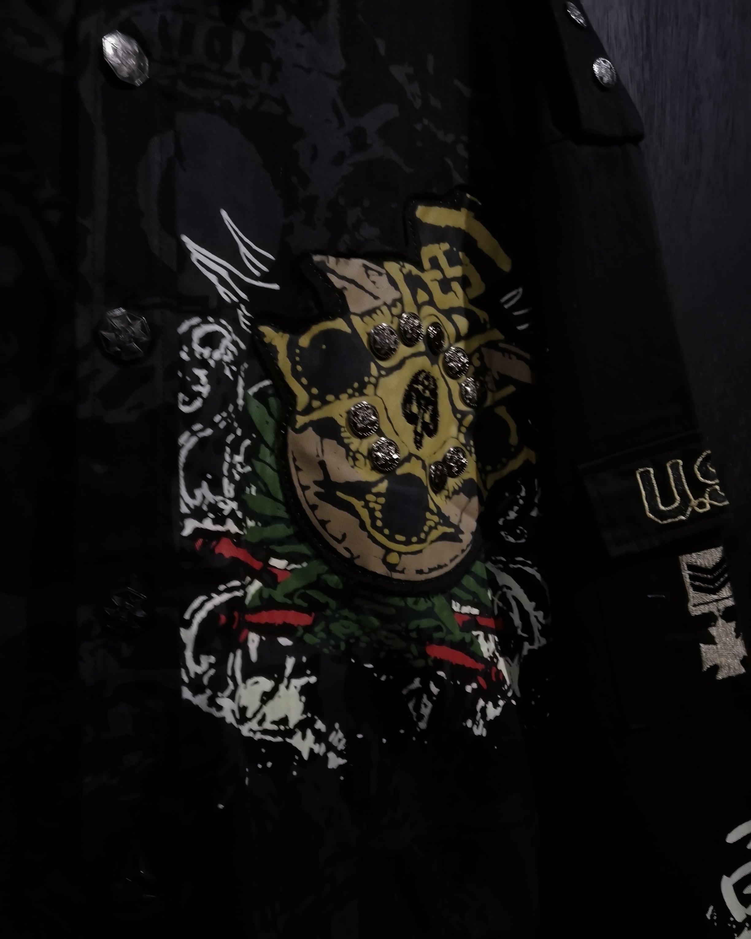 パッチやプリント、刺繍にスタッズ等、様々な手法を用いて、エンブレムやバッジ等を表現。肩には星が刻み込まれたエポレット、右袖には階級章の刺繍を施した、ミリタリーライクな仕様で仕上げられたデザインが最高にイケてますね、、、