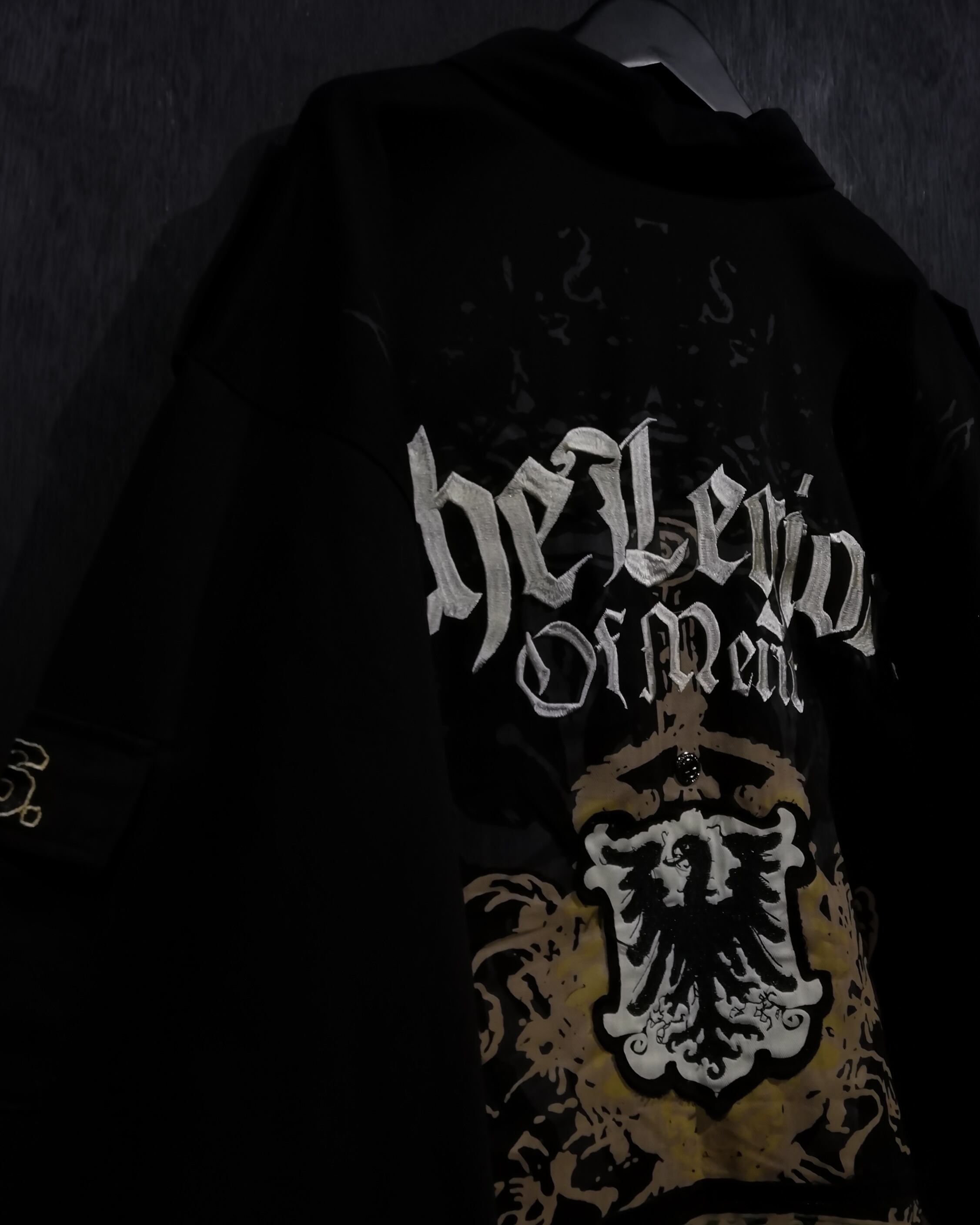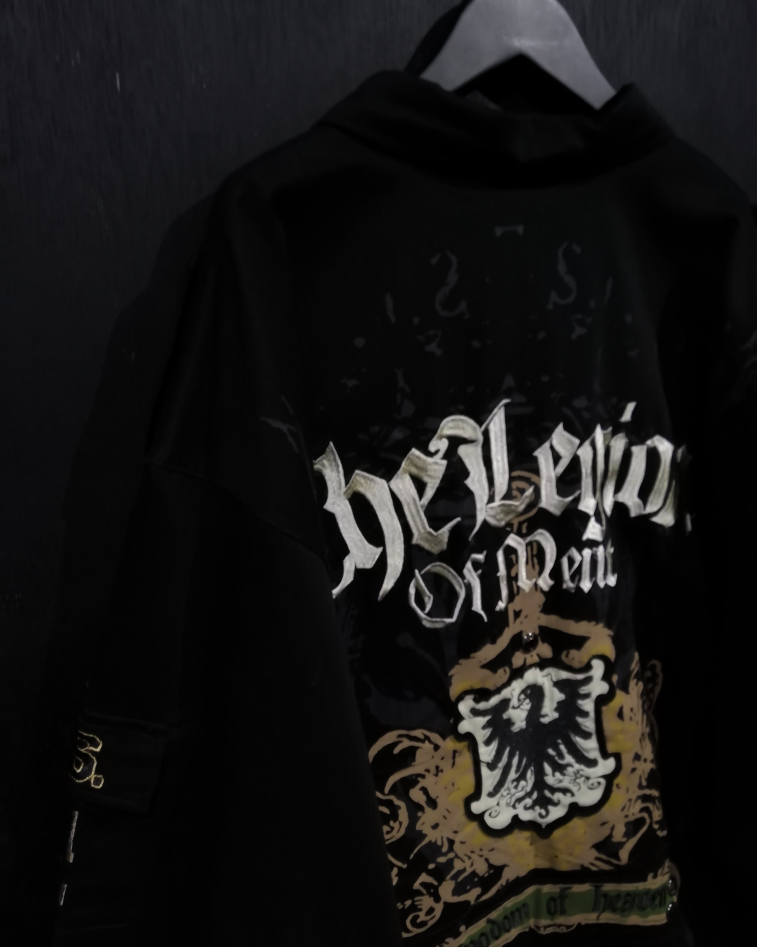 ハリのあるブラックカラーのヘリンボーンを使用したボディをベースに、随所に刺繍やプリントによってワルな雰囲気漂うデザインを効かせたジャケット。