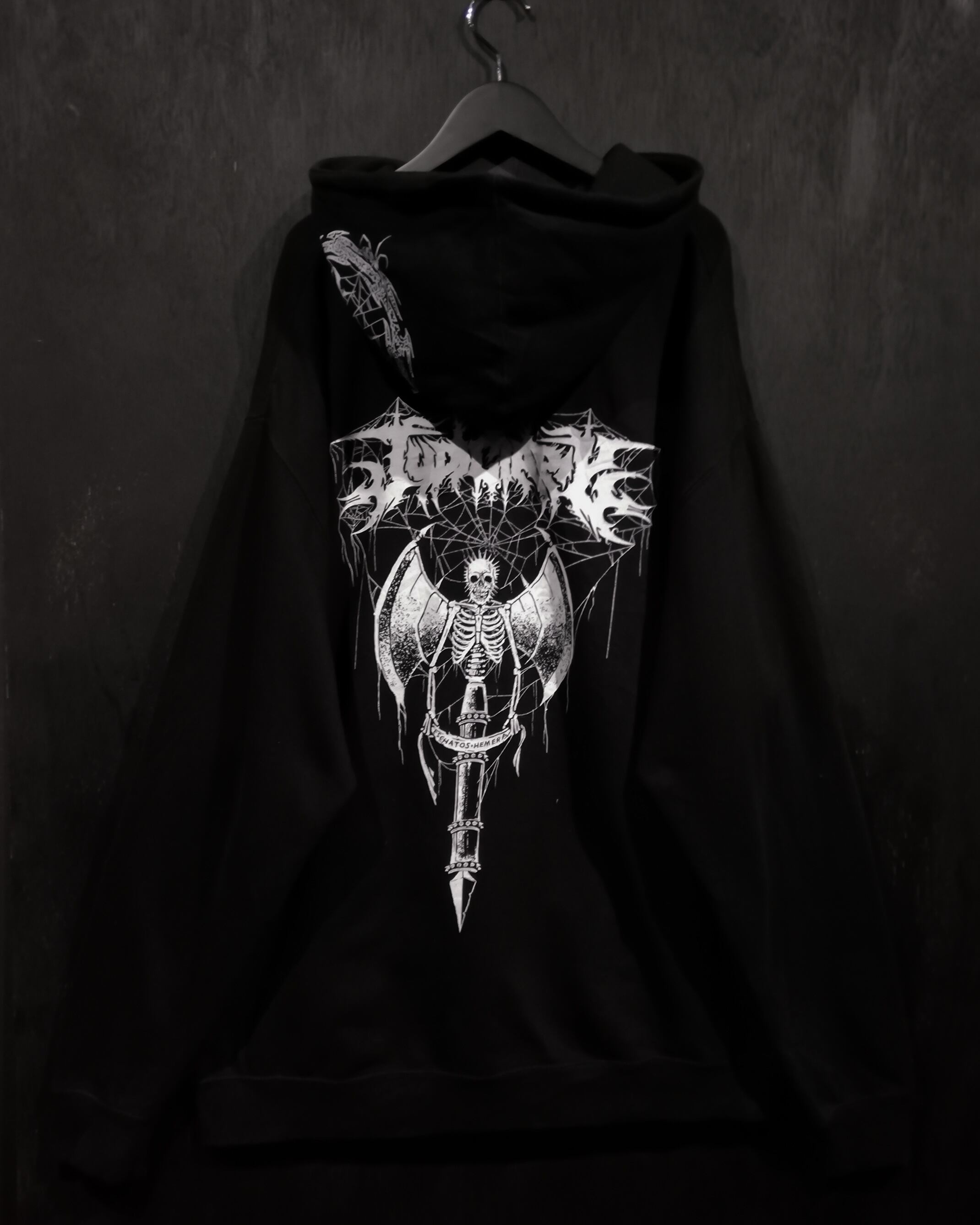 ブラックのスウェット地のボディに、当店らしいトライバル調のデザインや文字、羽の生えた骸骨等、厨二心くすぐられるデザインをプリントしたスウェットフーディ。