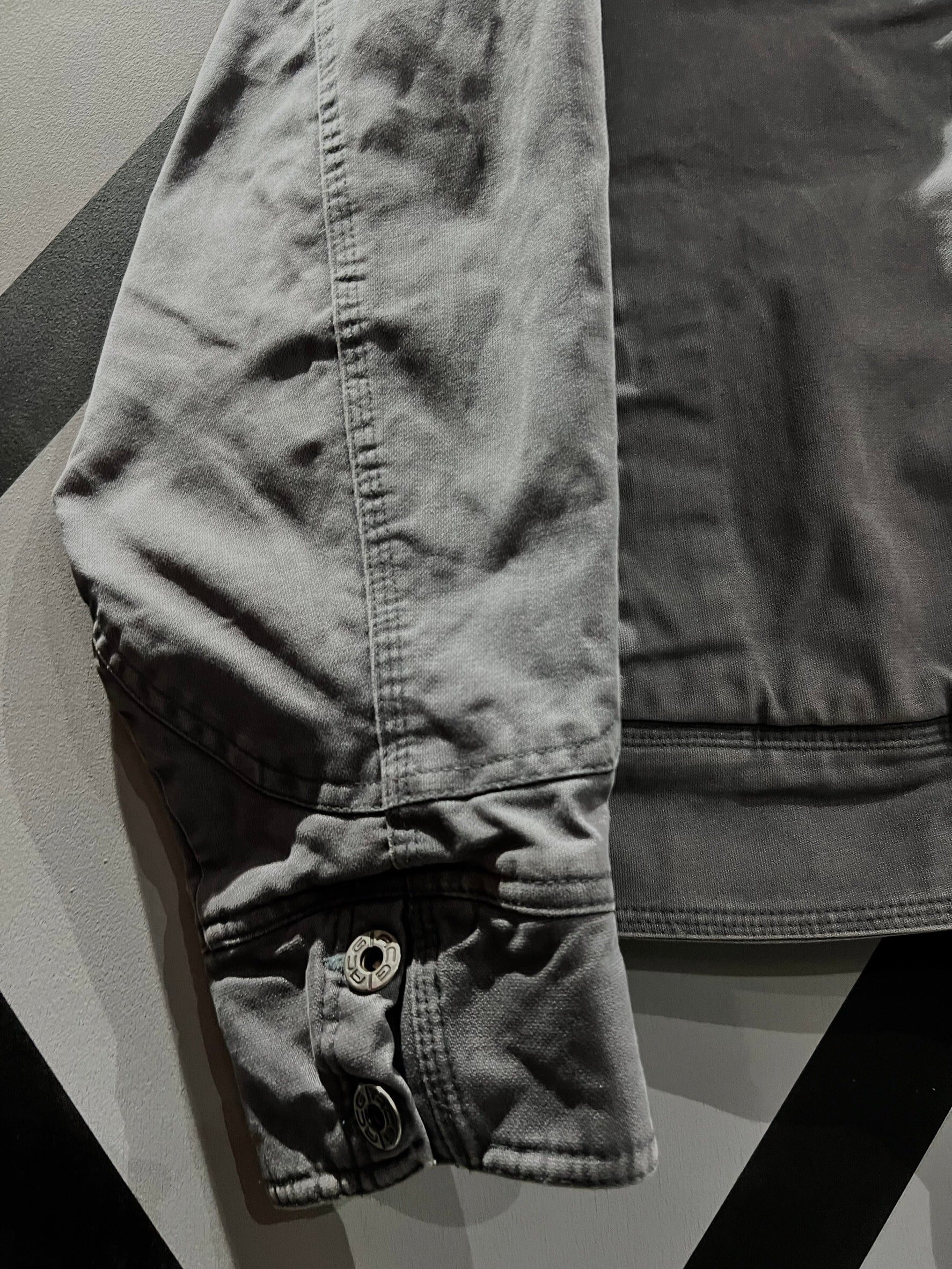 グレーのコットン地のボディに2つの胸ポケット、両サイドにはスラッシュポケットを配しジャケット。