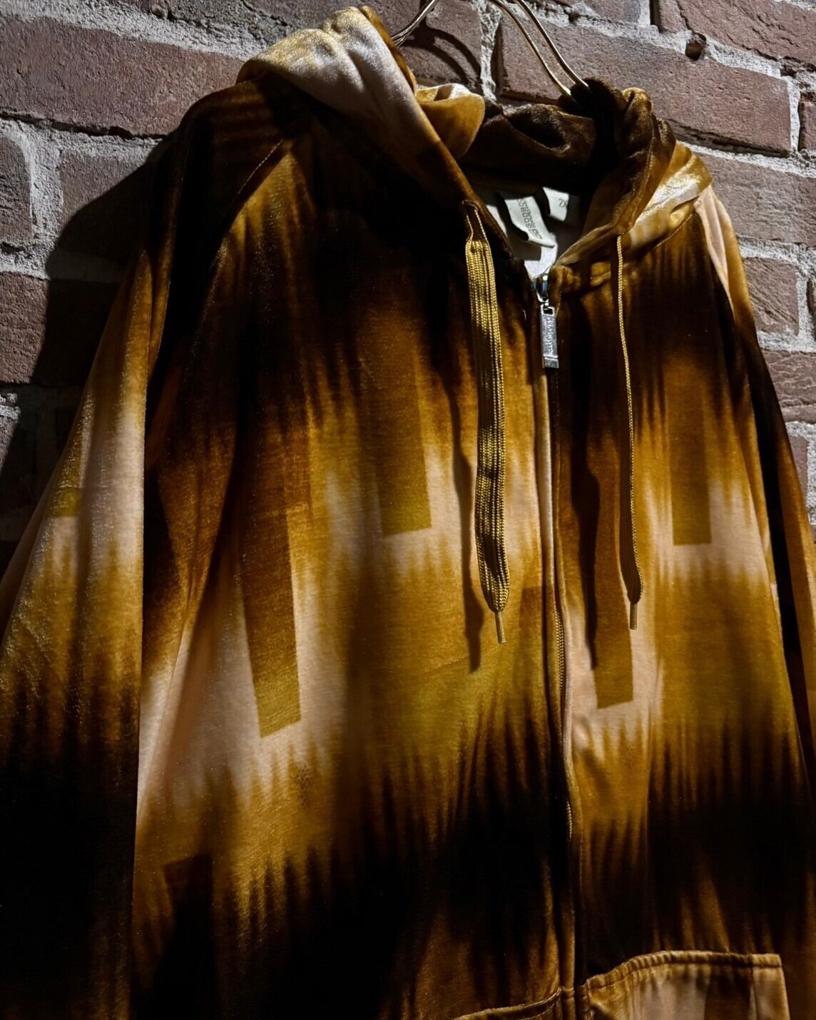 鈍い光沢を放つベロアを用いたボディに、ジグザグ調のグラデーションを載せた、インパクト大なジップアップフーディ。