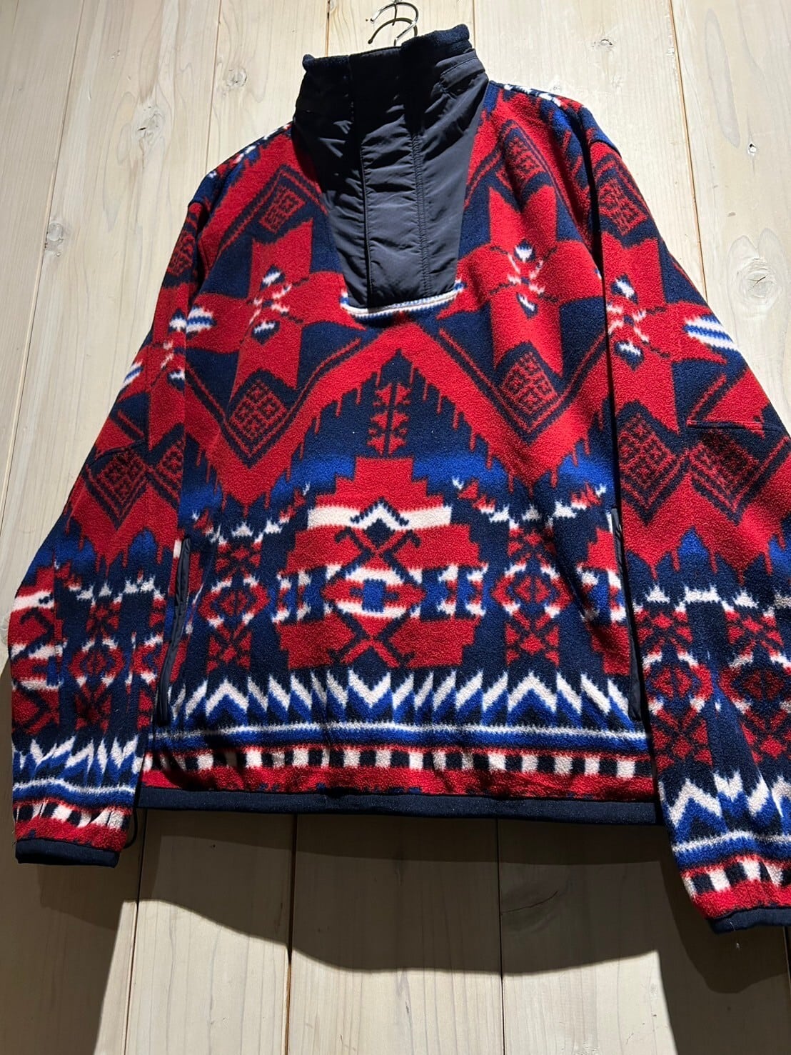 赤×青のグラデーションの美しいネイティブ柄を載せたフリースのボディに、首元にはナイロン素材を切り替えたプルオーバージャケット。