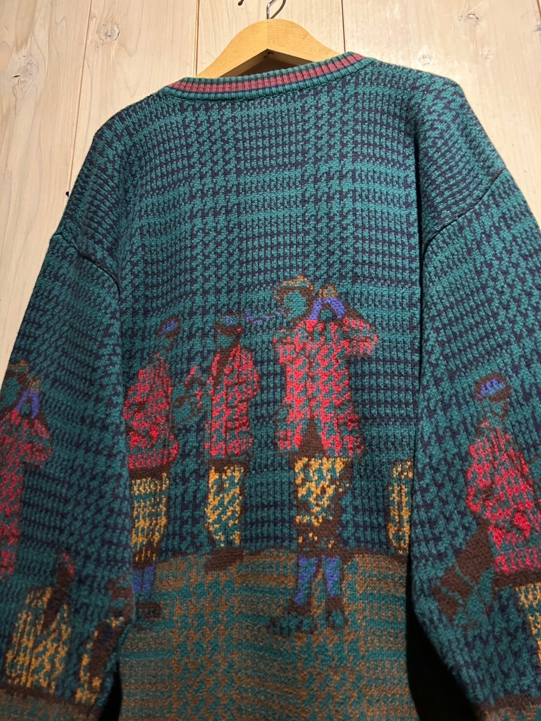 サラッと肌触りの良い素材を用いて、千鳥格子柄ととゴルフを楽しむ男性を繊細なニッティングで表現した1着。