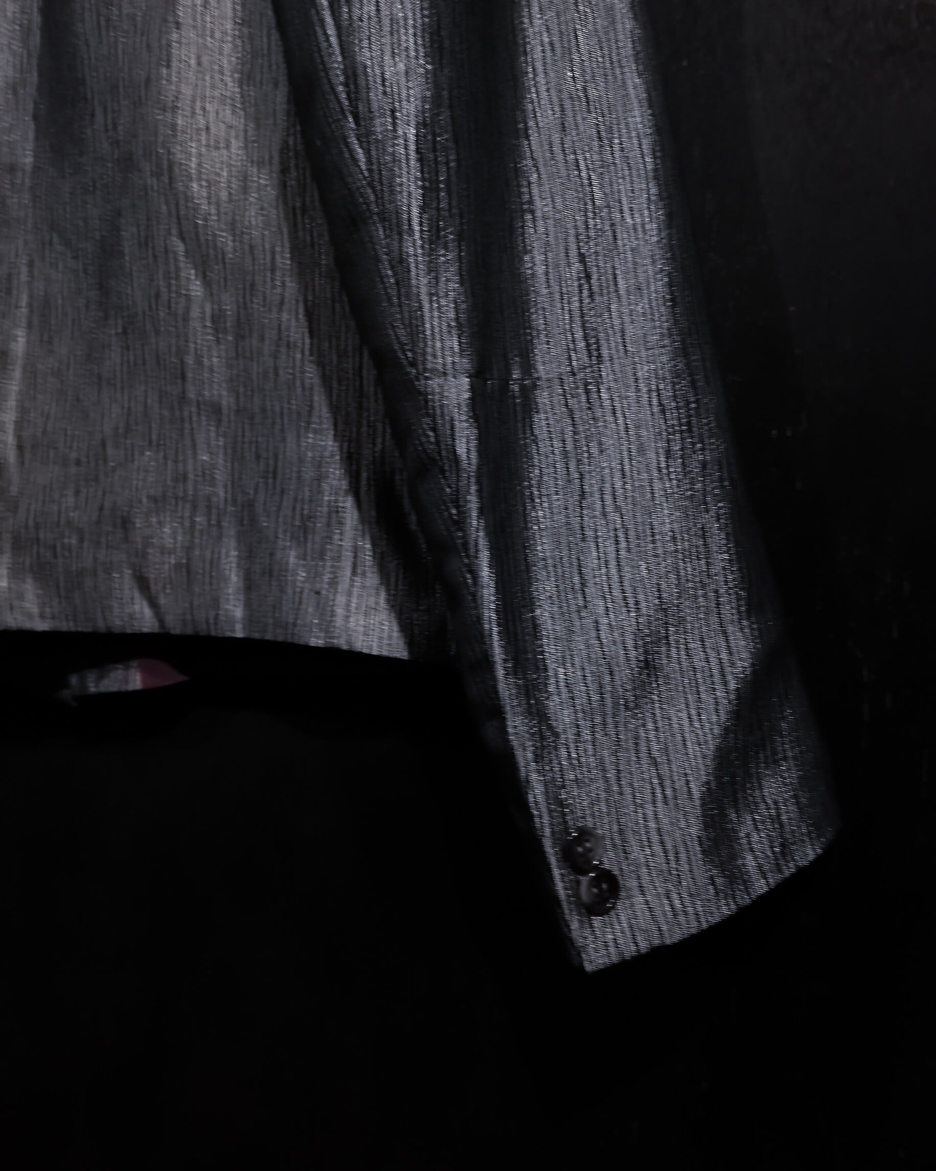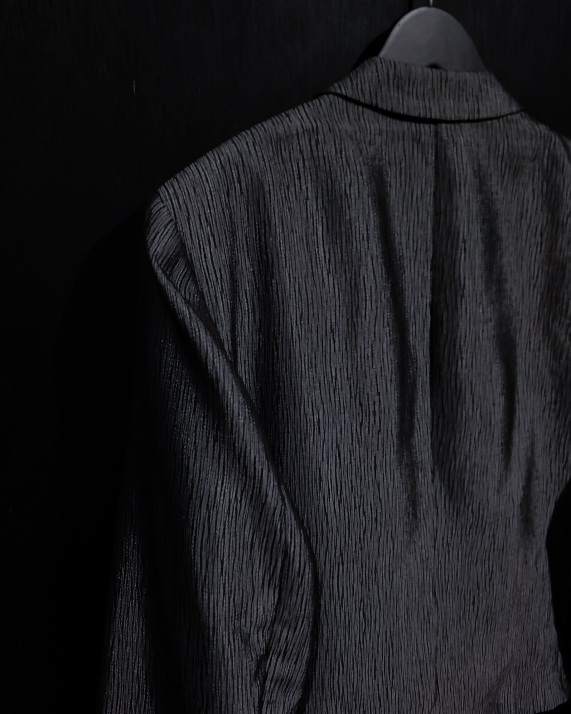 光沢のあるグレーとブラックの糸を繊細に織り込み、流れ落ちるようなストライプ状の柄を映し出した、高いデザイン性に加え高級感をムンムンに感じさせるテーラードジャケット。