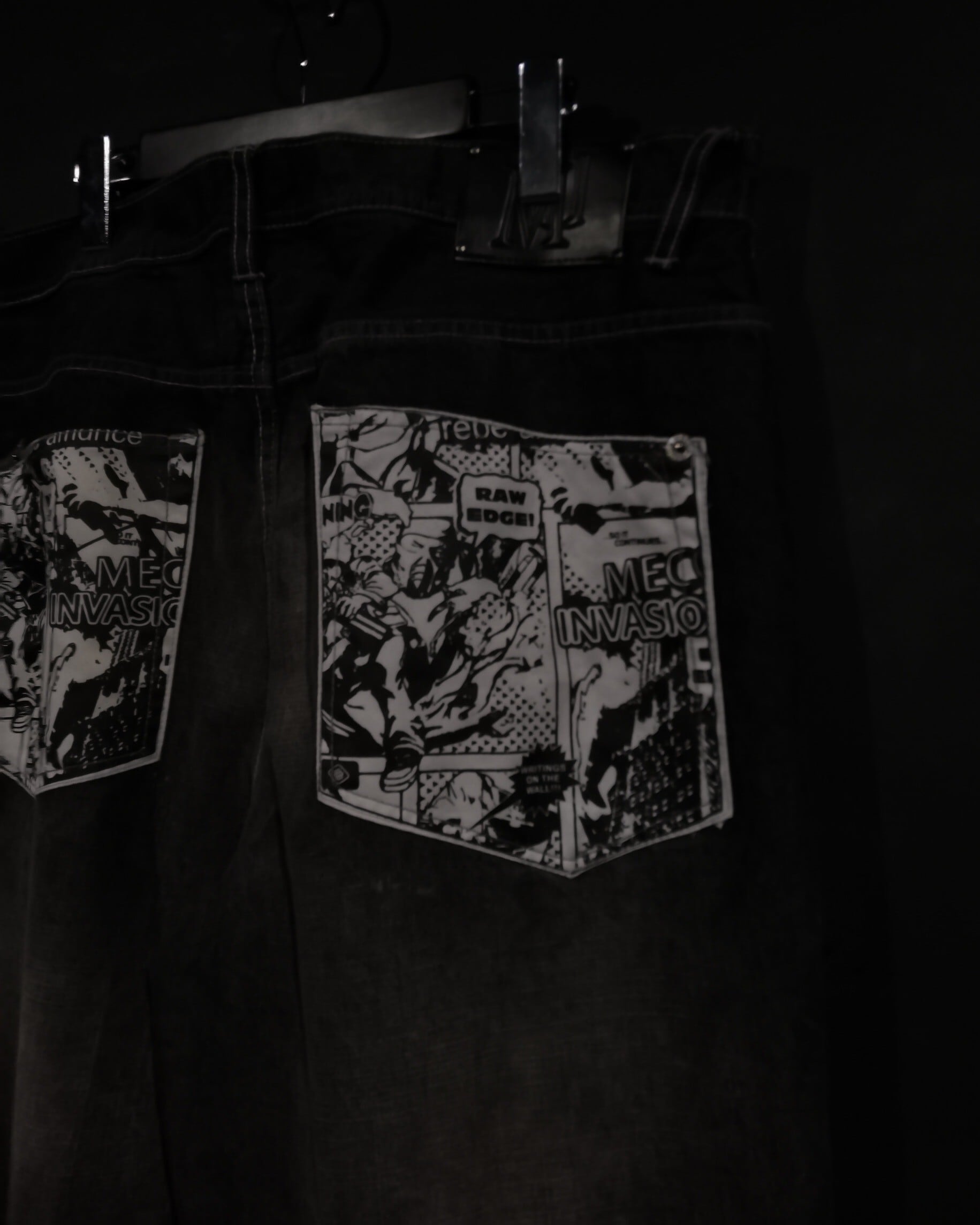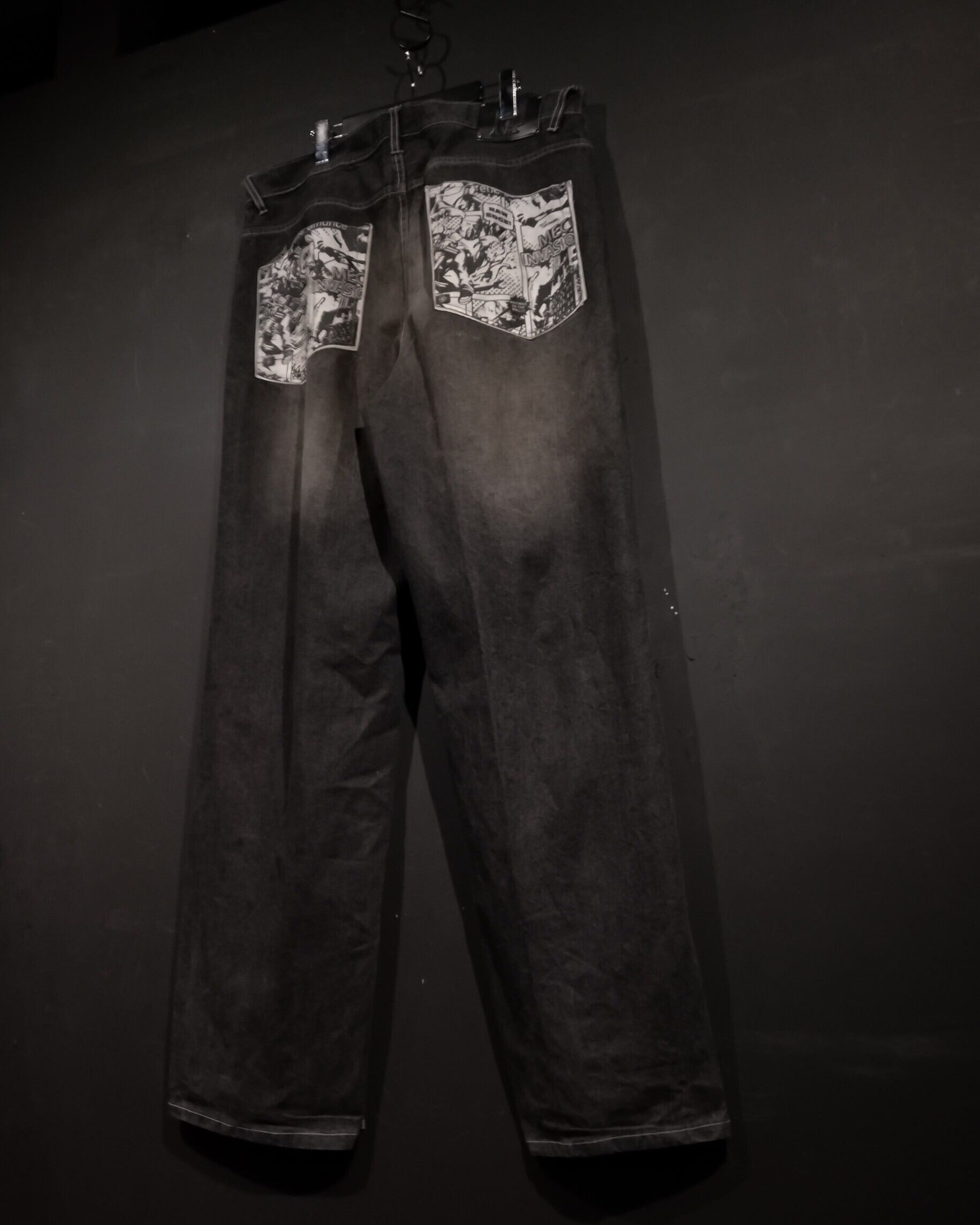 美しいフェードがかかったブラックのデニム生地をベースに、アメコミのデザインをバックポケットに切り替えたバギーデニムパンツ。