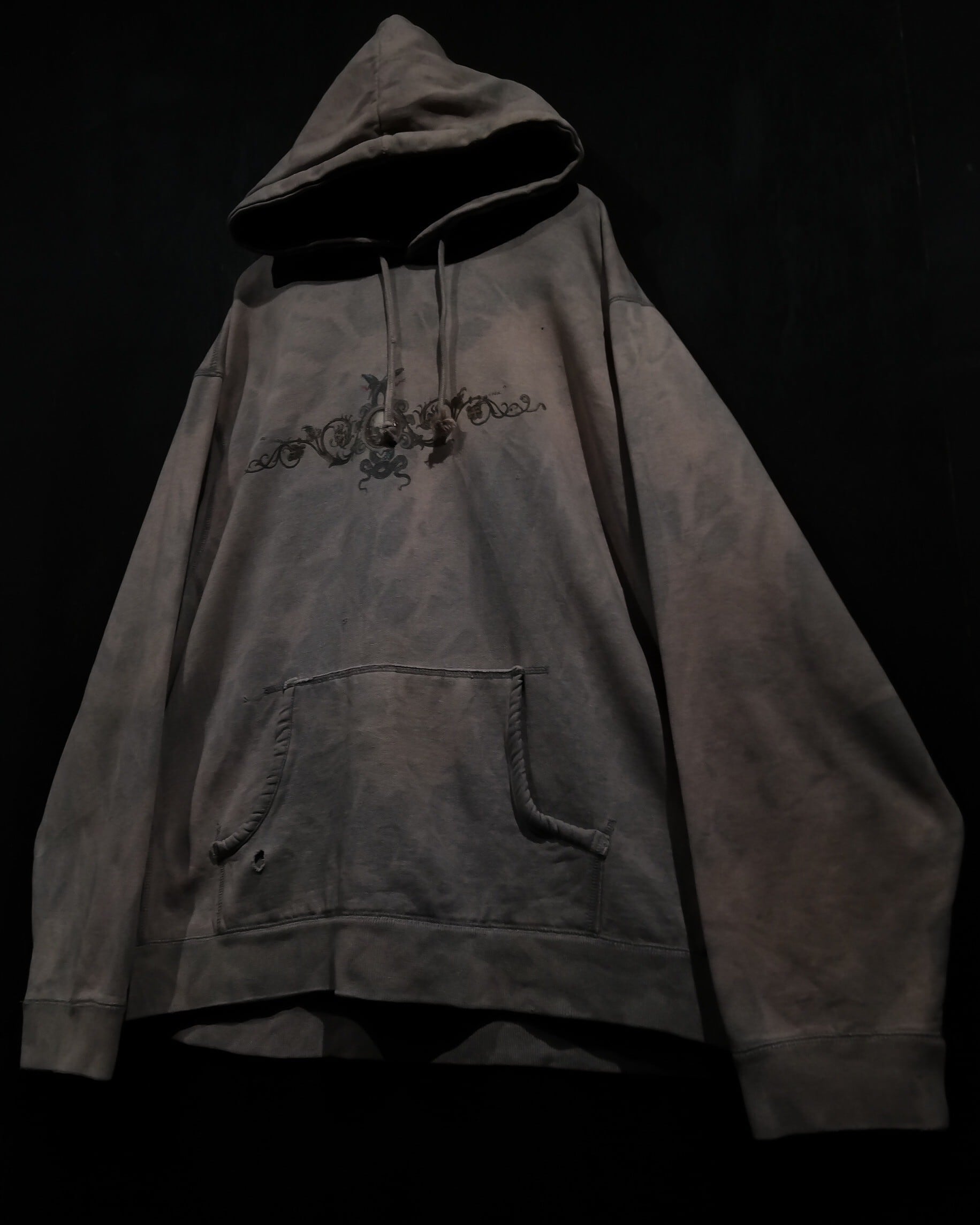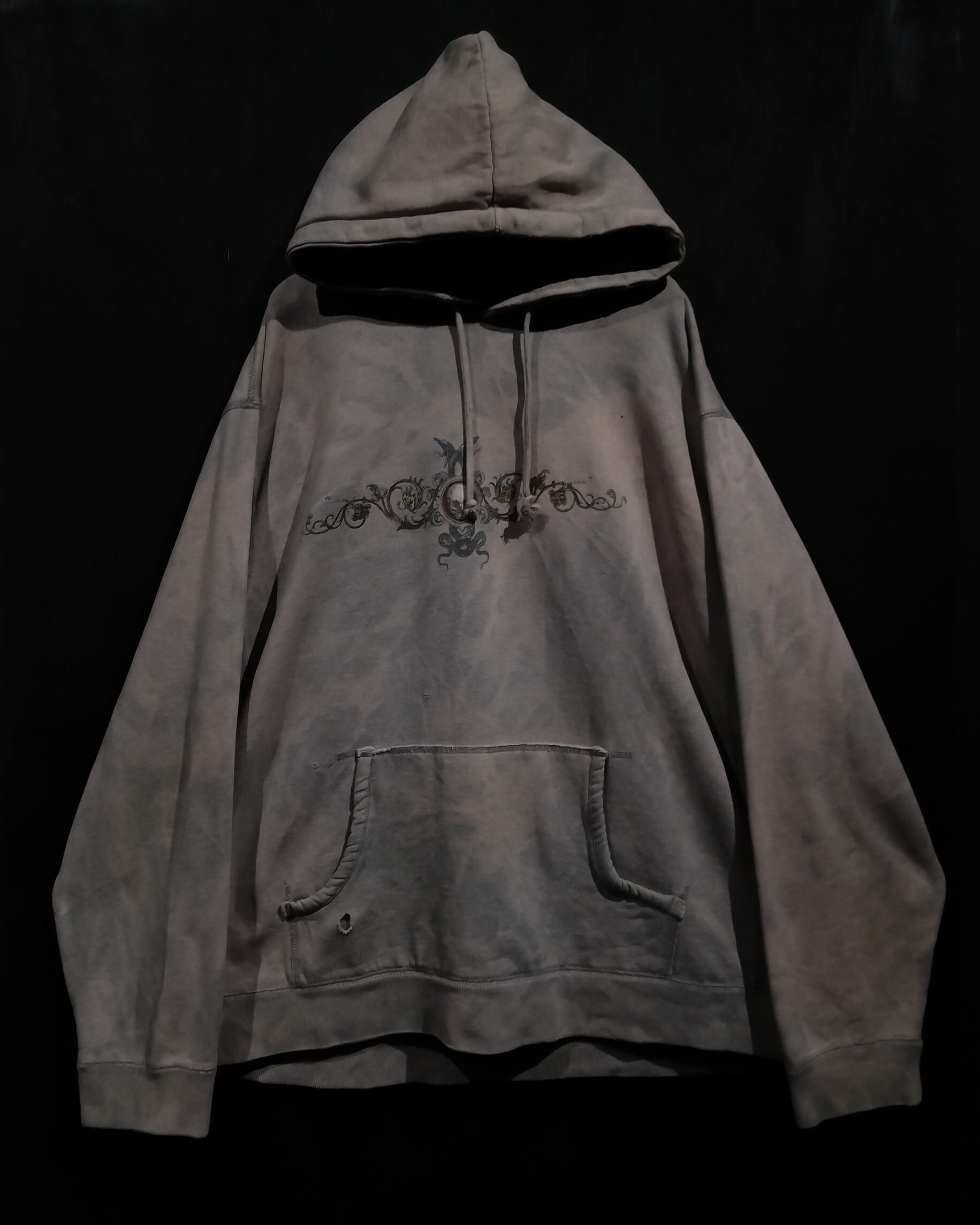 染めのような淡いピンクとグレーのボディに、ドクロにヘビ、ゴシック調の花柄をプリントしたスウェットフーディ。