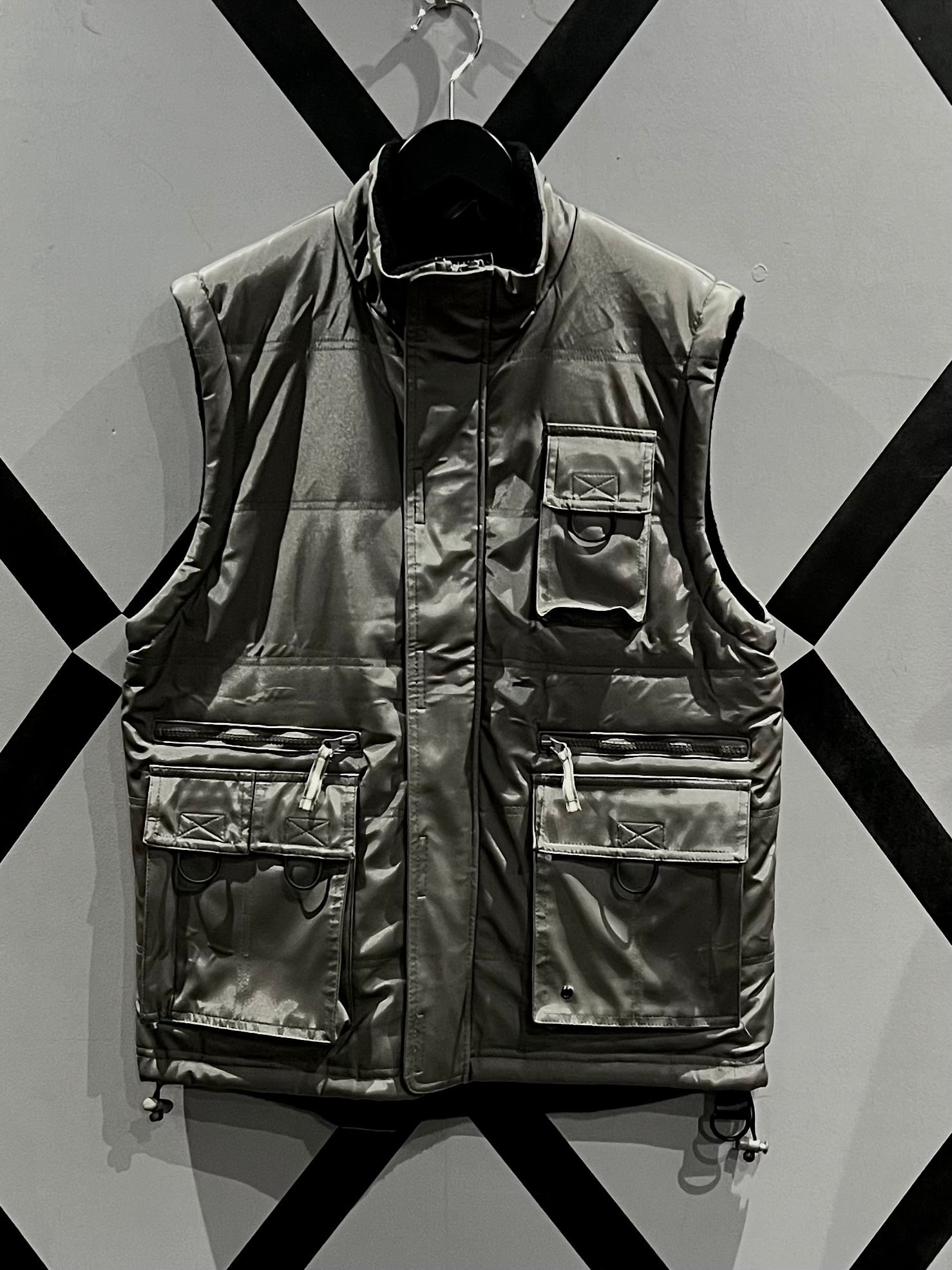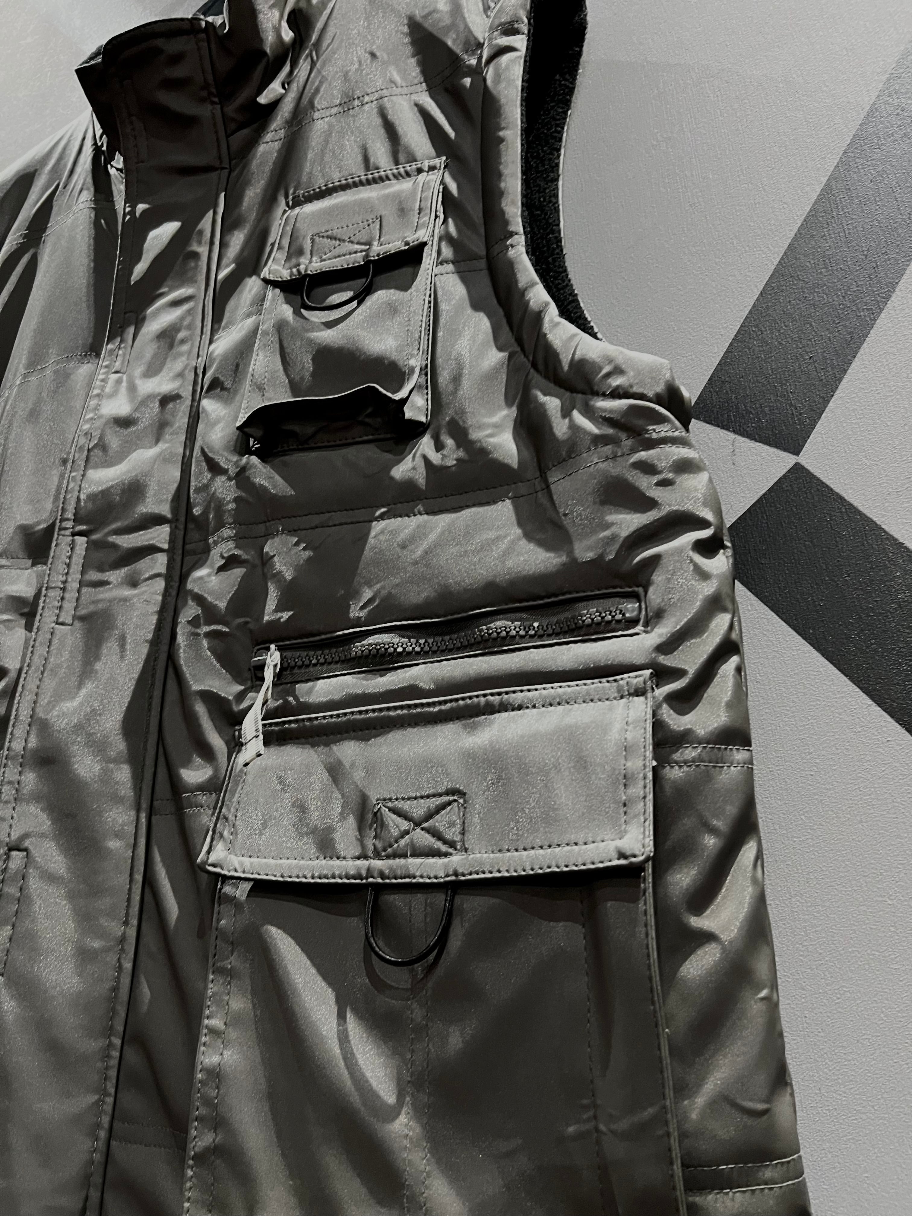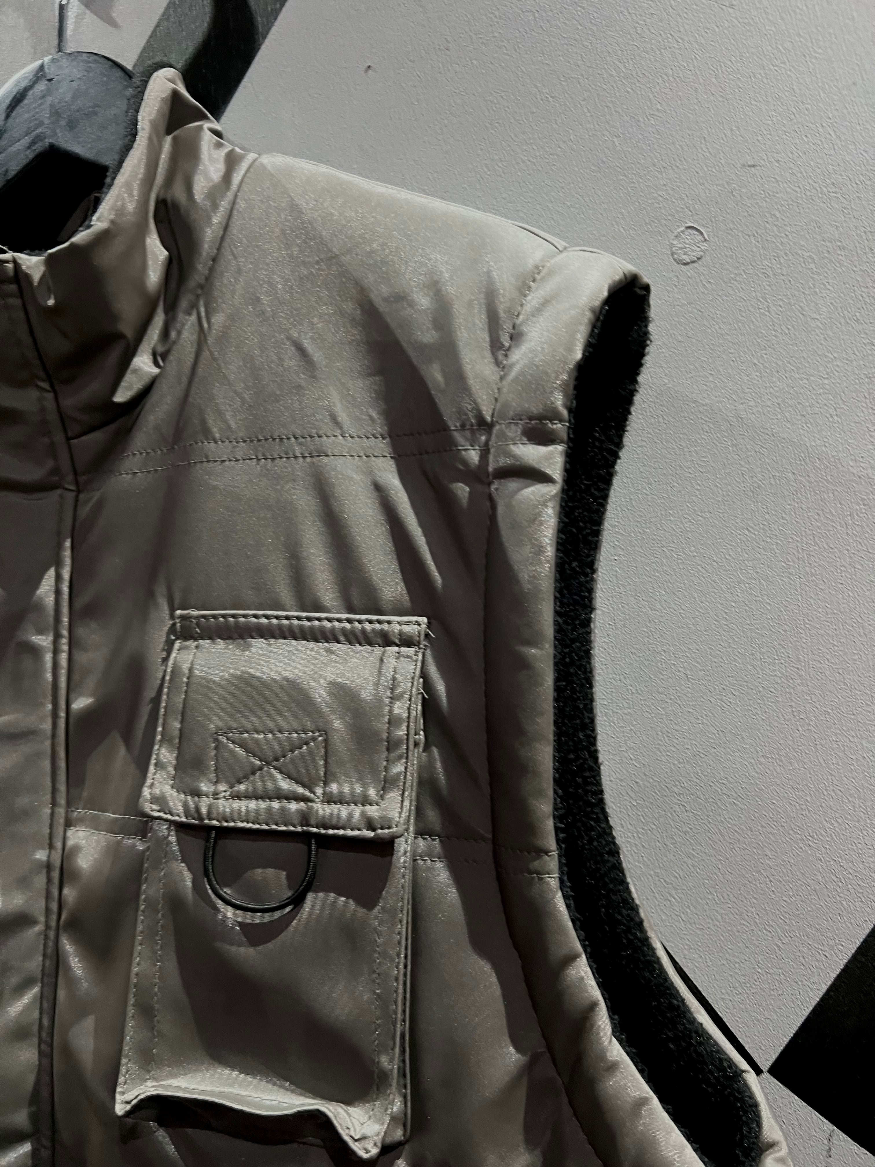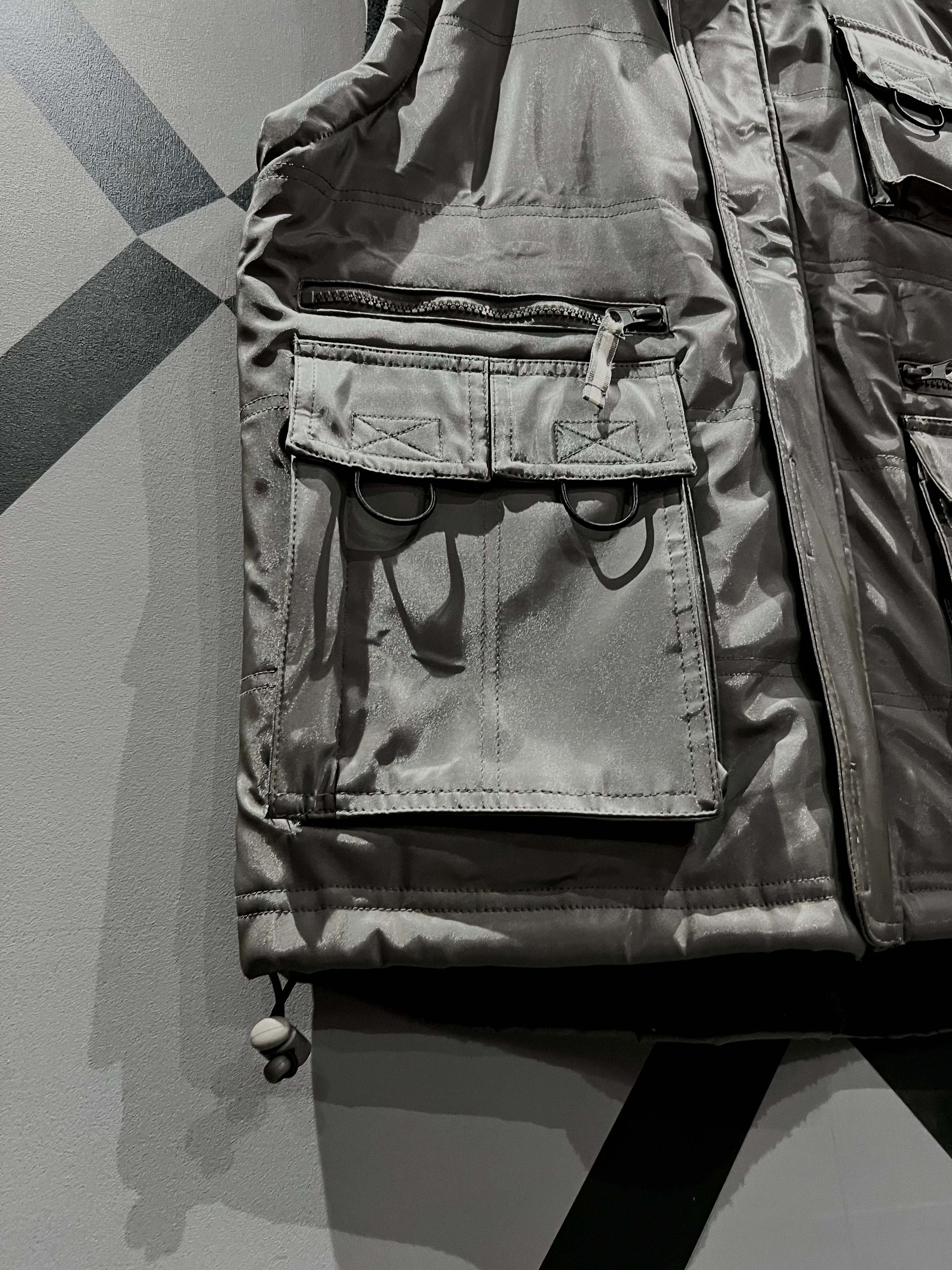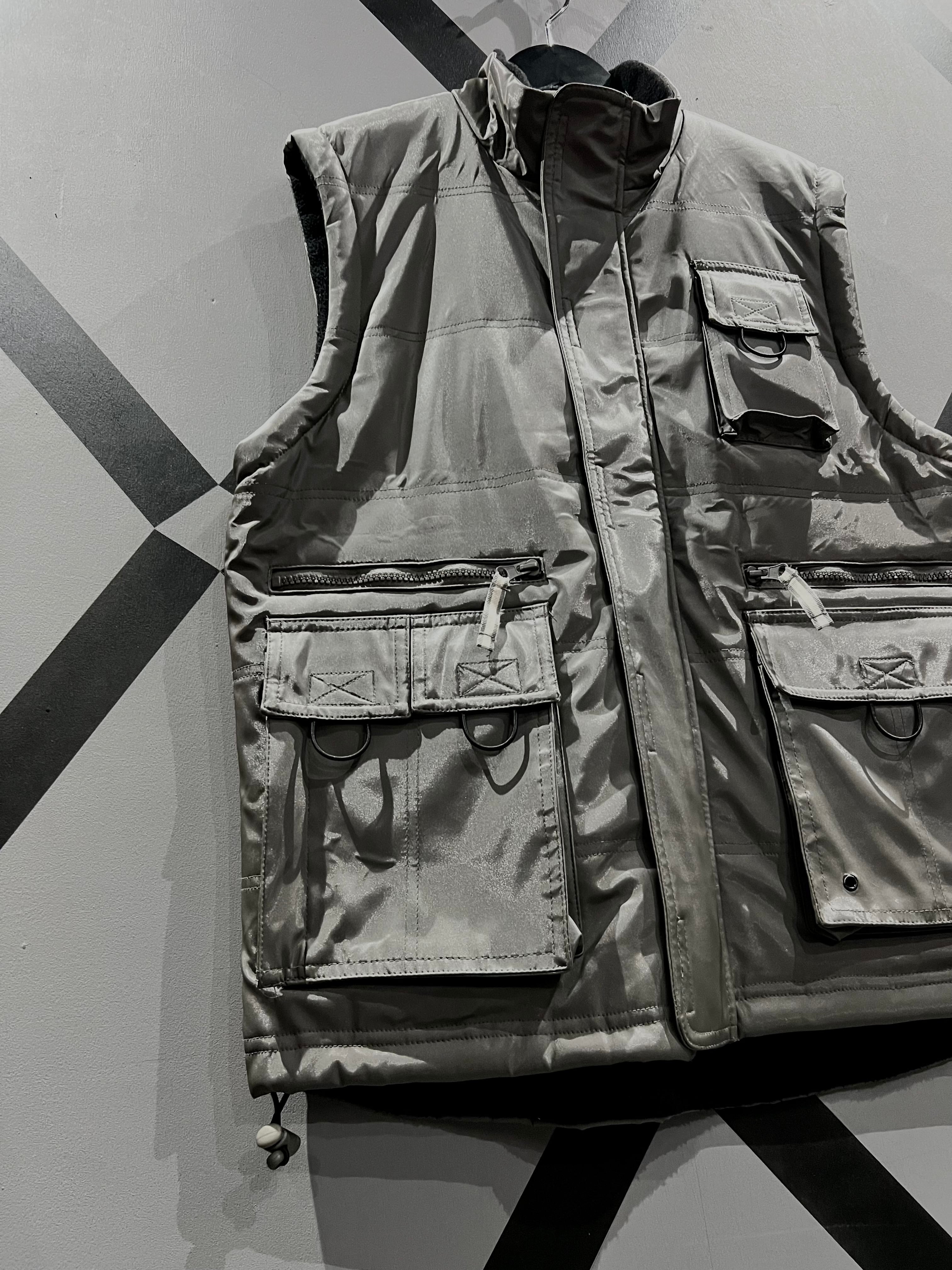 メタリックな光沢のあるポリエステルのボディに、大ぶりのフラップポケット2つと胸ポケット1つ、ジップポケットを2つ施したギア感溢れるベスト。