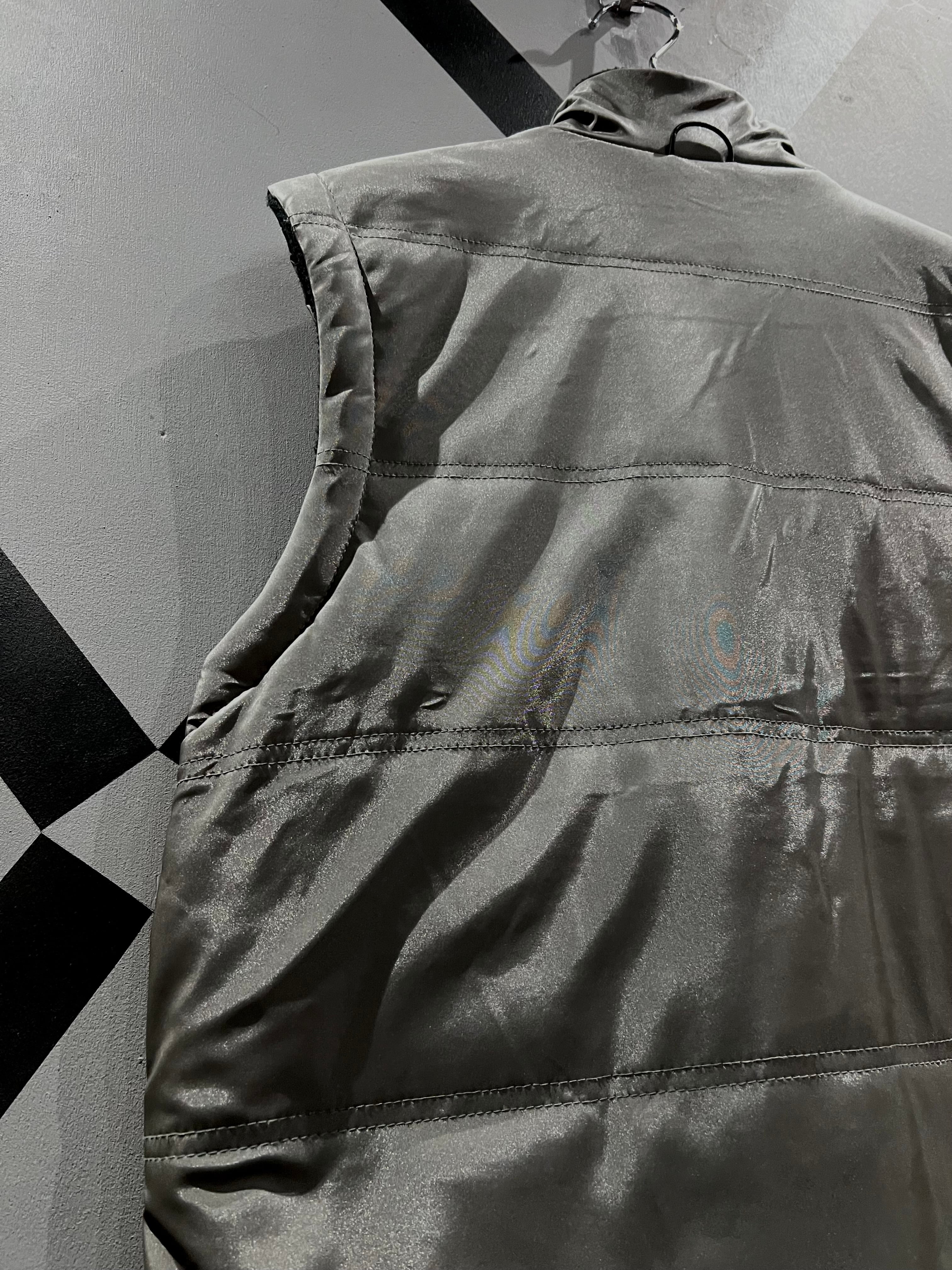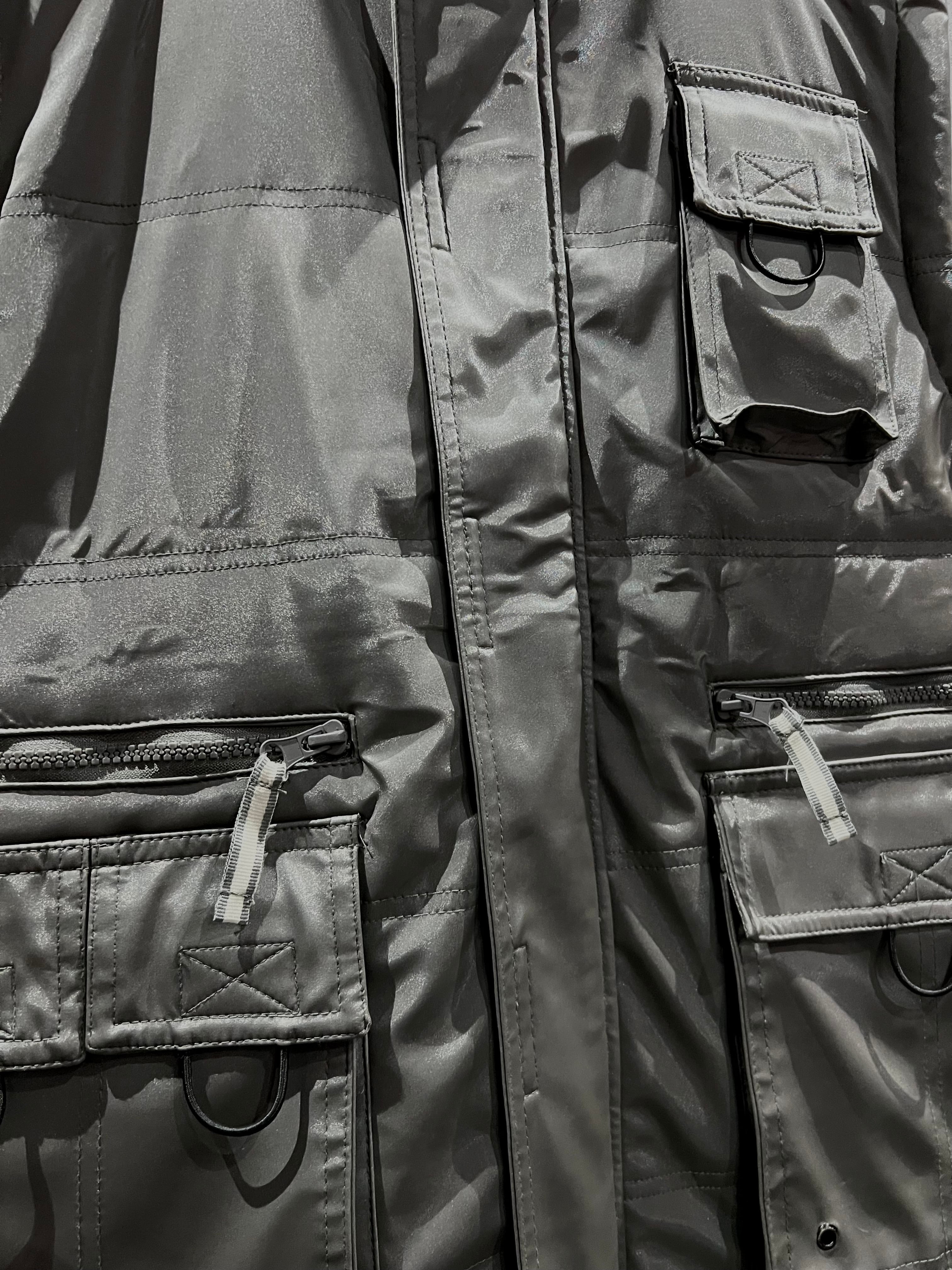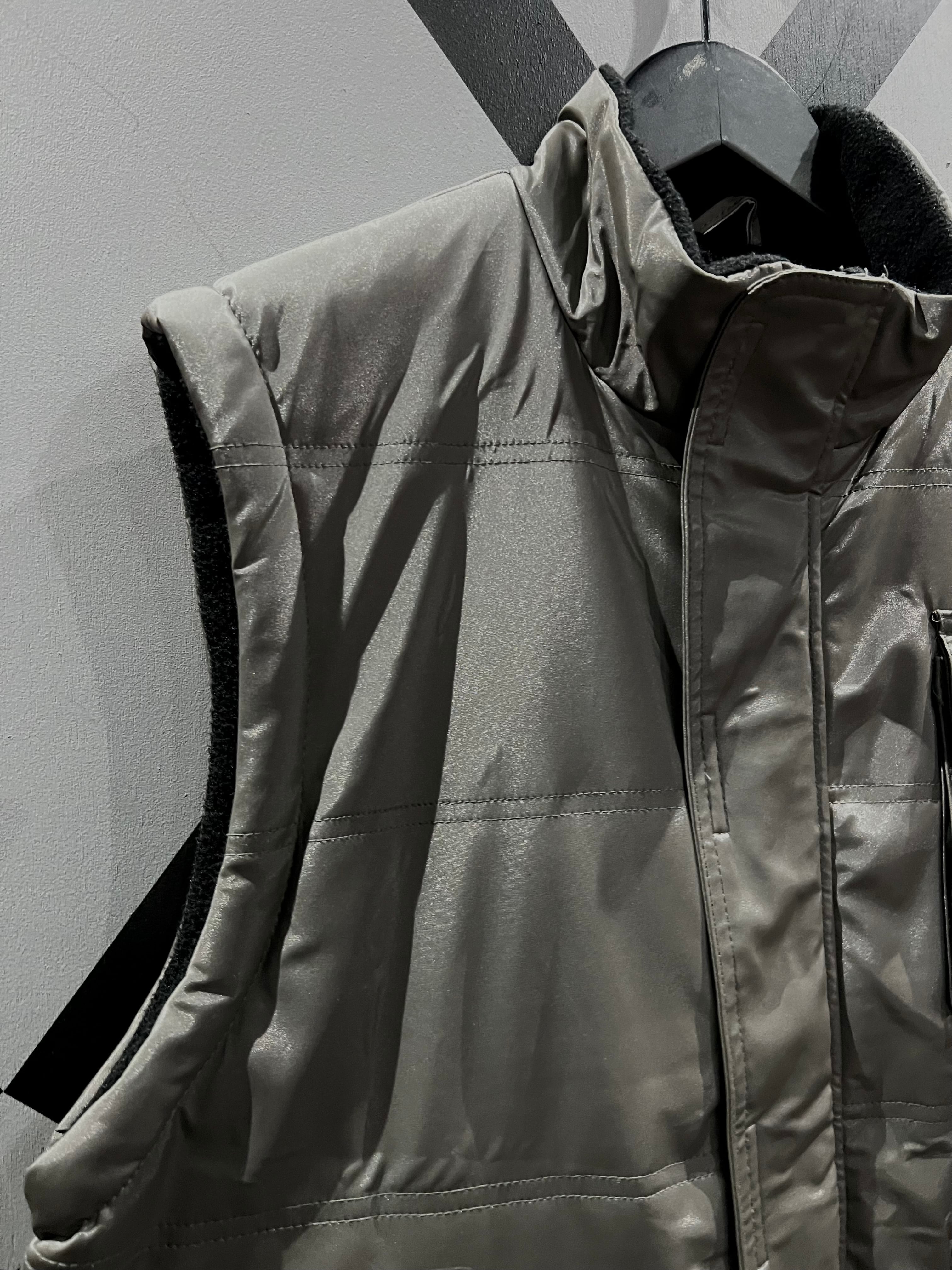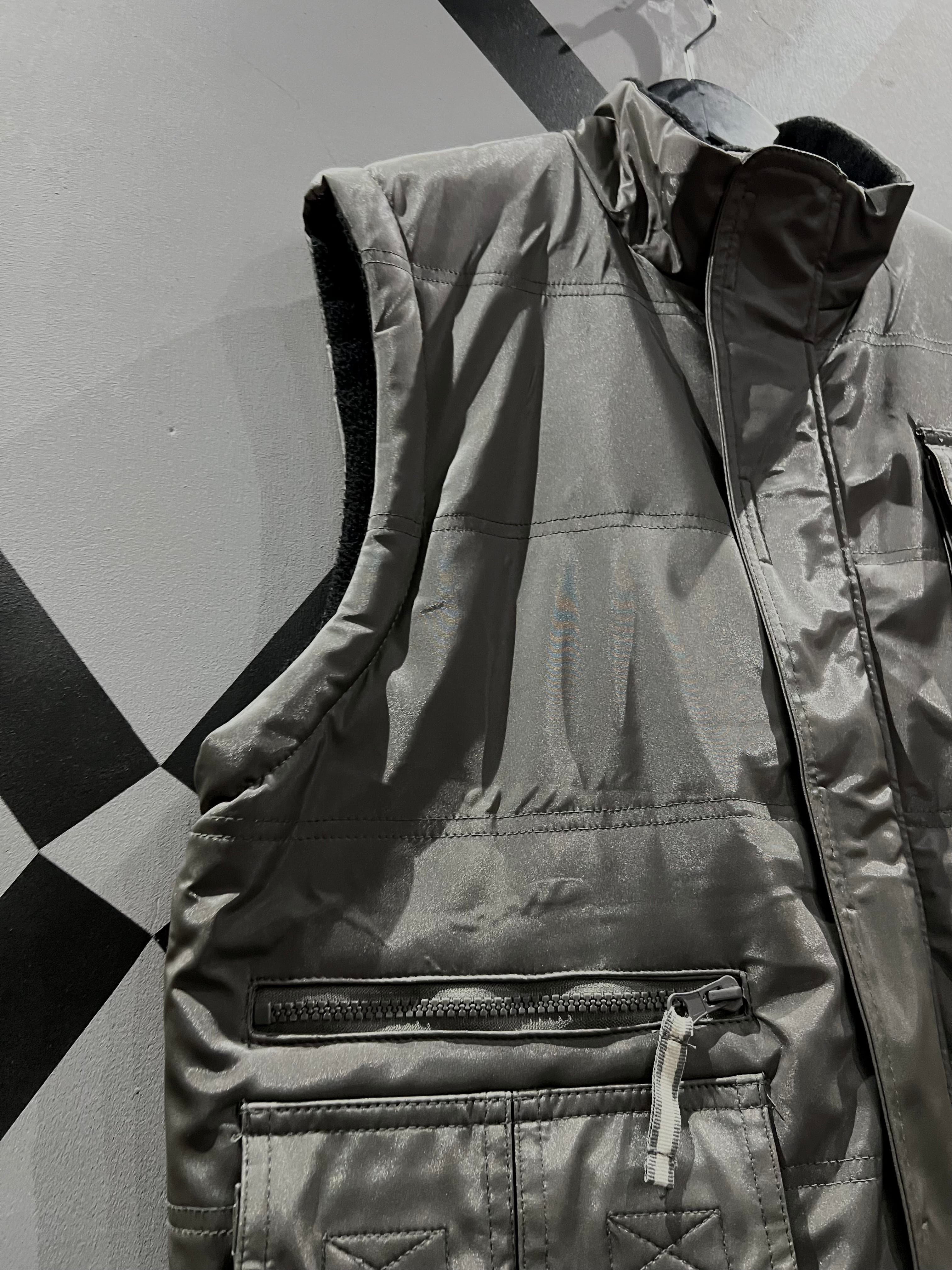 メタリックな光沢のあるポリエステルのボディに、大ぶりのフラップポケット2つと胸ポケット1つ、ジップポケットを2つ施したギア感溢れるベスト。