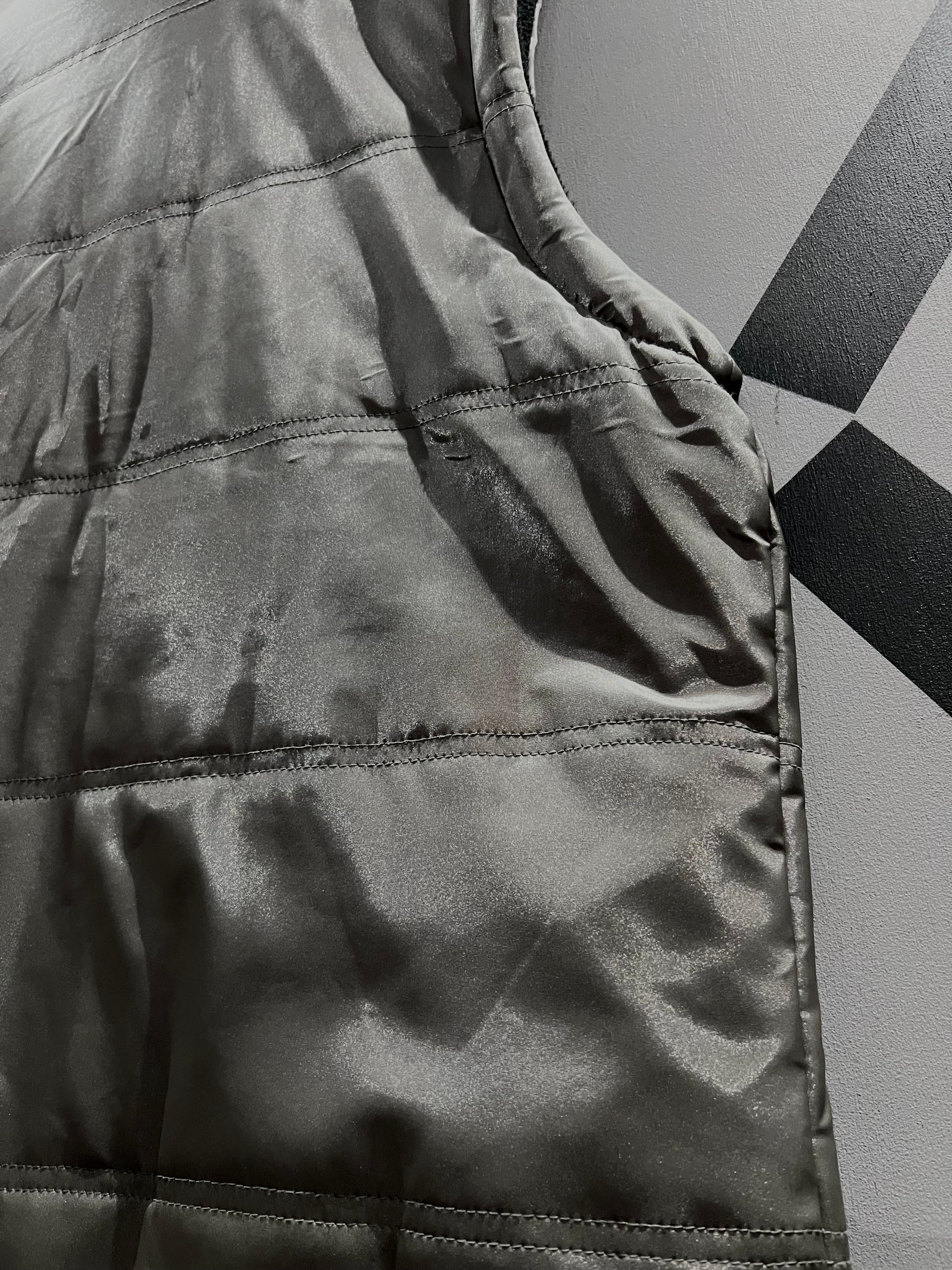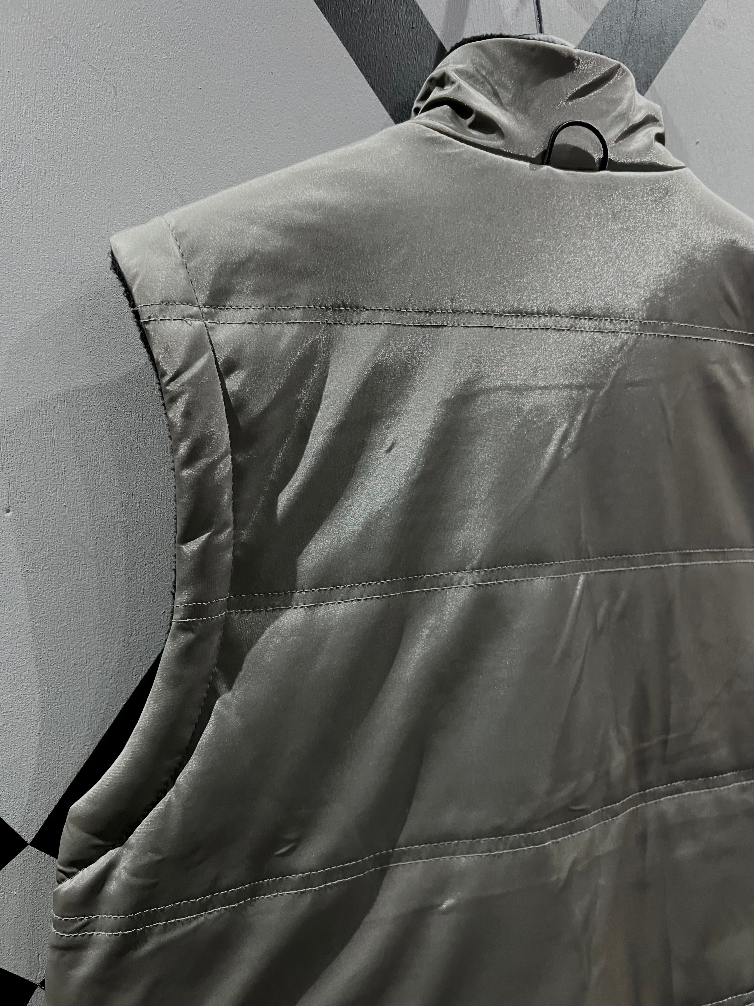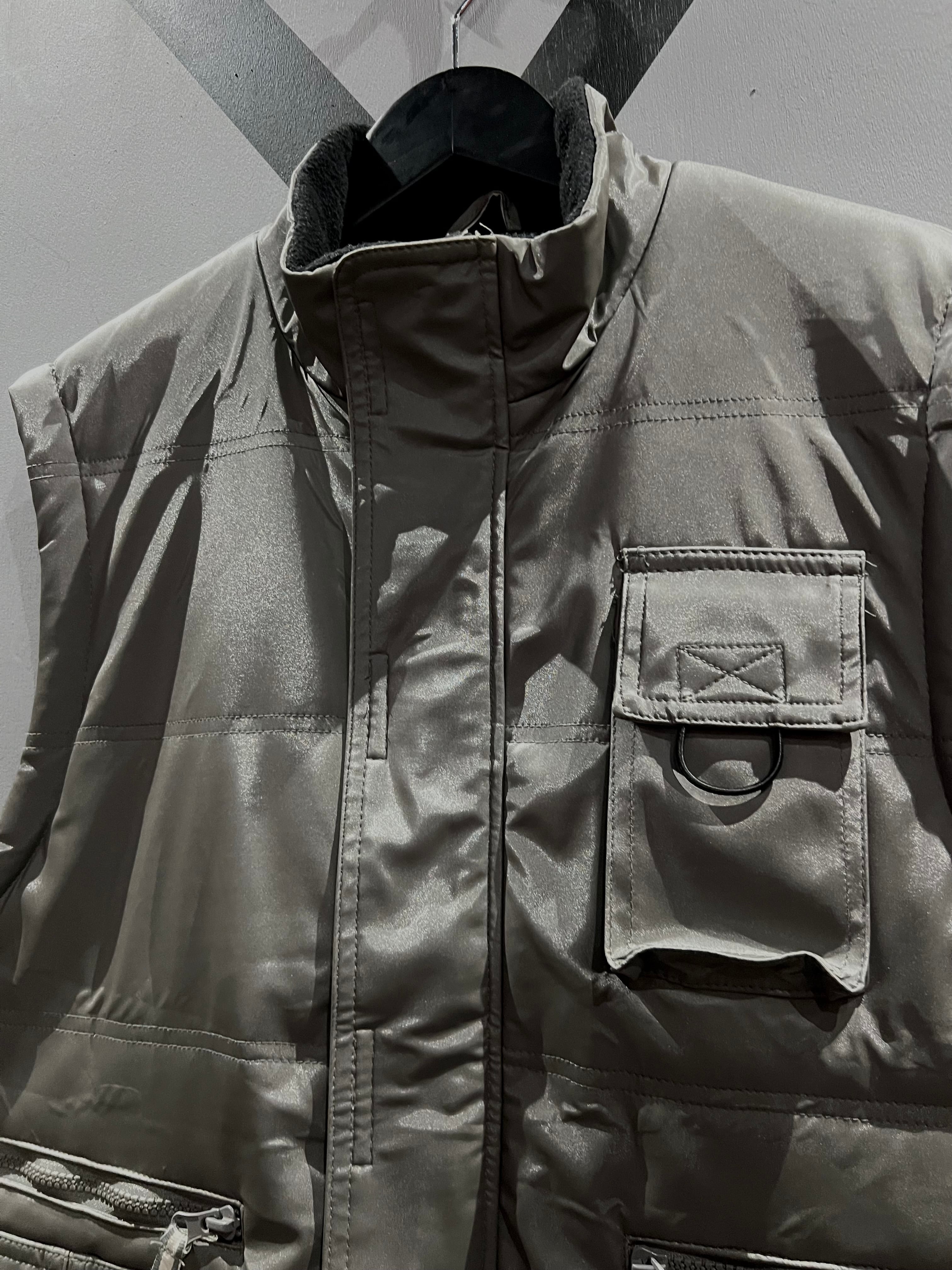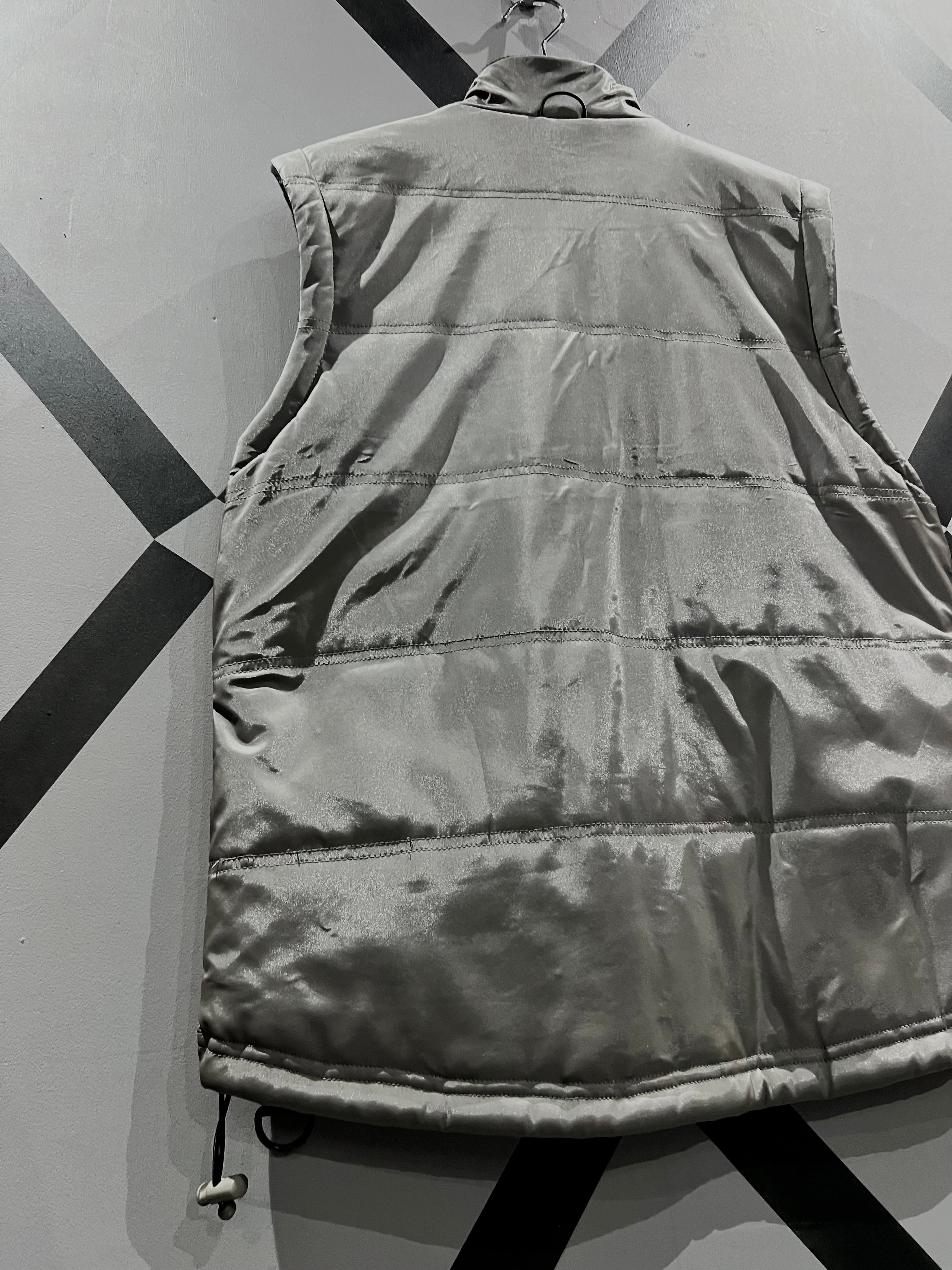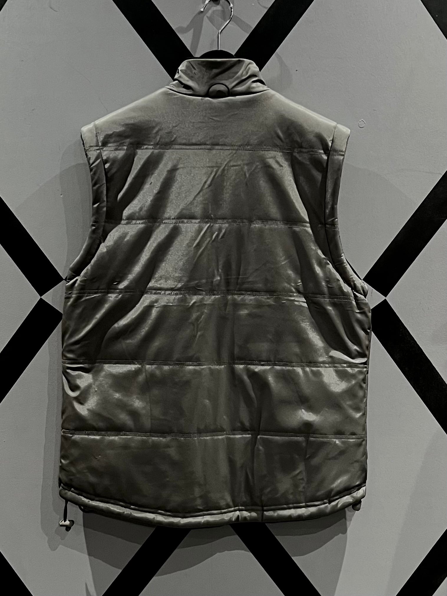 メタリックな光沢のあるポリエステルのボディに、大ぶりのフラップポケット2つと胸ポケット1つ、ジップポケットを2つ施したギア感溢れるベスト。