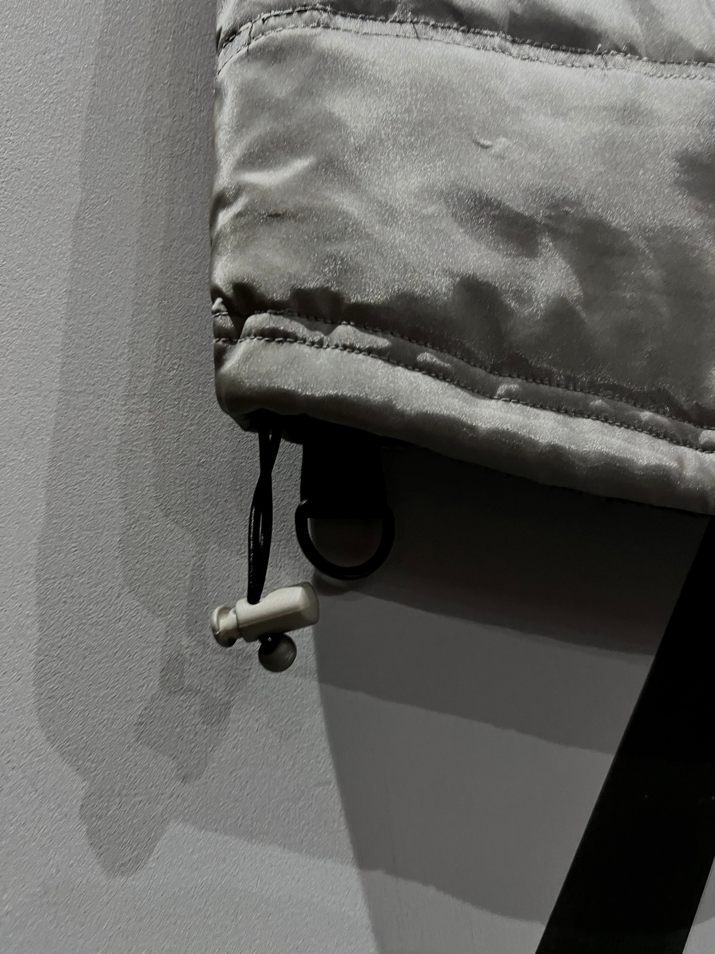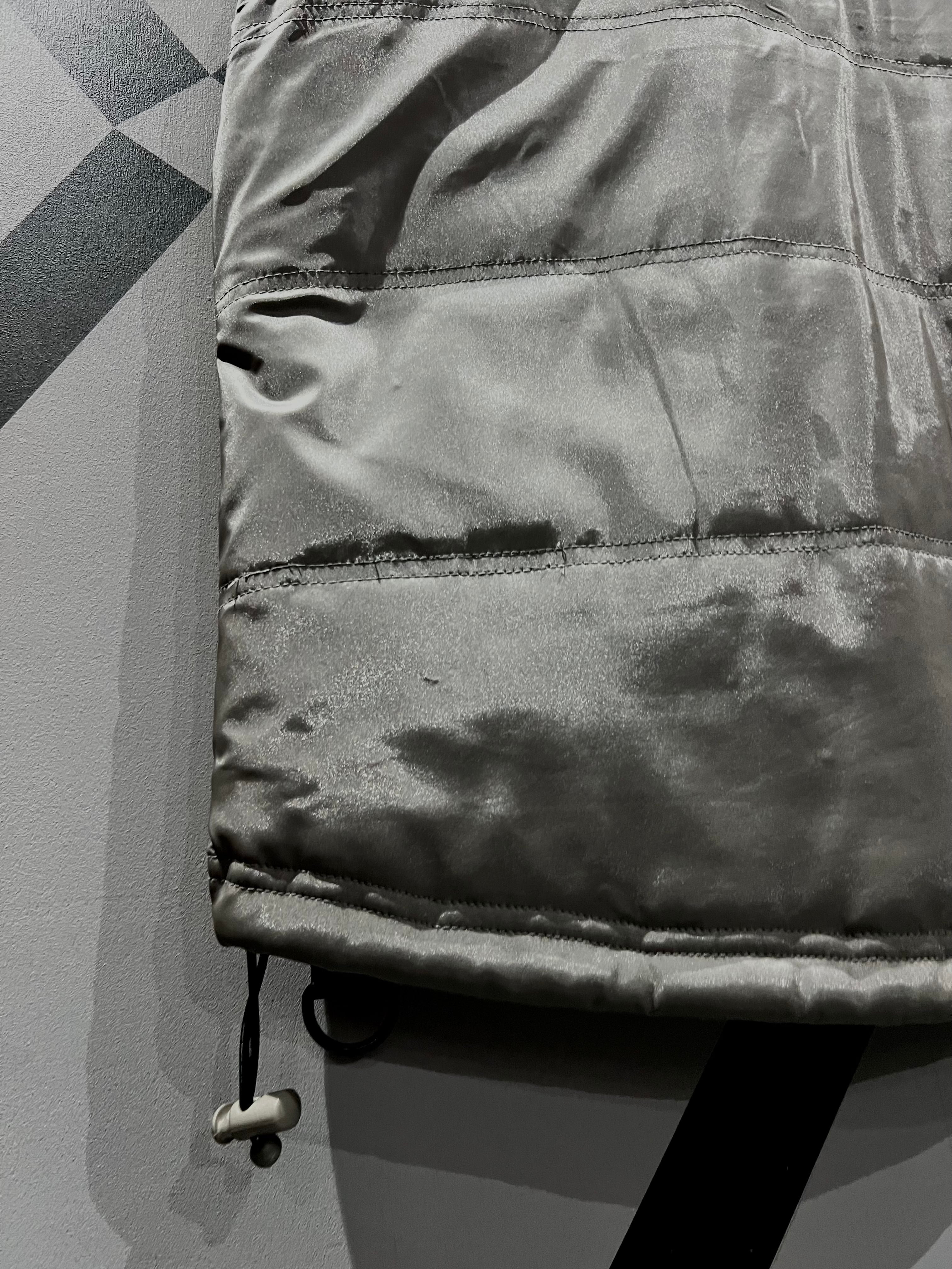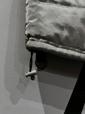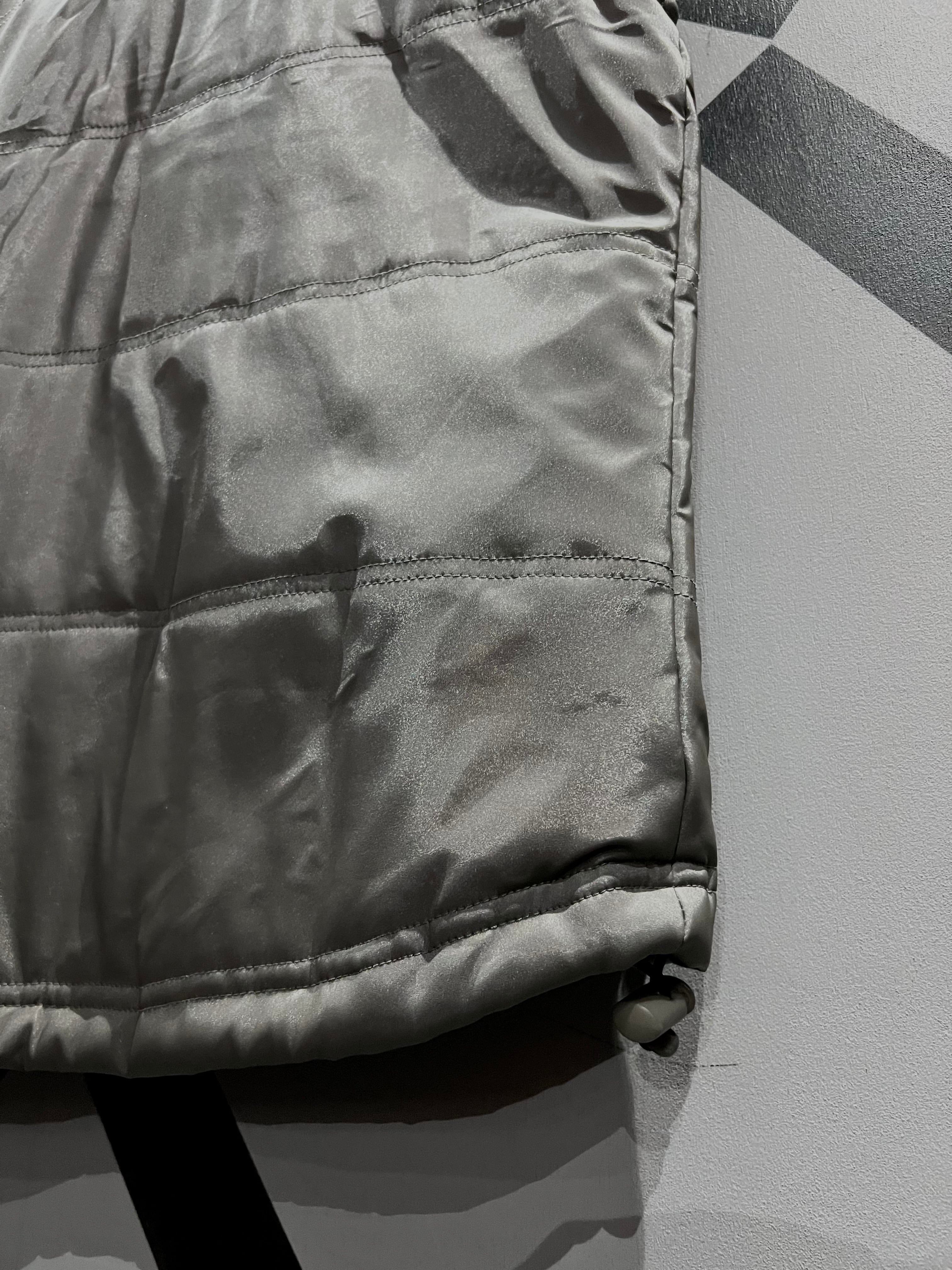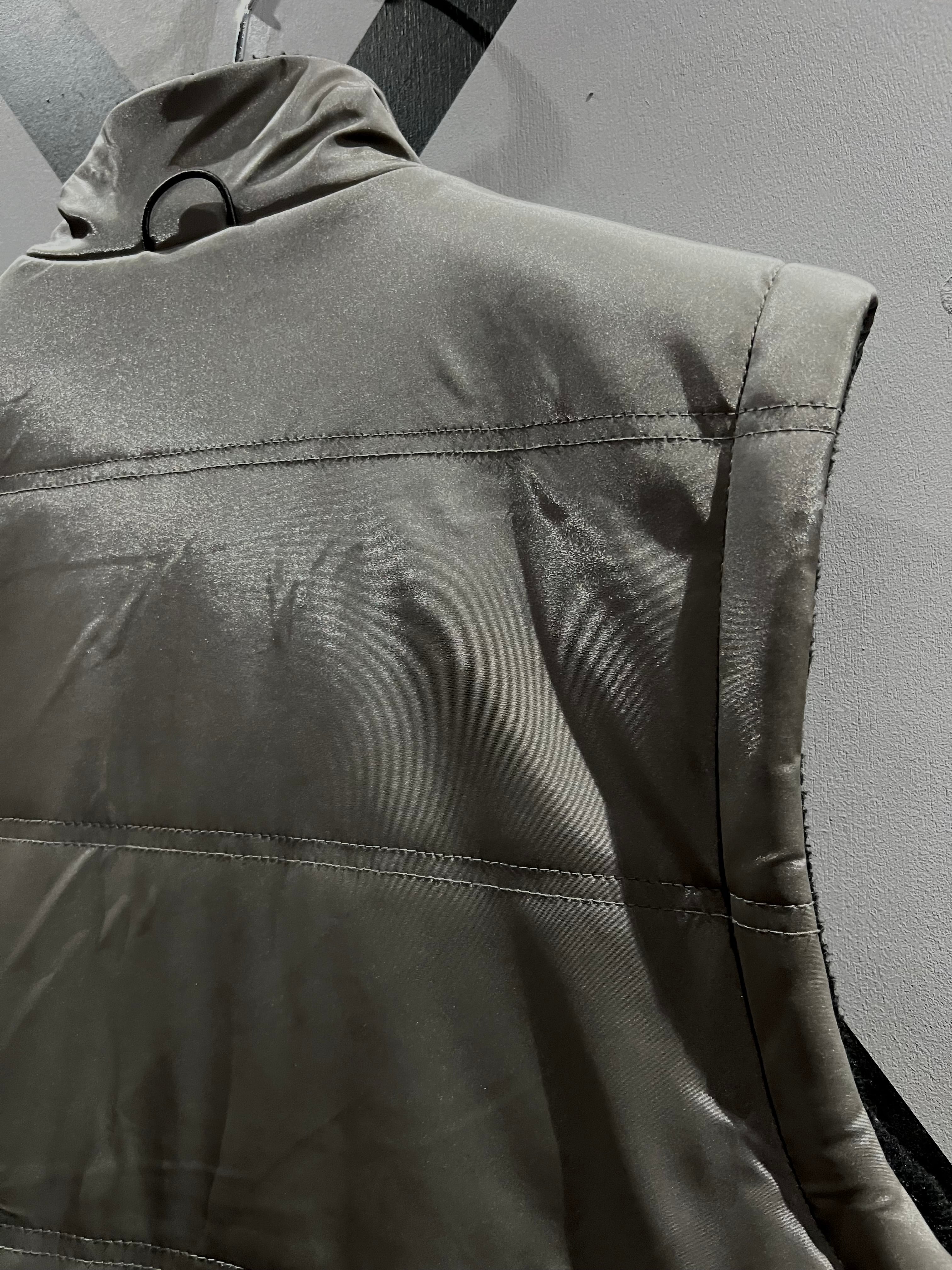 メタリックな光沢のあるポリエステルのボディに、大ぶりのフラップポケット2つと胸ポケット1つ、ジップポケットを2つ施したギア感溢れるベスト。