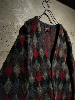 ボディ全体にマルチなカラーリングでアーガイル柄を載せたニットカーディガン。