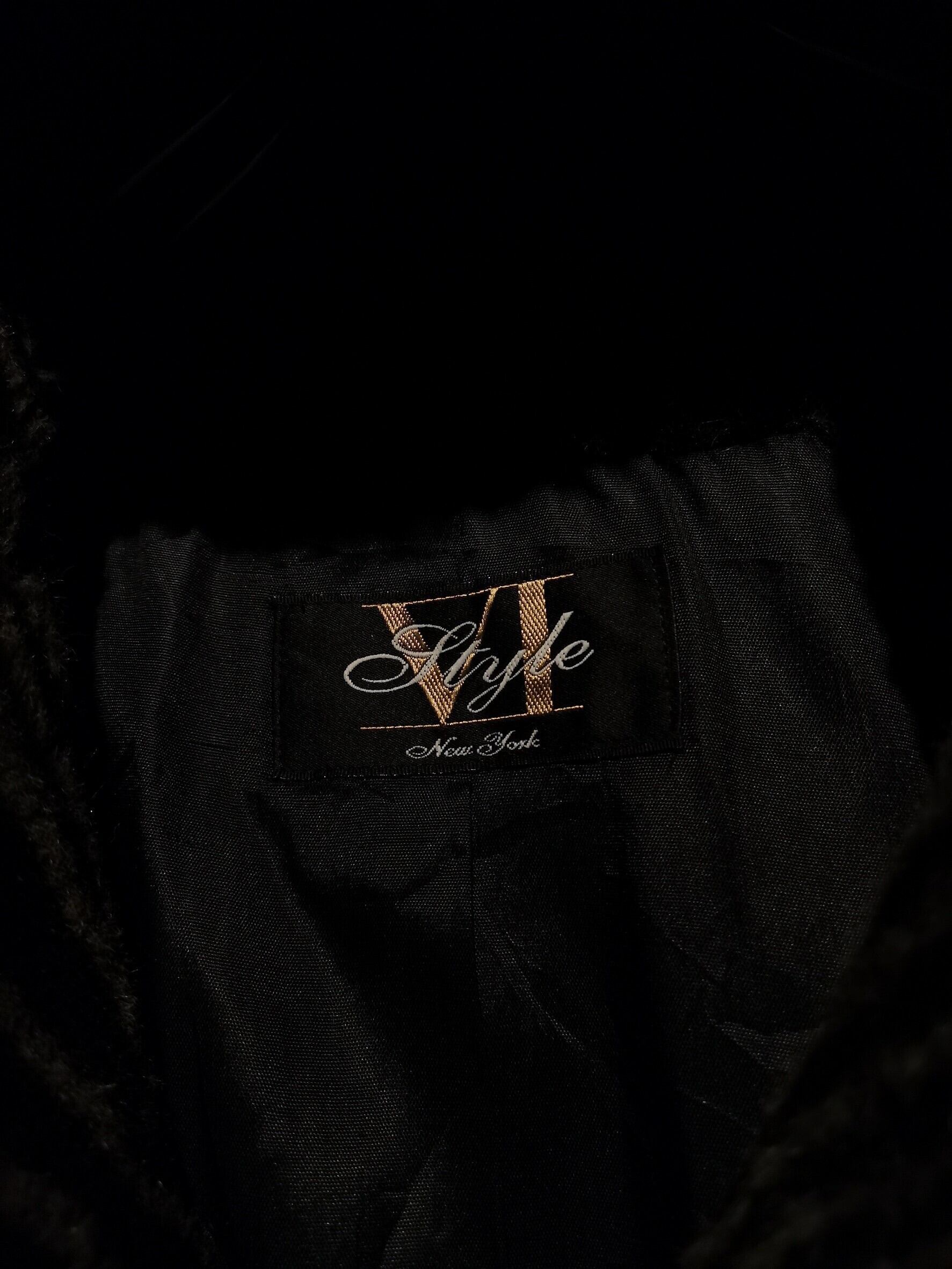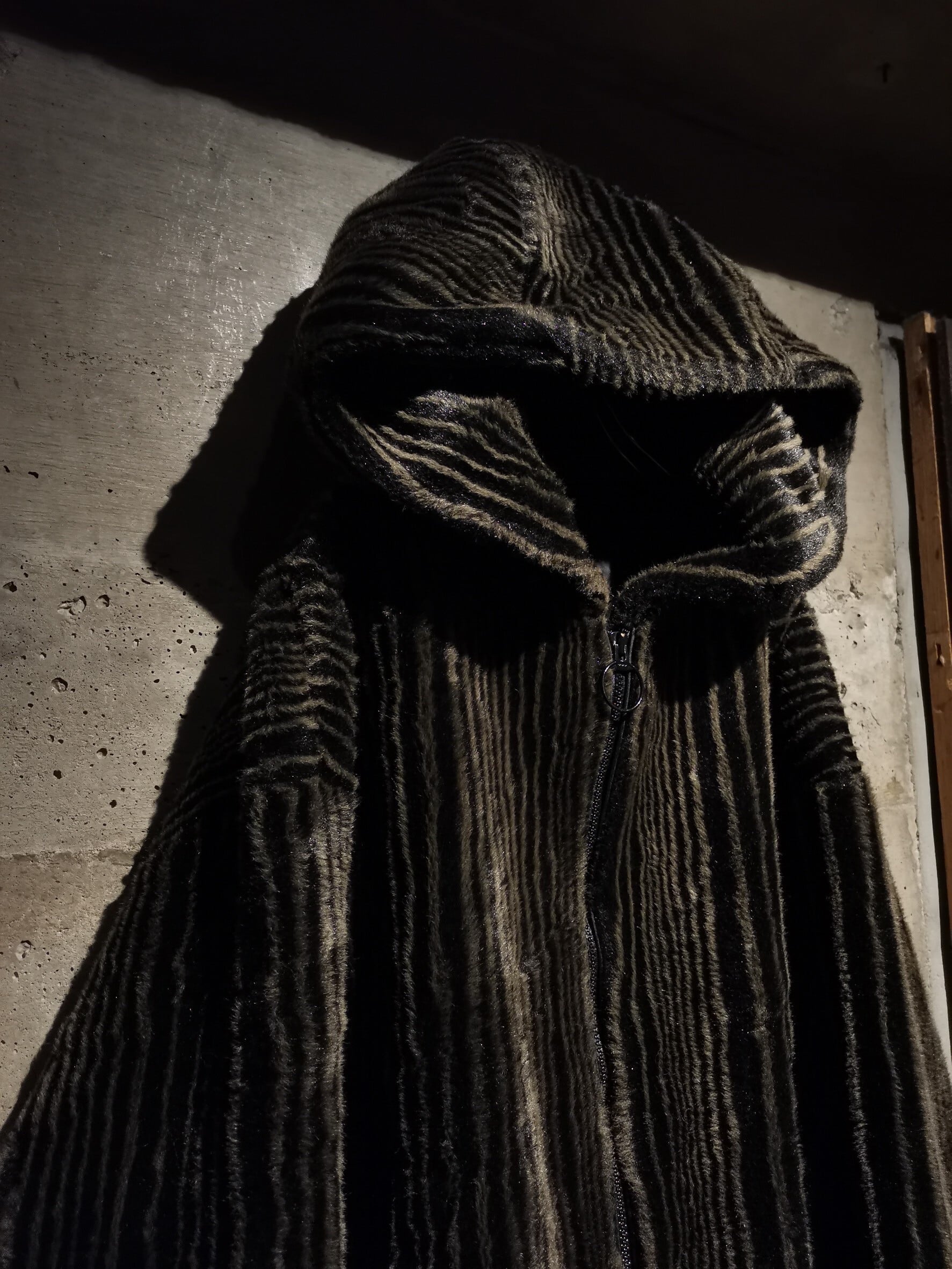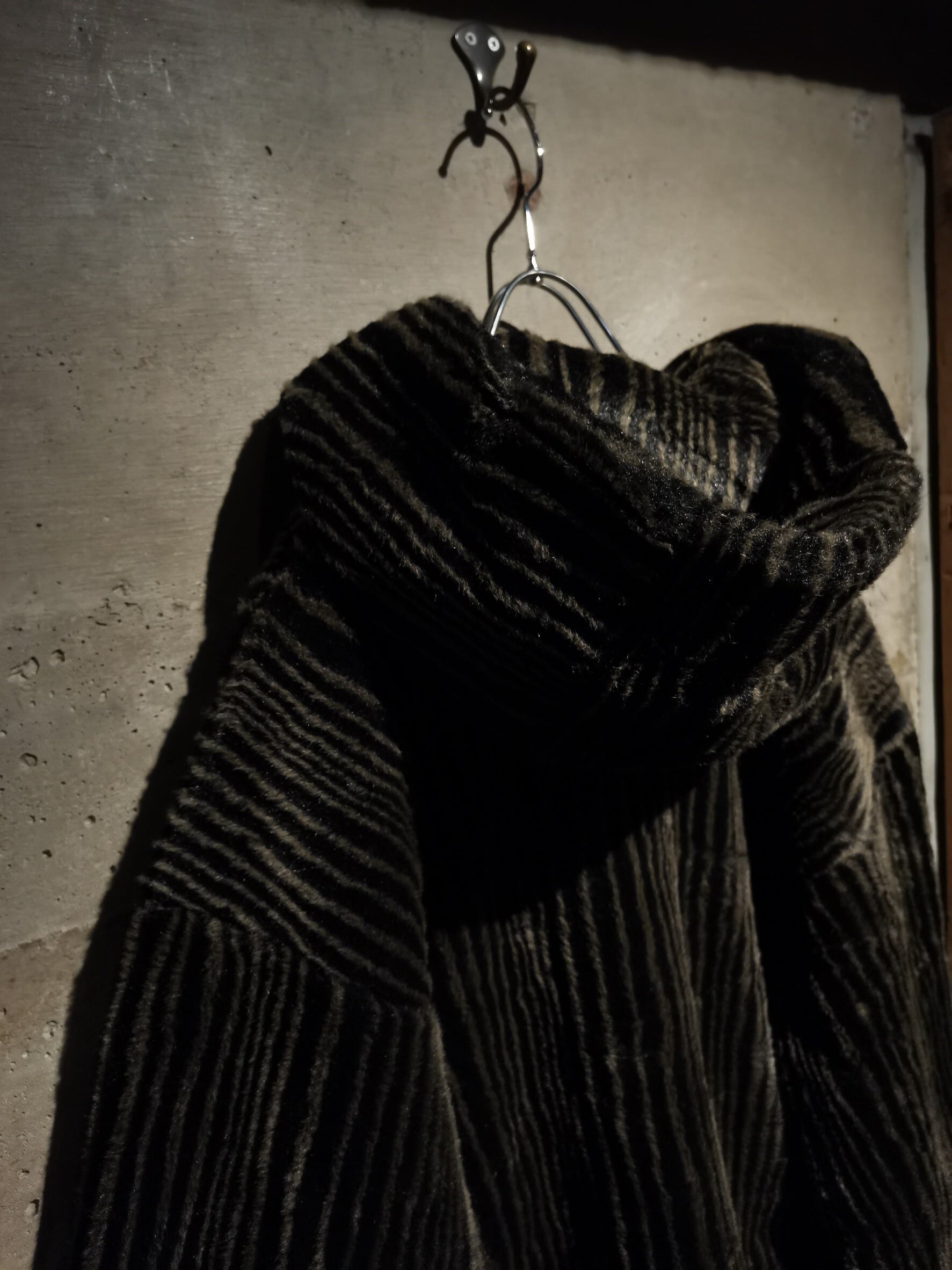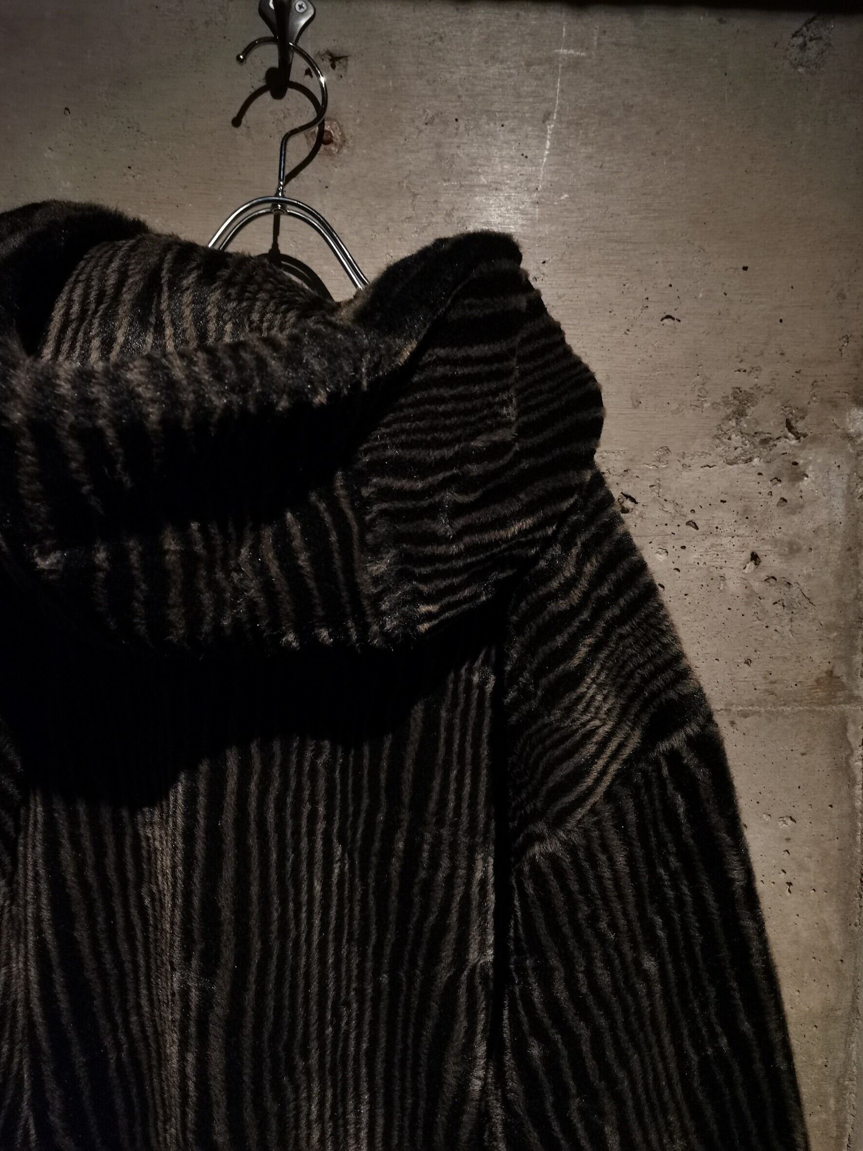 チャコールブラウン×ブラックのカラーリングから成るゼブラ柄をボディ全体に載せた、フェイクファージャケット。