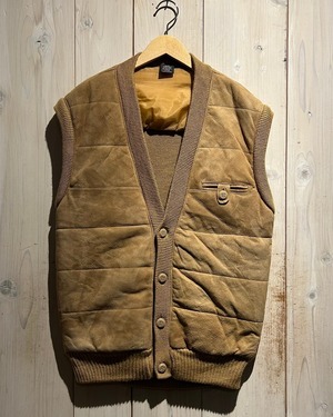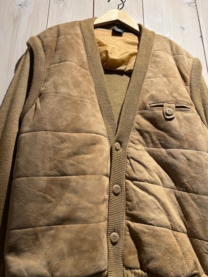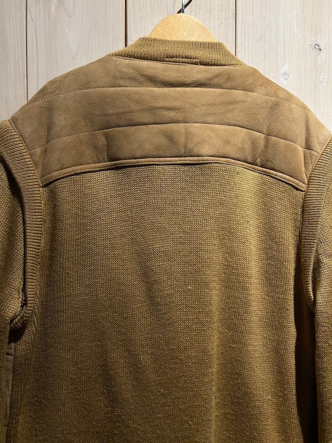前身頃から背面ヨークにかけてベージュのヌバックが施され、そこから微光沢を帯びたトーンの異なるベージュのニット切り替えを施したカーディガン。