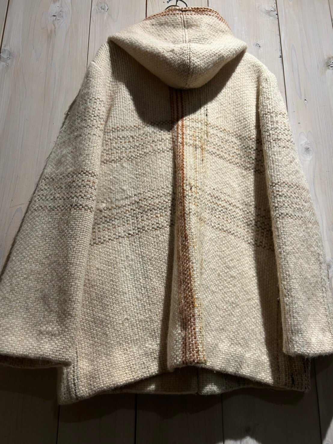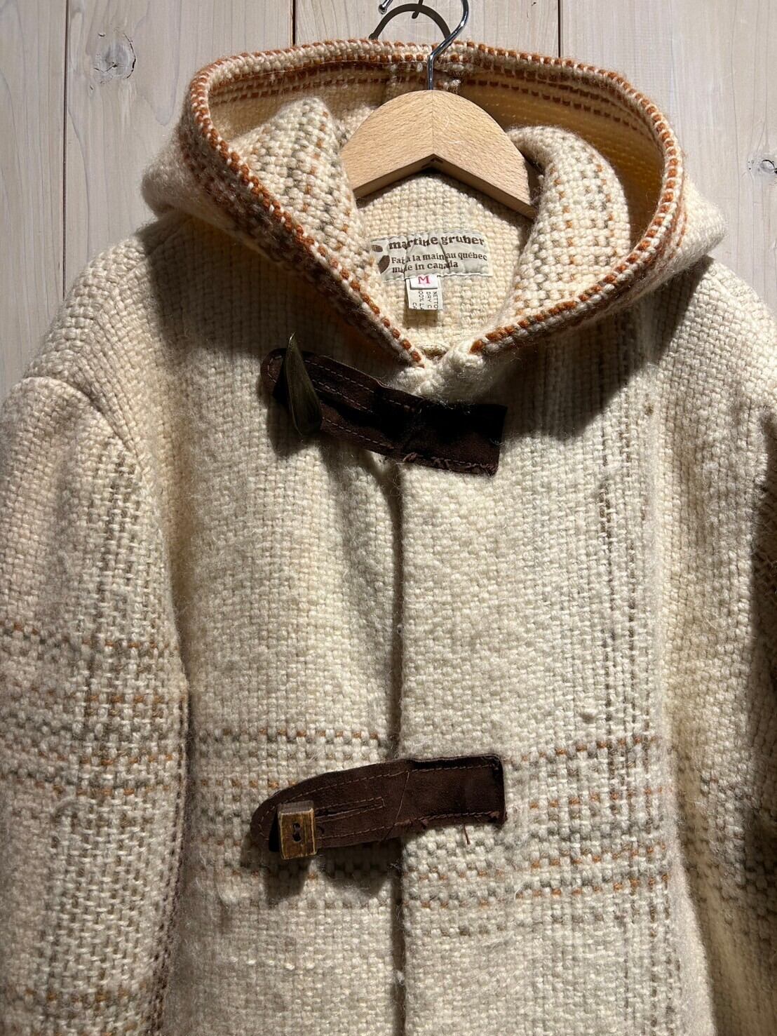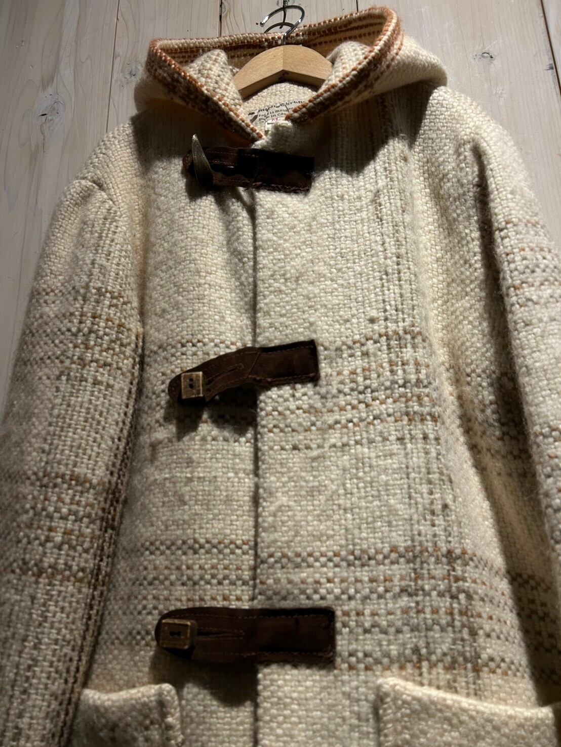 生成りのような、ややベージュがかった色味のボディに、チェック柄を載せたダッフルコート。