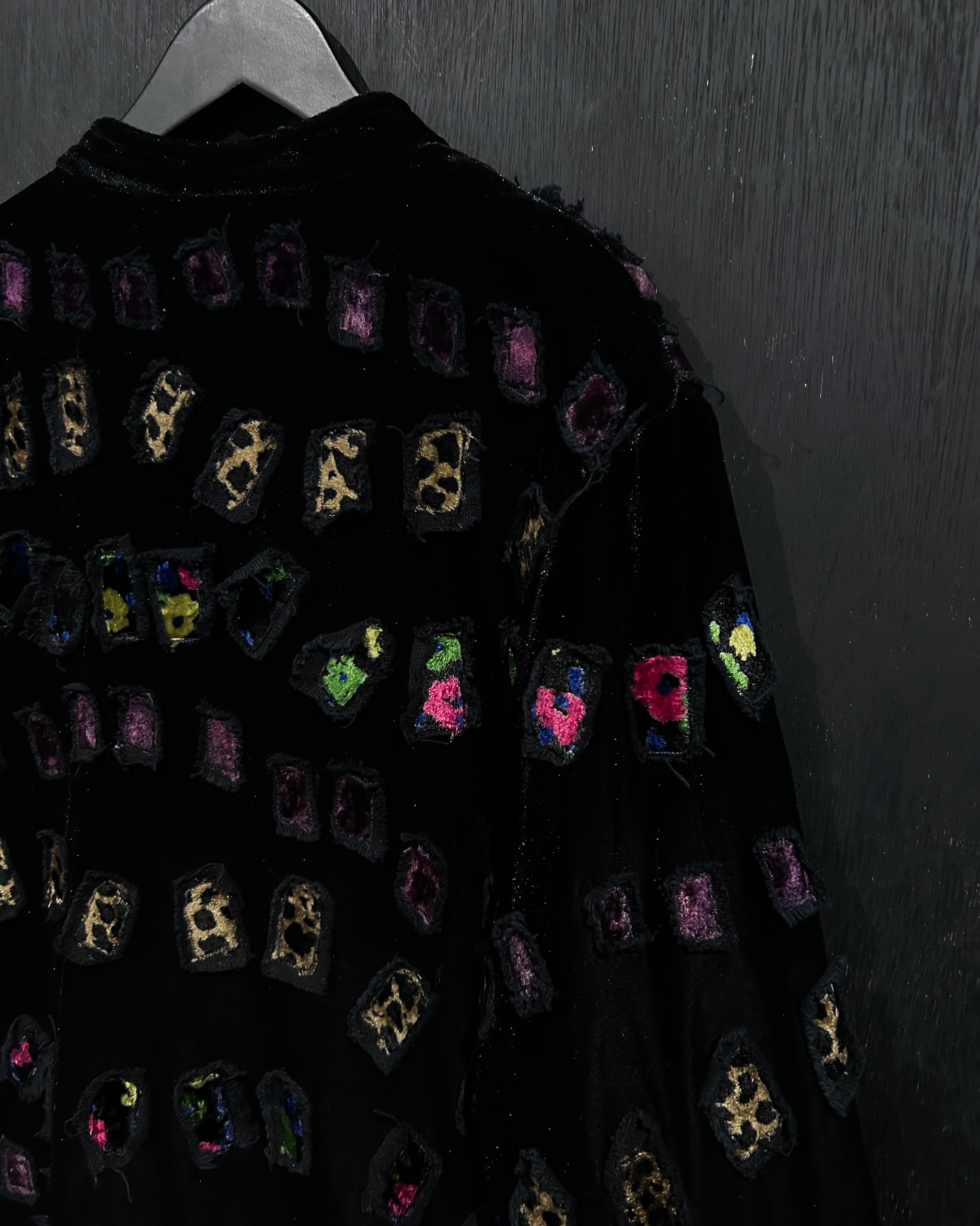 モッチモチ、柔らかく滑らかなベロア素材を用いたシャツジャケット。ボディ全体にはビジューを模ったようなレオパード柄、花柄を施したベロア生地をパッチワーク風にON。同じベロア素材を用いていますが、巧みなデザイン性によってボディに立体感が生まれています。