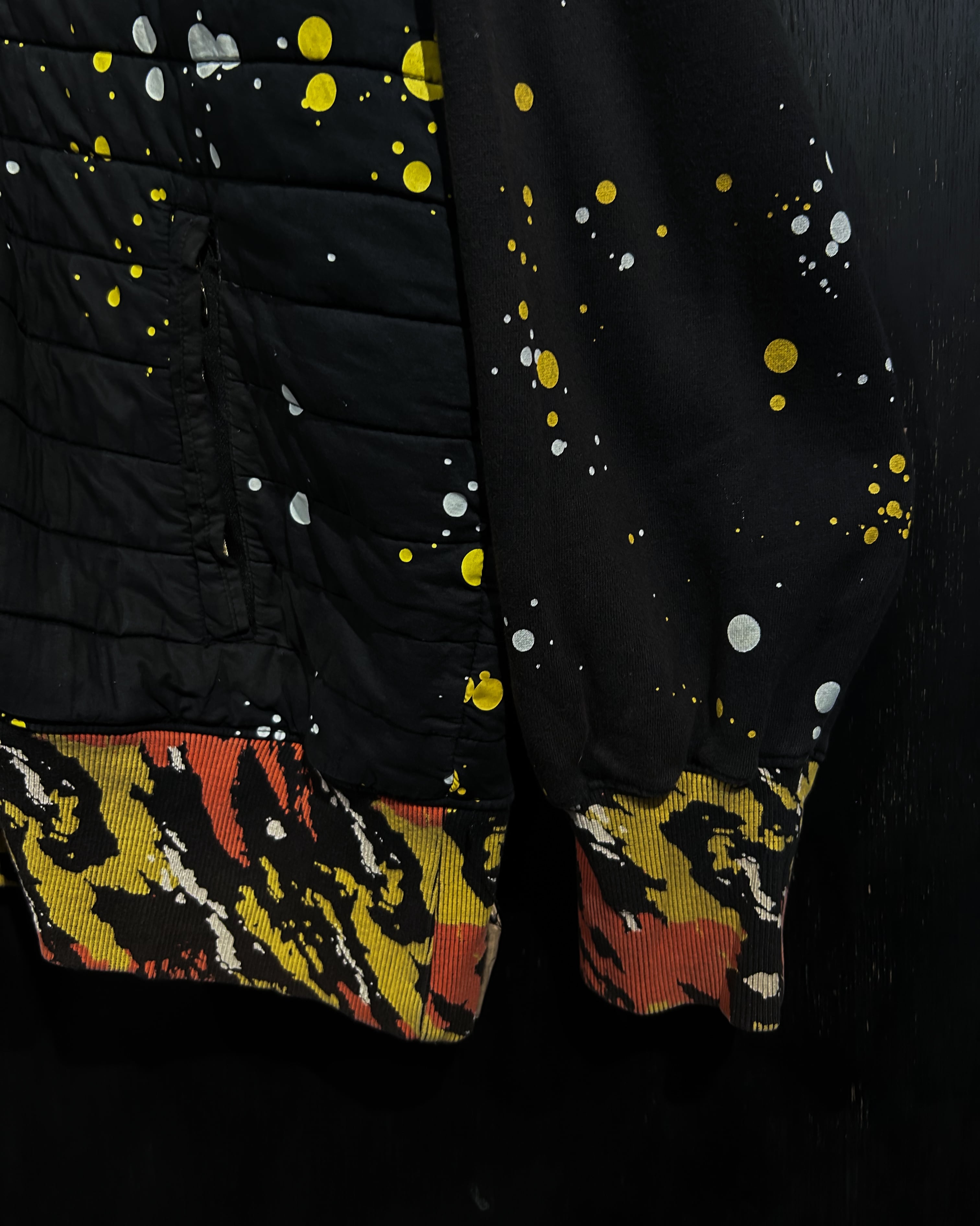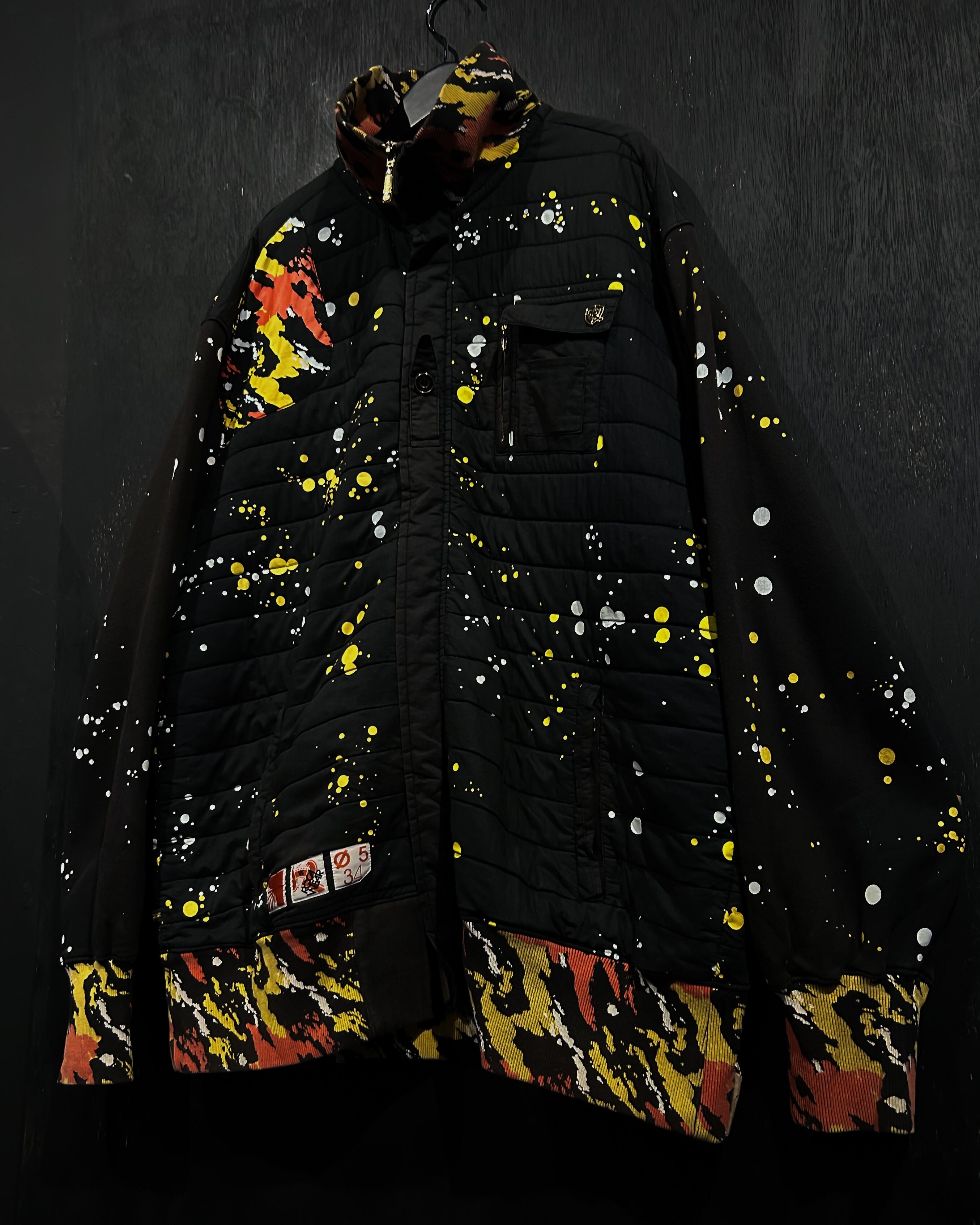 ブラックのナイロンボディに、ペイントでペンキを飛ばしたようなデザインを全面に施し、ネックや裾、袖口にはニットリブの切り替え、背面にはUS vs THEMとUSのストリートブランドらしいデザイン性も持ち合わせた1着。