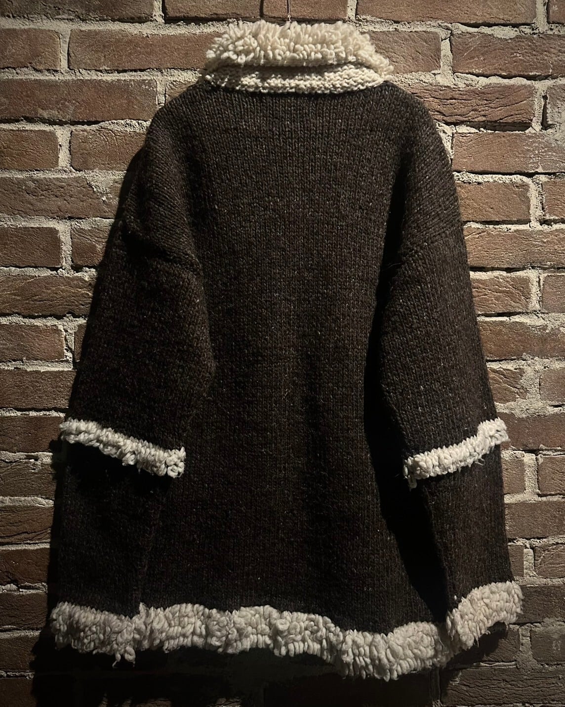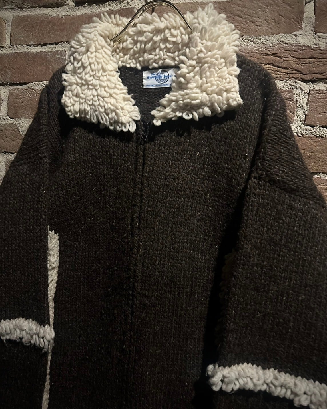 深みのあるブラウンカラーでまとめられた柔らかなハンドニット素材をベースとし、襟や袖、裾にホワイトのボア切り替えを施したジップアップジャケット。