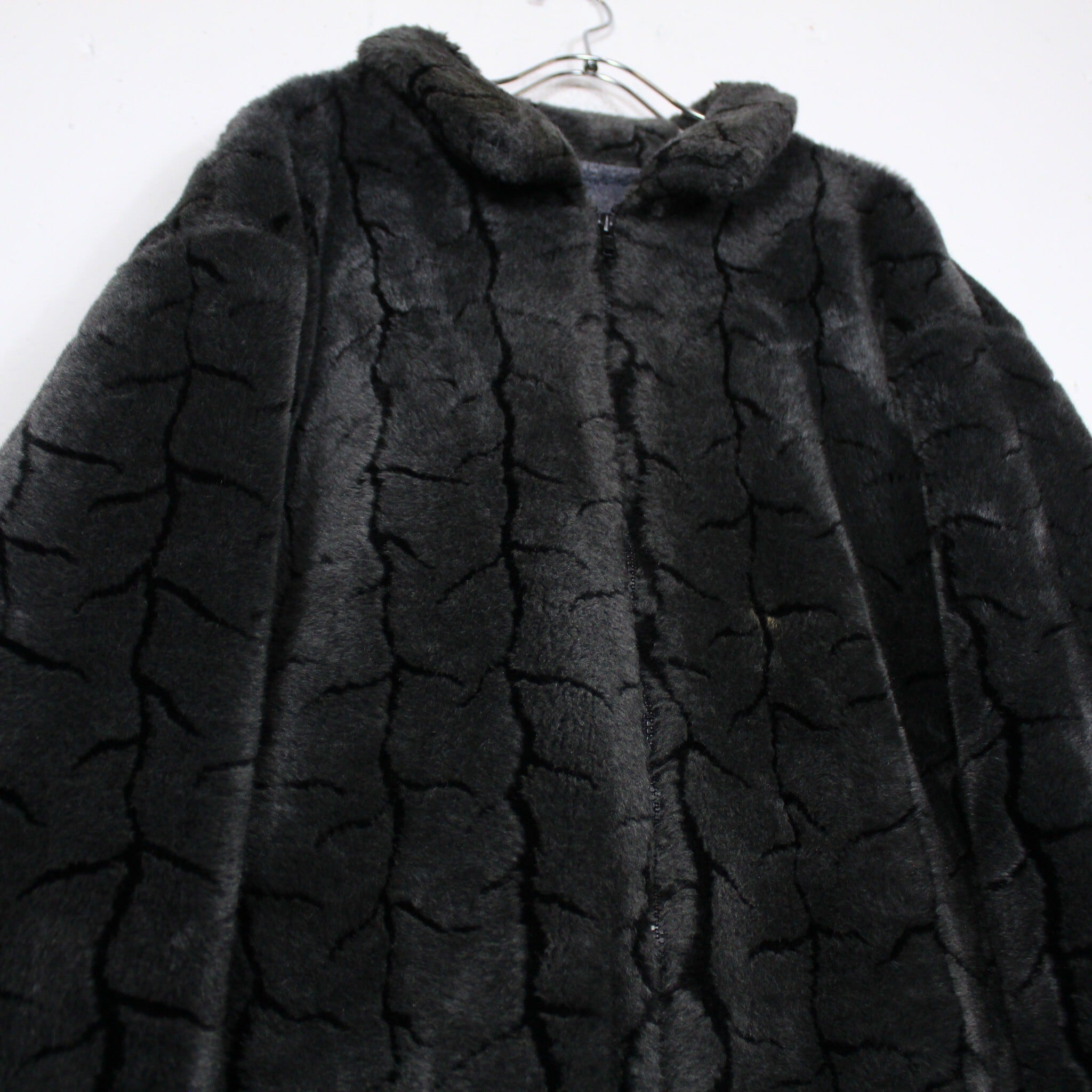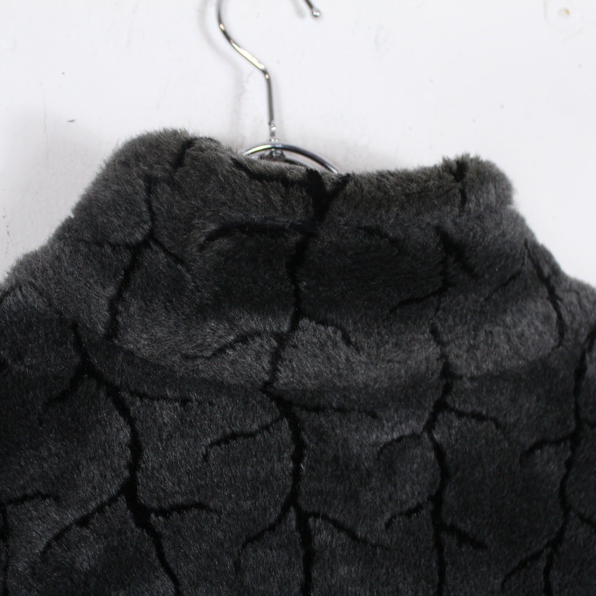柔らかくふんわりとしたグレーのフェイクファーを用いたボディに、ストリートブランドでも用いられるセメント柄調のデザインを全面に載せたジャケット。