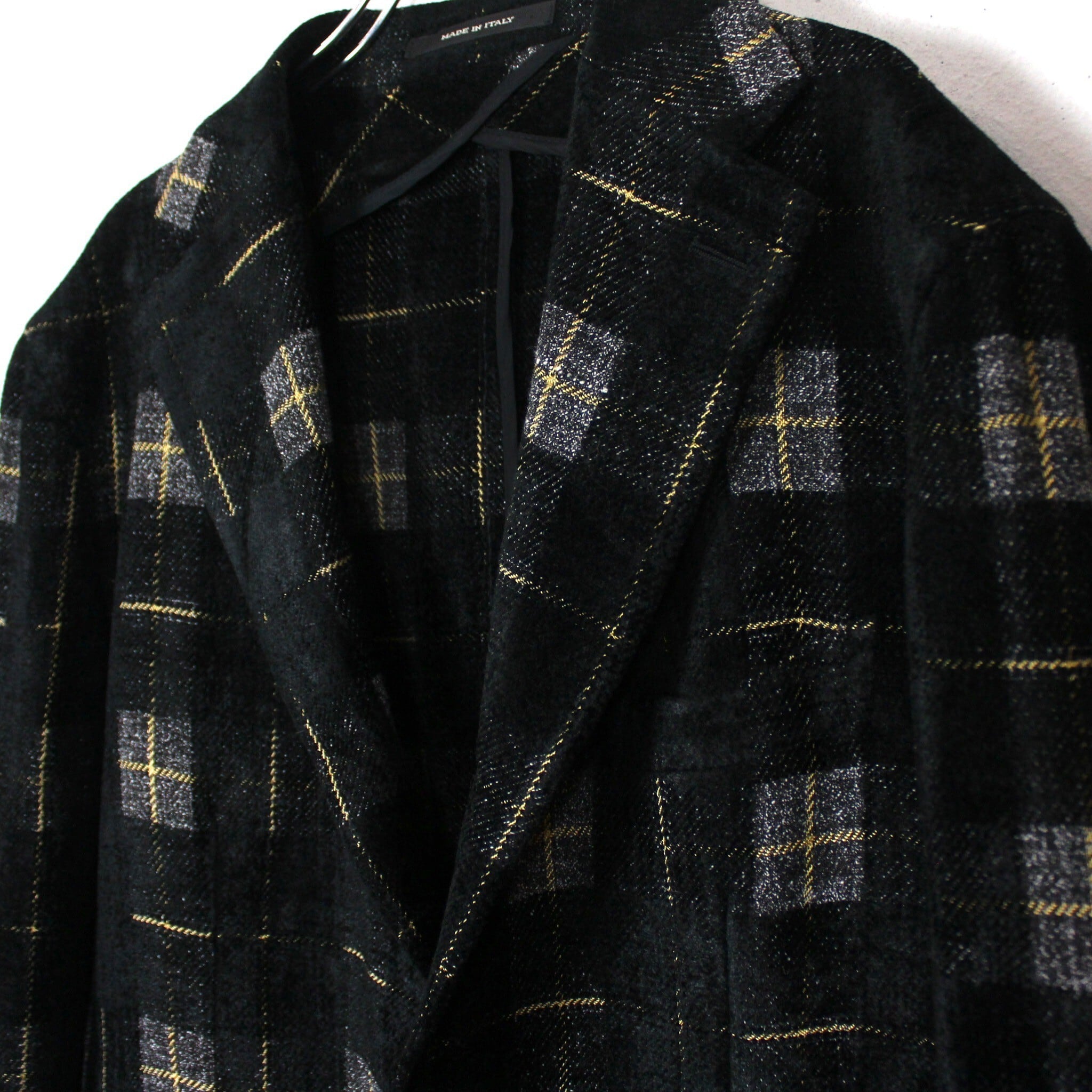 グレー×ゴールド×シェニール織による微光沢を帯びたブラックから成るチェックパターンをボディ全体に載せた稀有なテーラードジャケット。