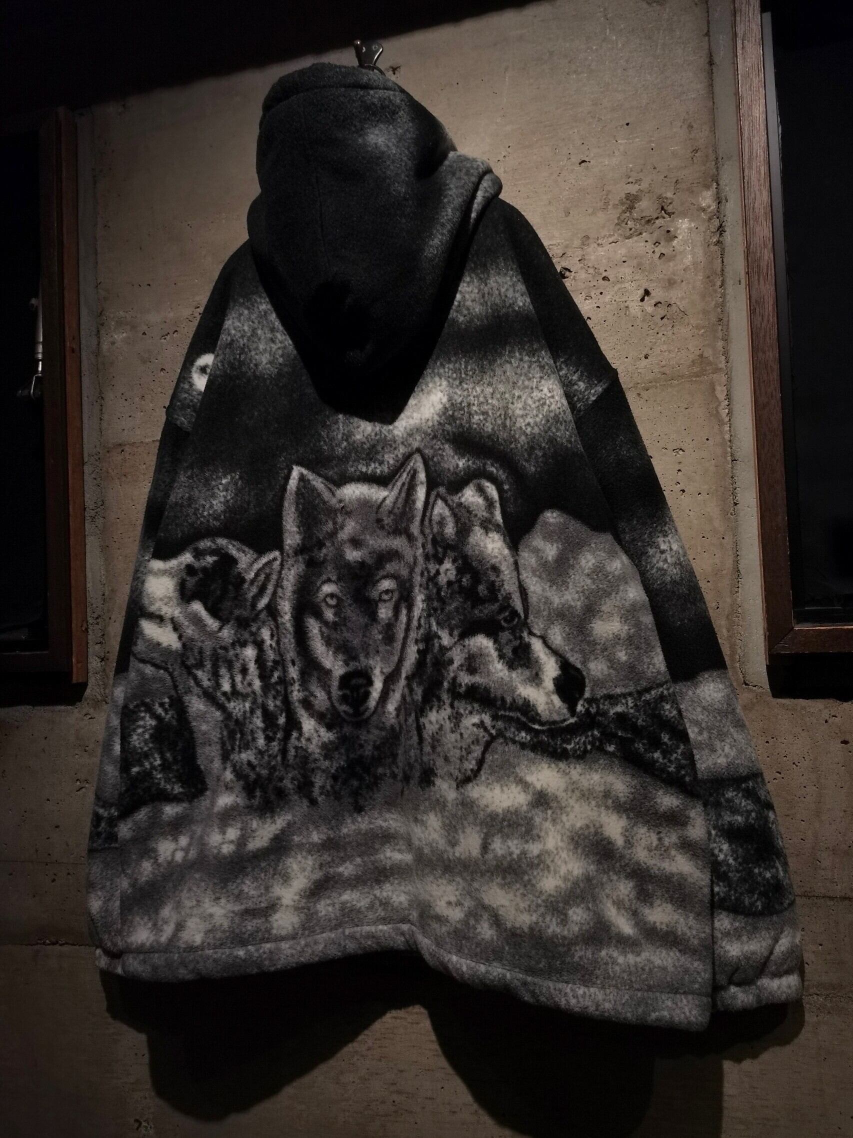 ブラックのボディをベースに、フロントとバックに異なるデザインで大胆にオオカミを載せたフリースのフーディジャケット。