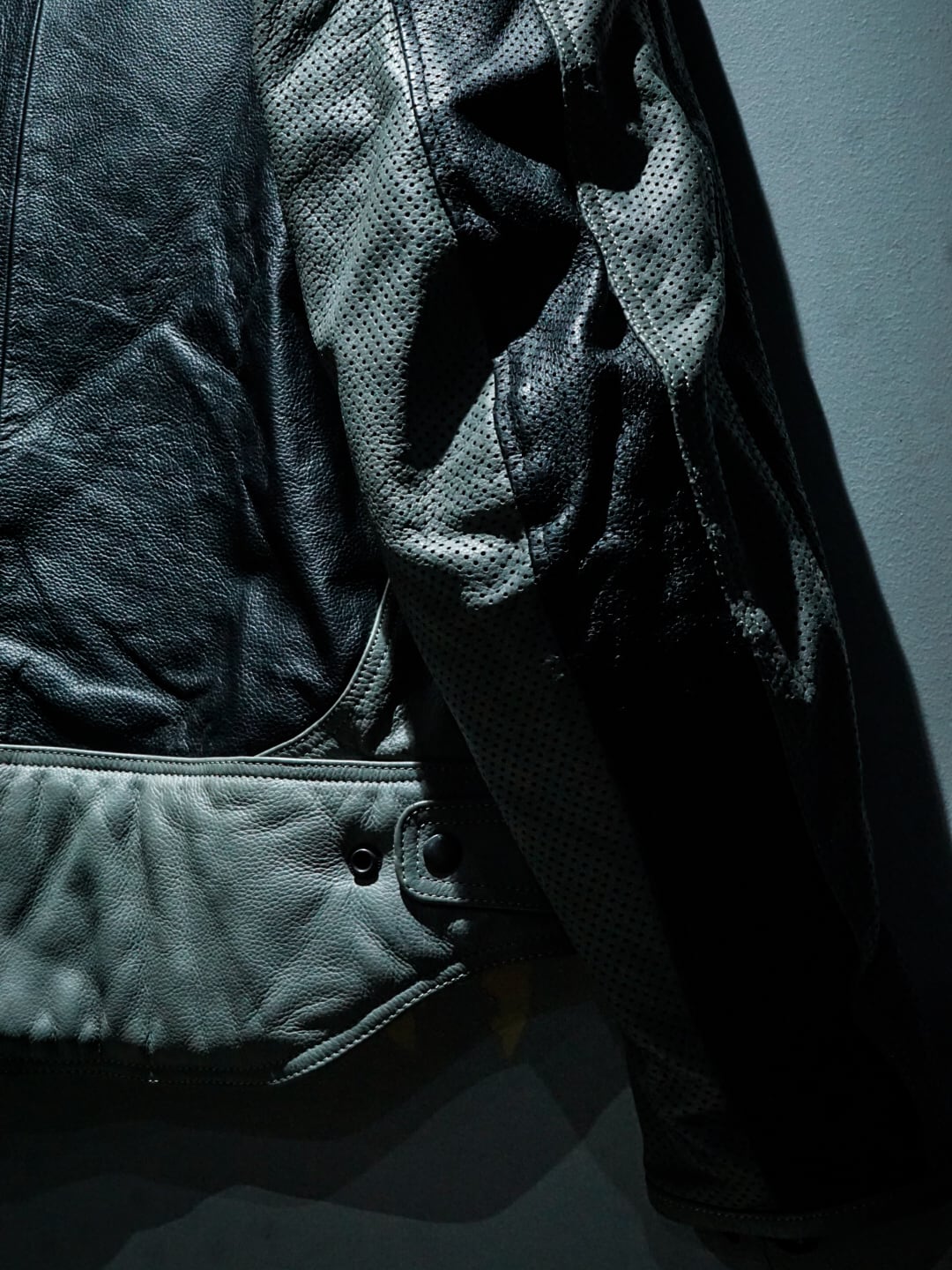 黒×グレーのソリッドなカラーの切り替えに、アーム部分にはパンチングレザーを採用。パンチングを施す事によって、軽量化を実現。更には通気性までもUPさせた非常に機能的かつ、デザイン性にも秀でた仕上がりとなった1着です。