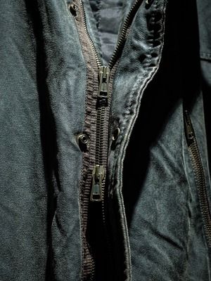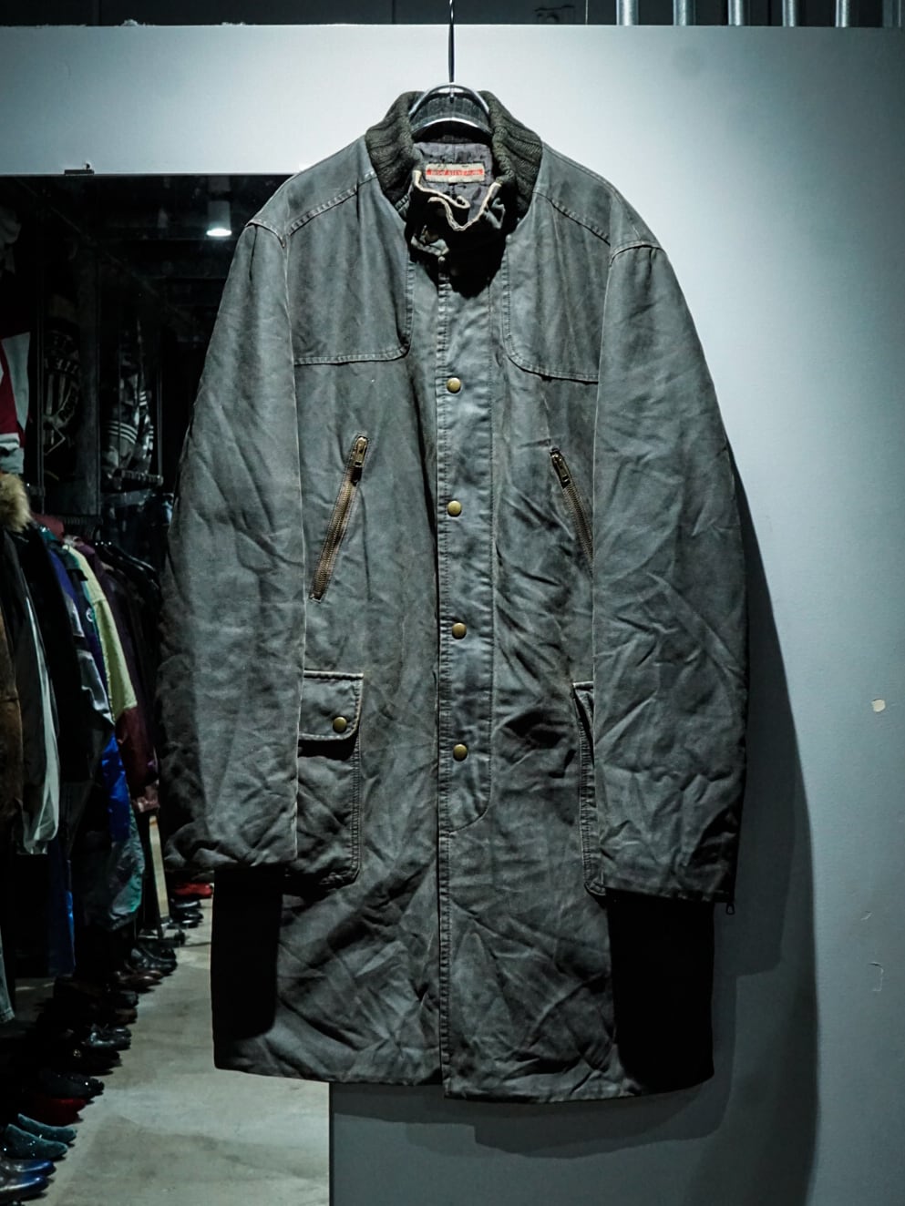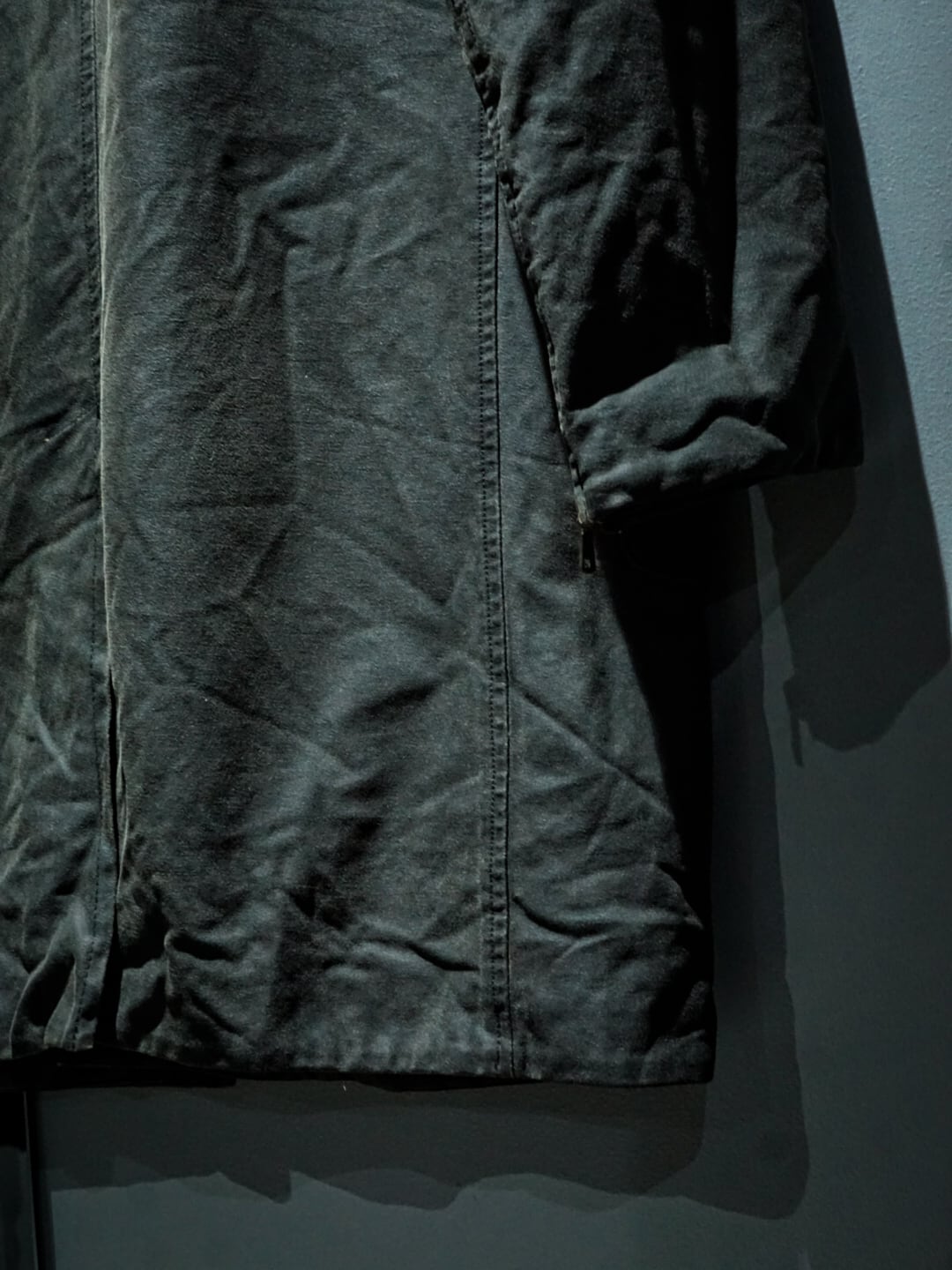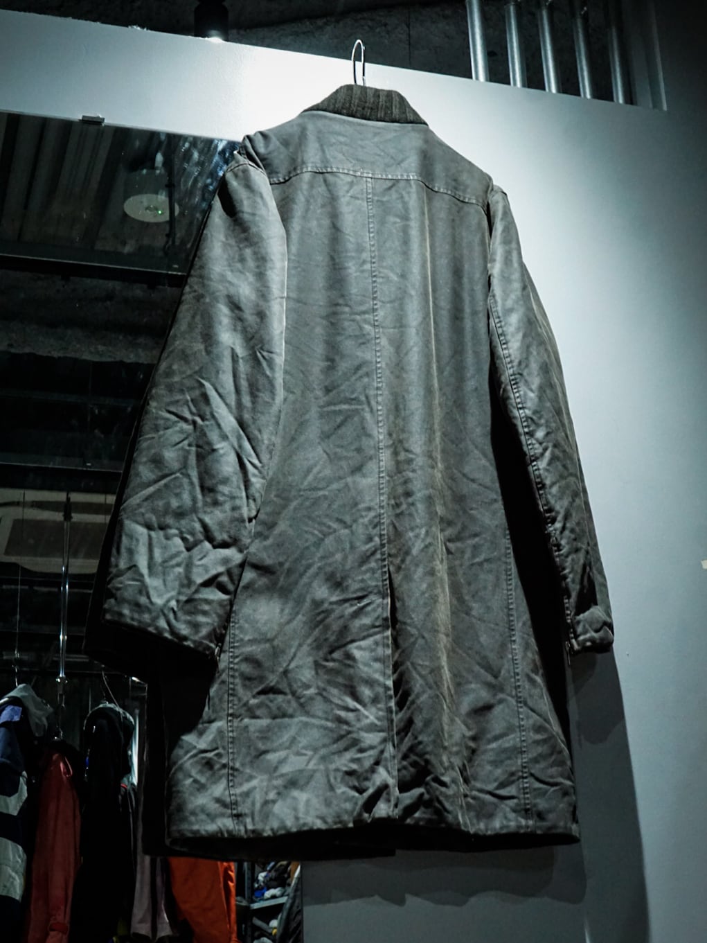 コーティングが施されたコットンツイルボディに、マルチなギミックを搭載。そこに古着特有の経年変化によるフェード感が加わったスペシャルなロングコート。