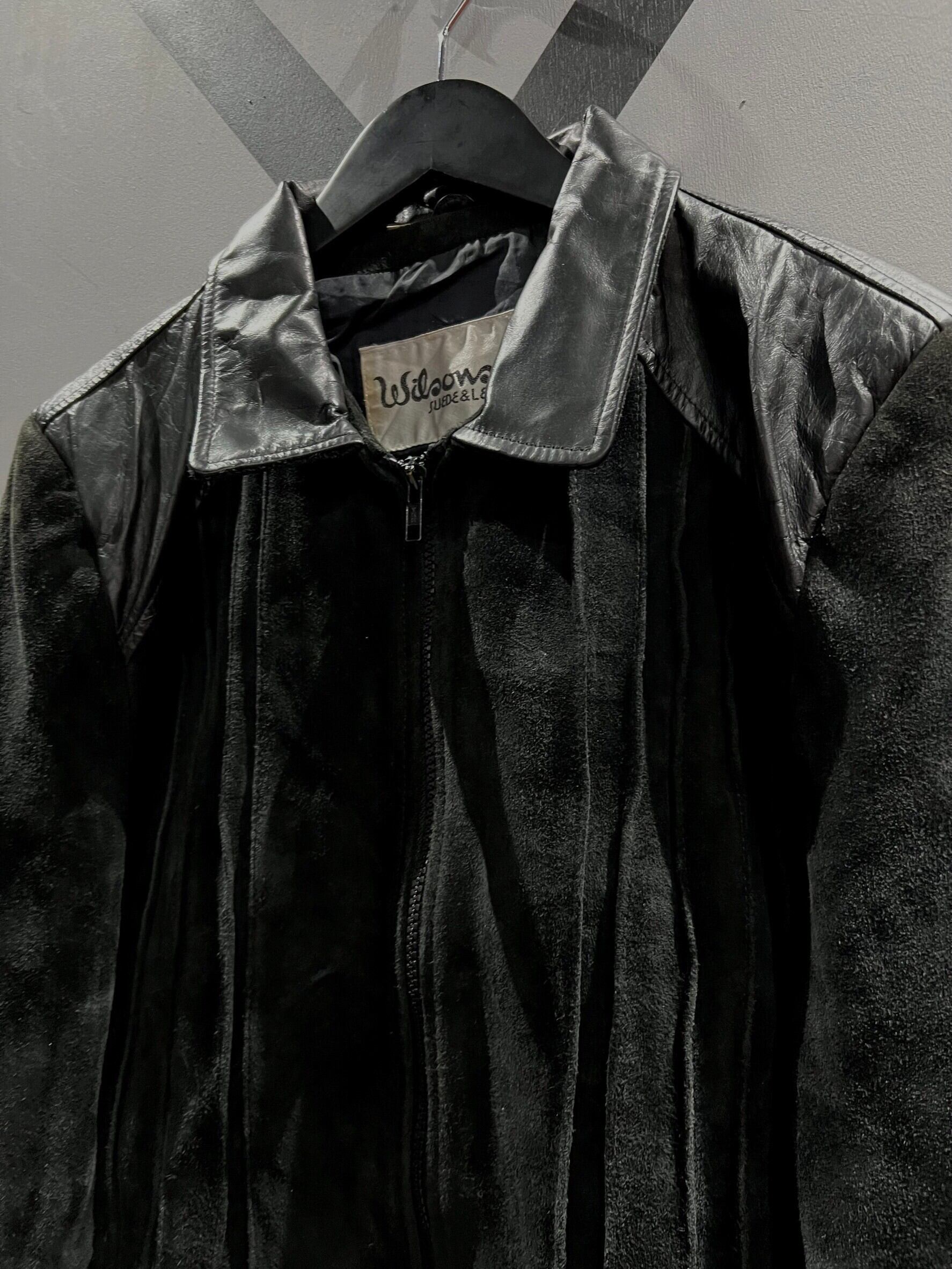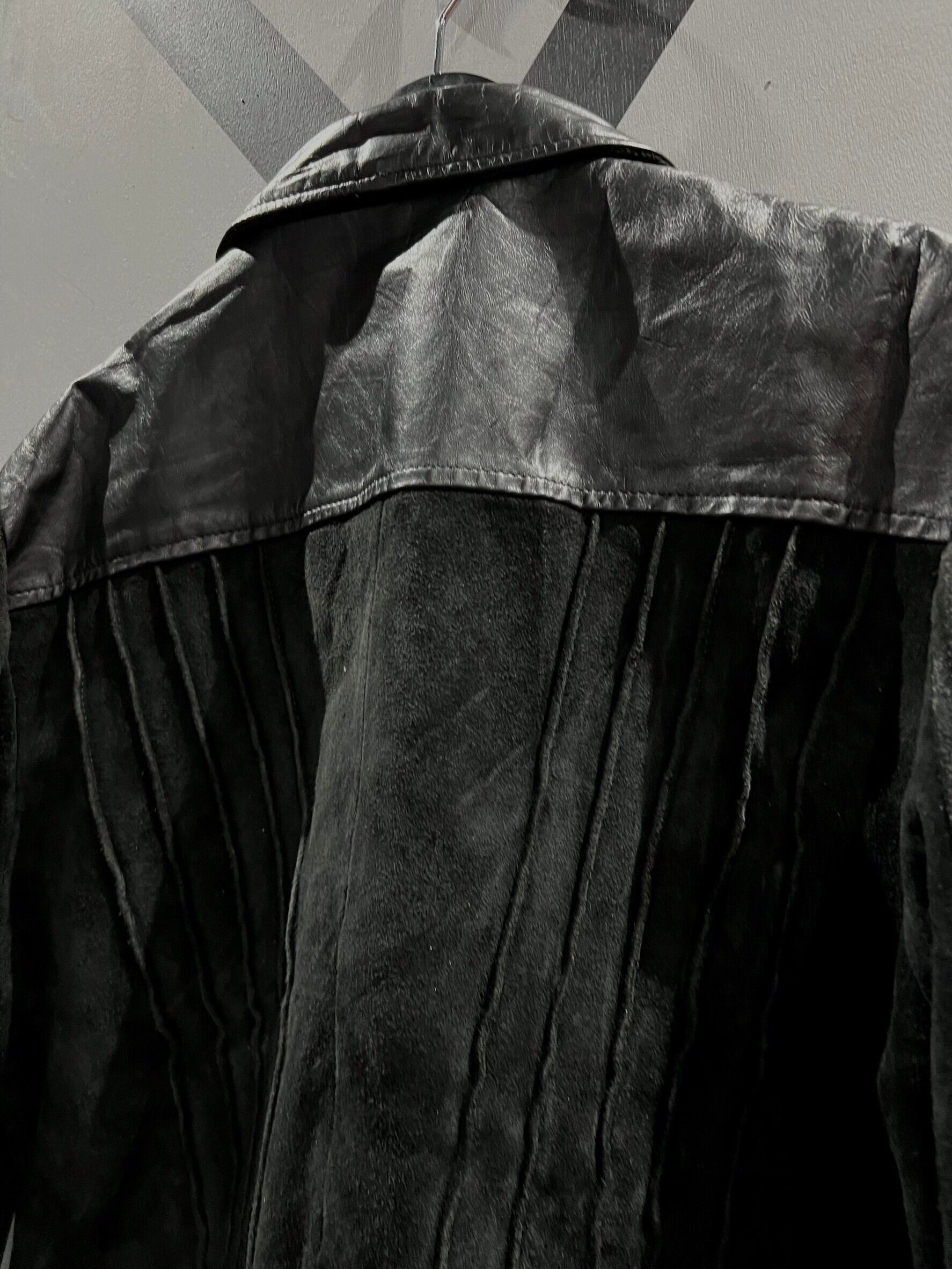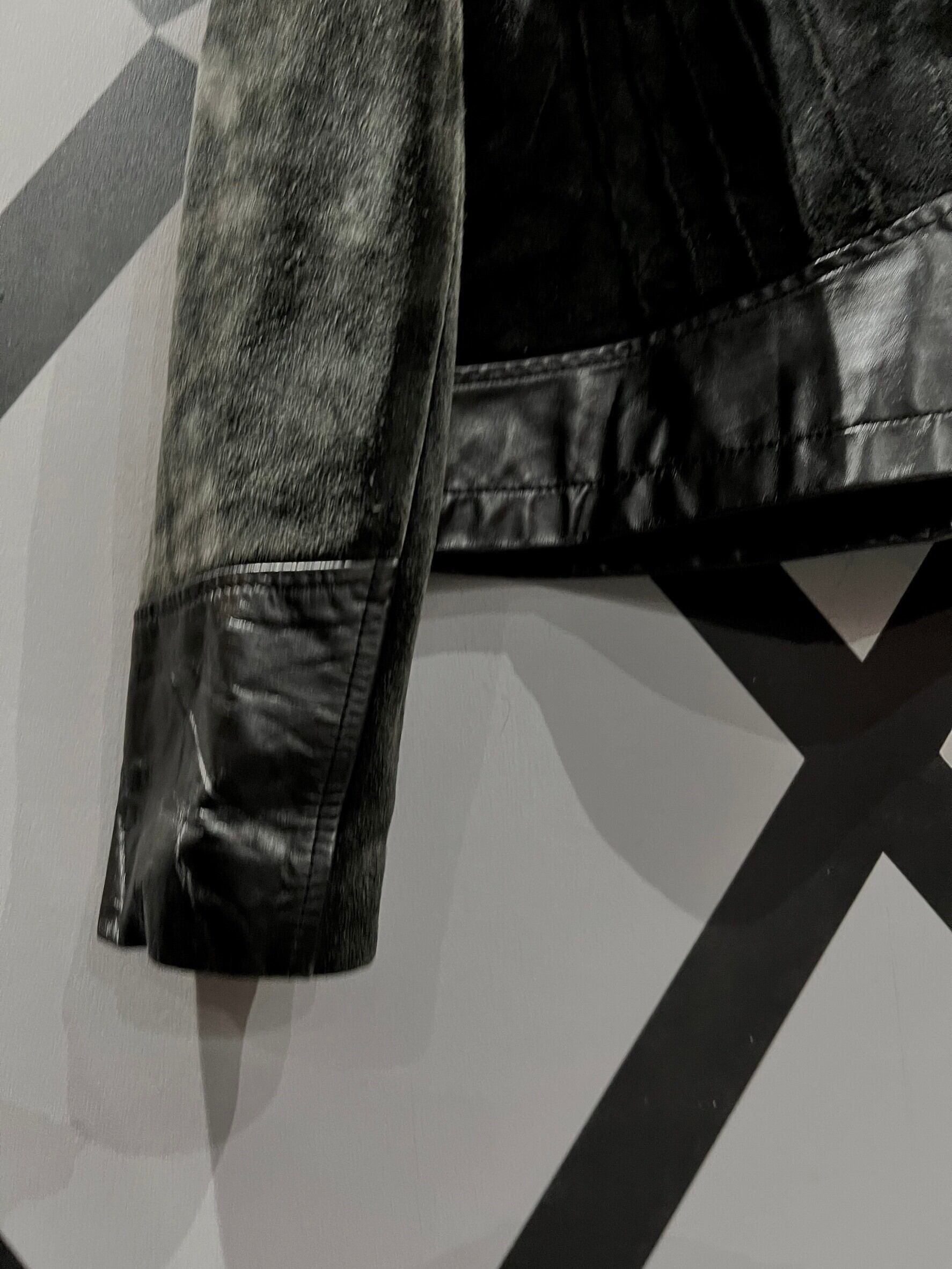 光沢のあるスムースレザー、起毛感のあるスエードレザーを贅沢に切り替えたジップアップレザージャケット。