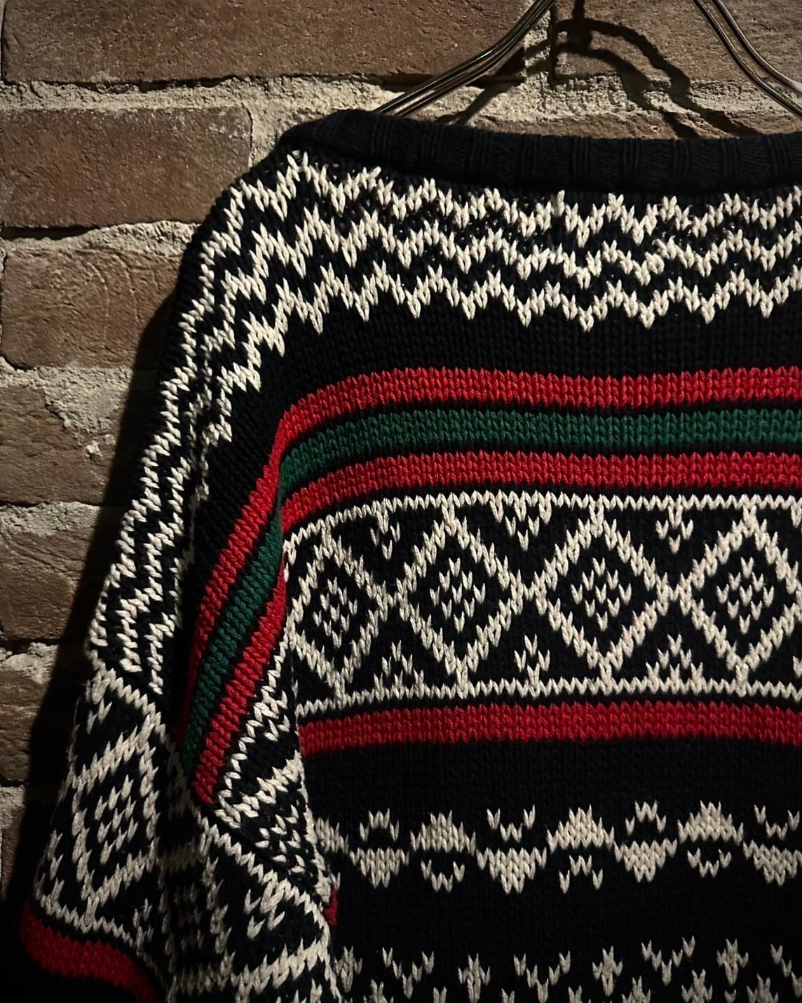 美しいモノトーンのノルディック柄に赤と緑のビビットなカラーをボーダー状に差し込んだ逸品。