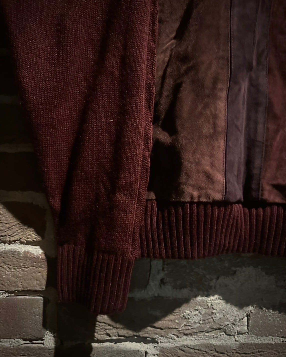 濃淡の異なるボルドーカラーのレザーとニットの質感の違いによってコントラストが生まれ、同系色の仕上がりながらも奥行きのあるルックスに。